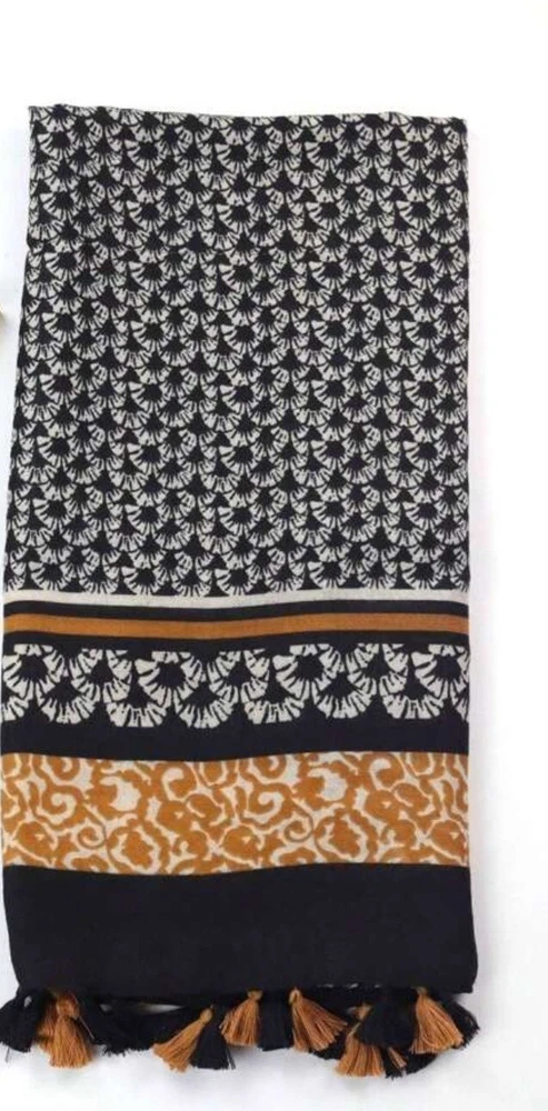 Elevate your accessory game with the Tassel Scarf's Tatum Patterned Leaf Border, a versatile addition to any ensemble. Ideal for all seasons, this scarf serves as a stylish neck warmer or a chic shawl wrap, providing both warmth and a touch of elegance. The geometric pattern in black, white, and goldish yellow hues offers a vibrant complement to a multitude of outfits, making it a must-have for your wardrobe. Crafted from 100% polyester, this scarf is easy to care for with a gentle wash in cold water. Its multifunctional design and tasseled accents add a trendy edge to the piece, ensuring you stay on top of the fashion curve regardless of the weather. Whether you're shielding your shoulders from the sun or adding a layer of comfort to a chilly evening out, this scarf's got you covered. Width - 85cm/33.46 Inches Length - 180cm/70.8 Inches Brand New Without Tags 📸 Please See All Photos To Make The Best Informed Decision 📸