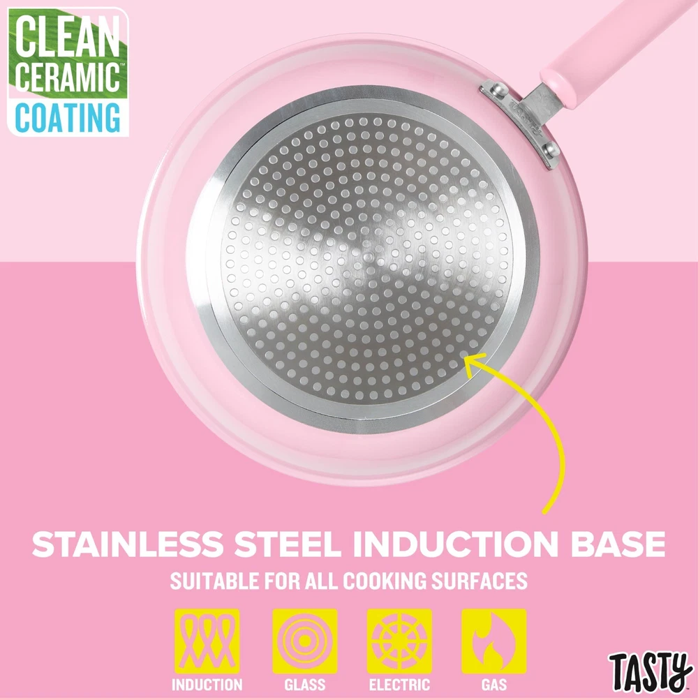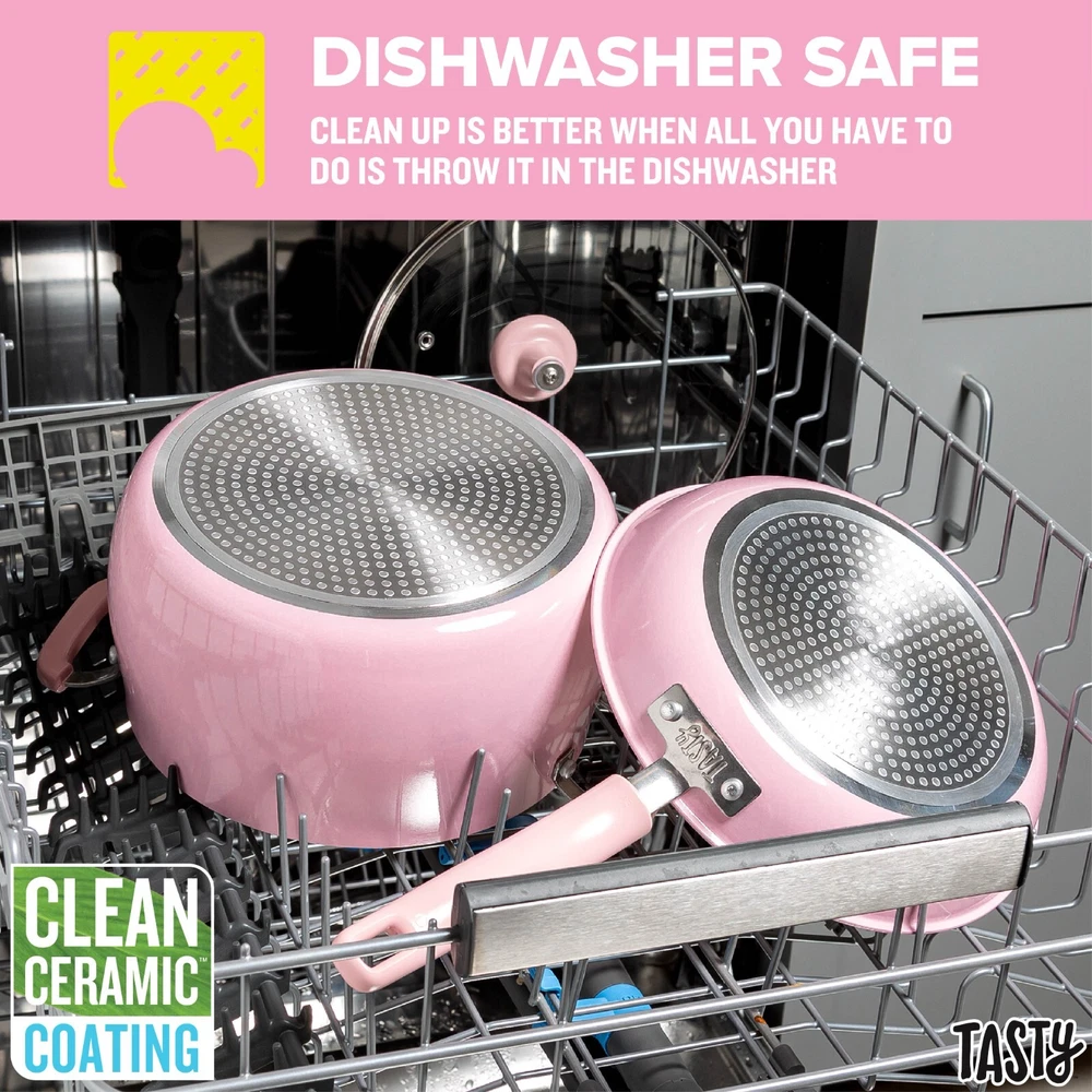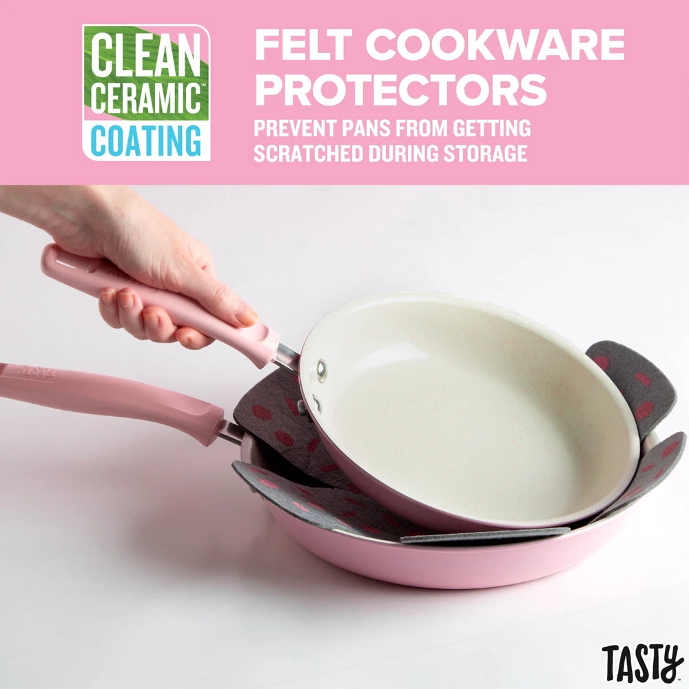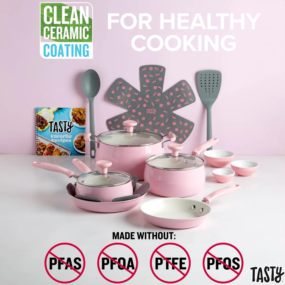 Product details Everything you need for your kitchen in one box! Set your kitchen up for success with this Tasty Clean Ceramic non-stick 16 piece cookware set. The better, stronger, and longer-lasting reinforced Clean Ceramic non-stick coating allows food to easily slide out of the pan. The non-stick coating is made without PFAS, PFOA, PTFE and PFOS for healthy cooking. When you're looking to store these pots and pans, use the included pan protectors to sandwich in between two pieces of cookware to allow for stacking and storing without scratching. The cookware also features a stainless steel induction base, making this cookware suitable for all cooking surfaces, including induction, electric, gas and glass. Better, Stronger, Longer-Lasting Non-Stick: This pots and pans set features a premium, reinforced Clean Ceramic non-stick coating that allows food to easily slide out of the pan Healthy Cooking: The ceramic non-stick coating is made without PFAS, PFOA, PTFE and PFOS Metal Utensil Safe: The durable non-stick is metal utensil safe, though we still recommend using silicone, wood or nylon tools when cooking Dishwasher Safe for Easy Cleaning: These pans are as easy to clean as they are to use and are dishwasher safe for fast and easy clean-up Awesome Quality: This cookware's heavy duty construction heats quickly and evenly Suitable for All Cooking Surfaces: Use this cookware on induction, electric, gas and glass! Pots and pans feature a stainless steel induction base A Pinch of This: Use the included ceramic bowls to pre-measure ingredients and make up sauces in advance to make cooking a breeze- comes in 6 ounce, 4 ounce and 2 ounce sizes The Right Tools for the Job: The turner and spoon are heat resistant and safe to use on non-stick surfaces Stack and Protect: Included cookware protectors (11.5 inch and 13.5 inch) are perfect for stacking and storing cookware without worrying about scratches Includes: 8 inch fry pan, 9.5 inch fry pan, 1.5 quart saucepan with glass lid, 2.5 quart saucepan with glass lid, 5 quart dutch oven with glass lid, 2 piece cookware protectors (11.5 inch and 13.5 inch), solid spoon, slotted turner, 3 piece ceramic prep bowls (6 ounce, 4 ounce and 2 ounce)