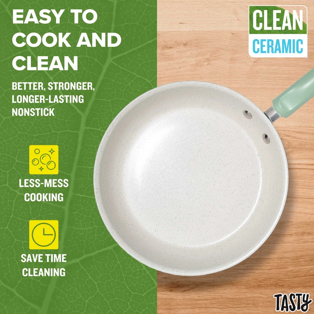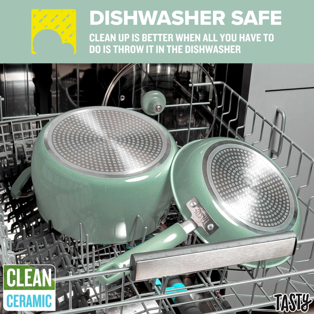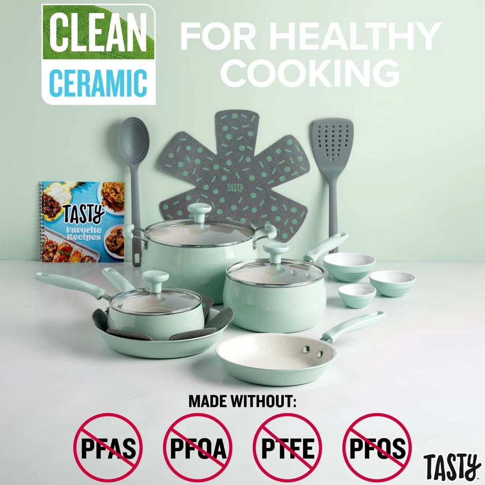 Better, Stronger, Longer-Lasting Non-Stick: This pots and pans set features a premium, reinforced Clean Ceramic non-stick coating that allows food to easily slide out of the pan Metal Utensil Safe: The durable non-stick is metal utensil safe, though we still recommend using silicone, wood or nylon tools when cooking A Pinch of This: Use the included ceramic bowls to pre-measure ingredients and make up sauces in advance to make cooking a breeze- comes in 6 ounce, 4 ounce and 2 ounce sizes Dishwasher Safe for Easy Cleaning: These pans are as easy to clean as they are to use and are dishwasher safe for fast and easy clean-up The Right Tools for the Job: The turner and spoon are heat resistant and safe to use on non-stick surfaces Awesome Quality: This cookware's heavy duty construction heats quickly and evenly Stack and Protect: Included cookware protectors (11.5 inch and 13.5 inch) are perfect for stacking and storing cookware without worrying about scratches Healthy Cooking: The ceramic non-stick coating is made without PFAS, PFOA, PTFE and PFOS Suitable for All Cooking Surfaces: Use this cookware on induction, electric, gas and glass! Pots and pans feature a stainless steel induction base Includes: 8 inch fry pan, 9.5 inch fry pan, 1.5 quart saucepan with glass lid, 2.5 quart saucepan with glass lid, 5 quart dutch oven with glass lid, 2 piece cookware protectors (11.5 inch and 13.5 inch), solid spoon, slotted turner, 3 piece ceramic prep bowls (6 ounce, 4 ounce and 2 ounce) Better, Stronger, Longer-Lasting Non-Stick: This pots and pans set features a premium, reinforced Clean Ceramic non-stick coating that allows food to easily slide out of the pan Metal Utensil Safe: The durable non-stick is metal utensil safe, though we still recommend using silicone, wood or nylon tools when cooking A Pinch of This: Use the included ceramic bowls to pre-measure ingredients and make up sauces in advance to make cooking a breeze- comes in 6 ounce, 4 ounce and 2 ounce sizes Dishwasher Safe for Easy Cleaning: These pans are as easy to clean as they are to use and are dishwasher safe for fast and easy clean-up The Right Tools for the Job: The turner and spoon are heat resistant and safe to use on non-stick surfaces Awesome Quality: This cookware's heavy duty construction heats quickly and evenly Stack and Protect: Included cookware protectors (11.5 inch and 13.5 inch) are perfect for stacking and storing cookware without worrying about scratches Healthy Cooking: The ceramic non-stick coating is made without PFAS, PFOA, PTFE and PFOS Suitable for All Cooking Surfaces: Use this cookware on induction, electric, gas and glass! Pots and pans feature a stainless steel induction base Includes: 8 inch fry pan, 9.5 inch fry pan, 1.5 quart saucepan with glass lid, 2.5 quart saucepan with glass lid, 5 quart dutch oven with glass lid, 2 piece cookware protectors (11.5 inch and 13.5 inch), solid spoon, slotted turner, 3 piece ceramic prep bowls (6 ounce, 4 ounce and 2 ounce)