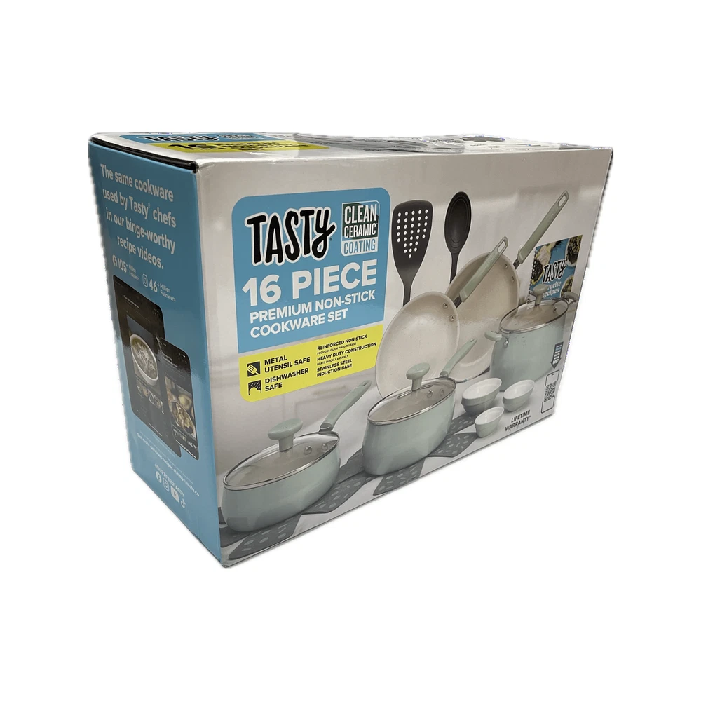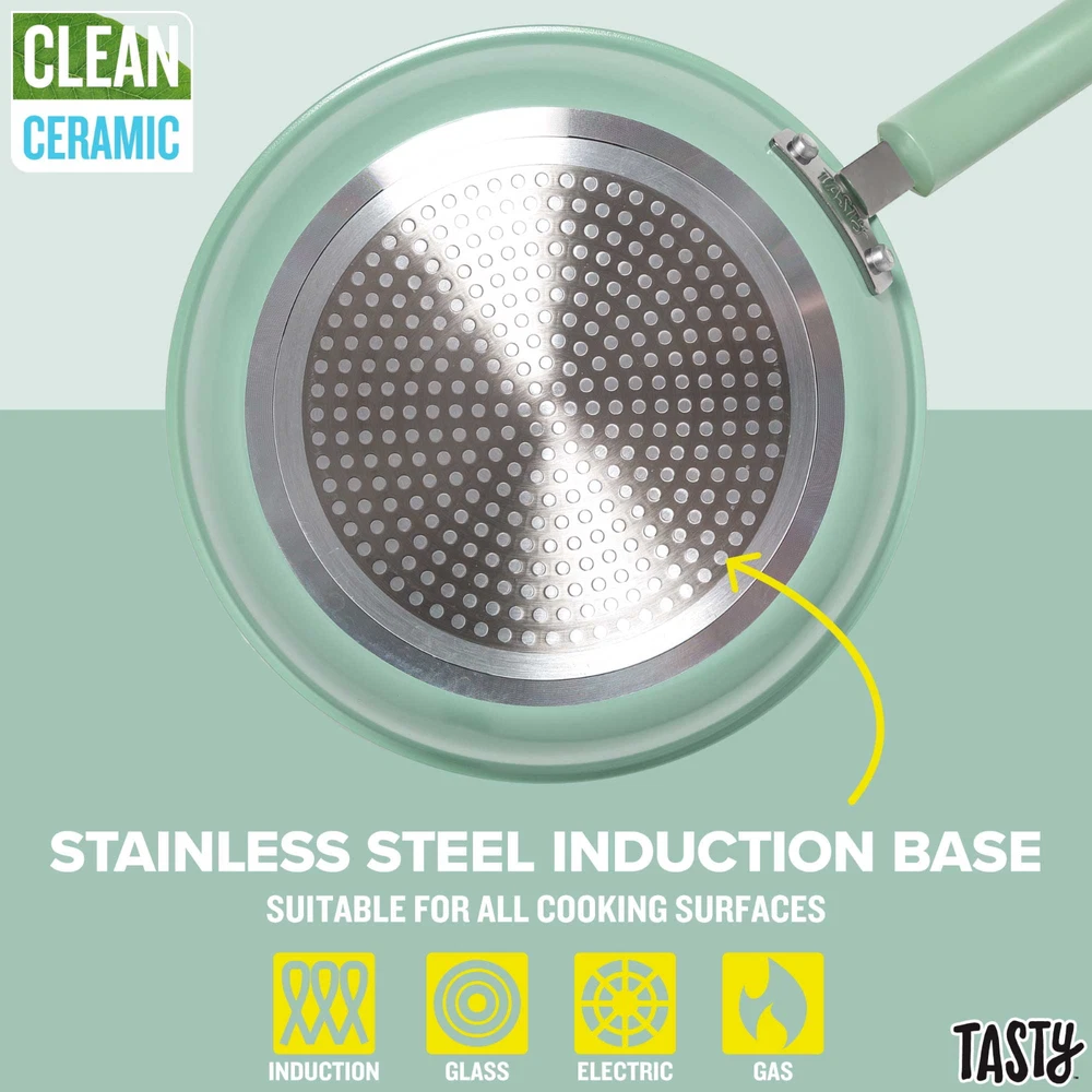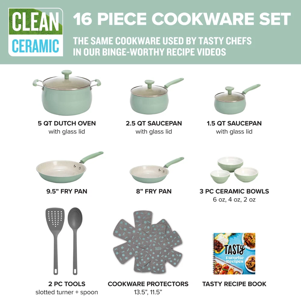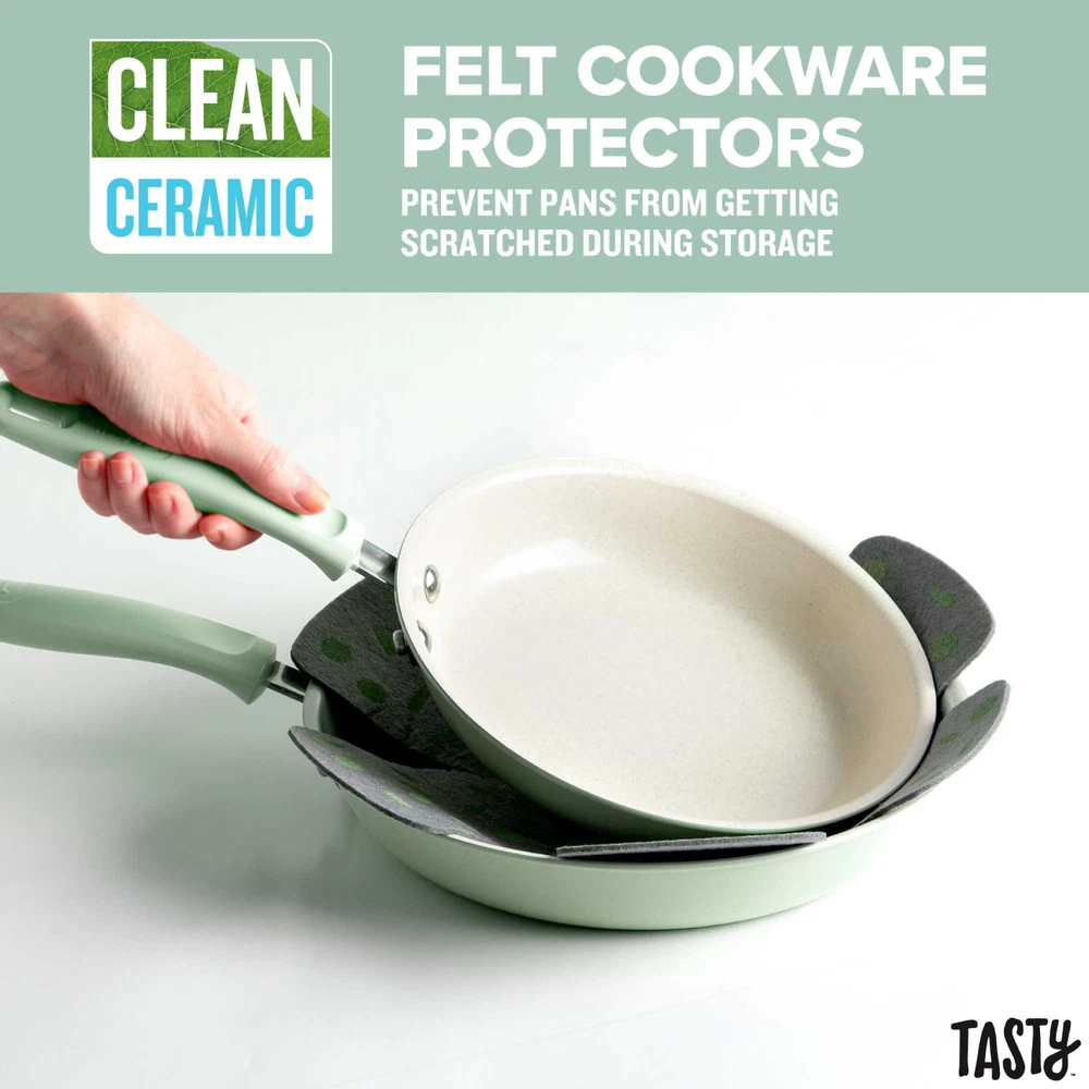 Better, Stronger, Longer-Lasting Non-Stick: This pots and pans set features a premium, reinforced Clean Ceramic non-stick coating that allows food to easily slide out of the pan Metal Utensil Safe: The durable non-stick is metal utensil safe, though we still recommend using silicone, wood or nylon tools when cooking A Pinch of This: Use the included ceramic bowls to pre-measure ingredients and make up sauces in advance to make cooking a breeze- comes in 6 ounce, 4 ounce and 2 ounce sizes Dishwasher Safe for Easy Cleaning: These pans are as easy to clean as they are to use and are dishwasher safe for fast and easy clean-up The Right Tools for the Job: The turner and spoon are heat resistant and safe to use on non-stick surfaces Awesome Quality: This cookware's heavy duty construction heats quickly and evenly Stack and Protect: Included cookware protectors (11.5 inch and 13.5 inch) are perfect for stacking and storing cookware without worrying about scratches Healthy Cooking: The ceramic non-stick coating is made without PFAS, PFOA, PTFE and PFOS Suitable for All Cooking Surfaces: Use this cookware on induction, electric, gas and glass! Pots and pans feature a stainless steel induction base Includes: 8 inch fry pan, 9.5 inch fry pan, 1.5 quart saucepan with glass lid, 2.5 quart saucepan with glass lid, 5 quart dutch oven with glass lid, 2 piece cookware protectors (11.5 inch and 13.5 inch), solid spoon, slotted turner, 3 piece ceramic prep bowls (6 ounce, 4 ounce and 2 ounce) Better, Stronger, Longer-Lasting Non-Stick: This pots and pans set features a premium, reinforced Clean Ceramic non-stick coating that allows food to easily slide out of the pan Metal Utensil Safe: The durable non-stick is metal utensil safe, though we still recommend using silicone, wood or nylon tools when cooking A Pinch of This: Use the included ceramic bowls to pre-measure ingredients and make up sauces in advance to make cooking a breeze- comes in 6 ounce, 4 ounce and 2 ounce sizes Dishwasher Safe for Easy Cleaning: These pans are as easy to clean as they are to use and are dishwasher safe for fast and easy clean-up The Right Tools for the Job: The turner and spoon are heat resistant and safe to use on non-stick surfaces Awesome Quality: This cookware's heavy duty construction heats quickly and evenly Stack and Protect: Included cookware protectors (11.5 inch and 13.5 inch) are perfect for stacking and storing cookware without worrying about scratches Healthy Cooking: The ceramic non-stick coating is made without PFAS, PFOA, PTFE and PFOS Suitable for All Cooking Surfaces: Use this cookware on induction, electric, gas and glass! Pots and pans feature a stainless steel induction base Includes: 8 inch fry pan, 9.5 inch fry pan, 1.5 quart saucepan with glass lid, 2.5 quart saucepan with glass lid, 5 quart dutch oven with glass lid, 2 piece cookware protectors (11.5 inch and 13.5 inch), solid spoon, slotted turner, 3 piece ceramic prep bowls (6 ounce, 4 ounce and 2 ounce)