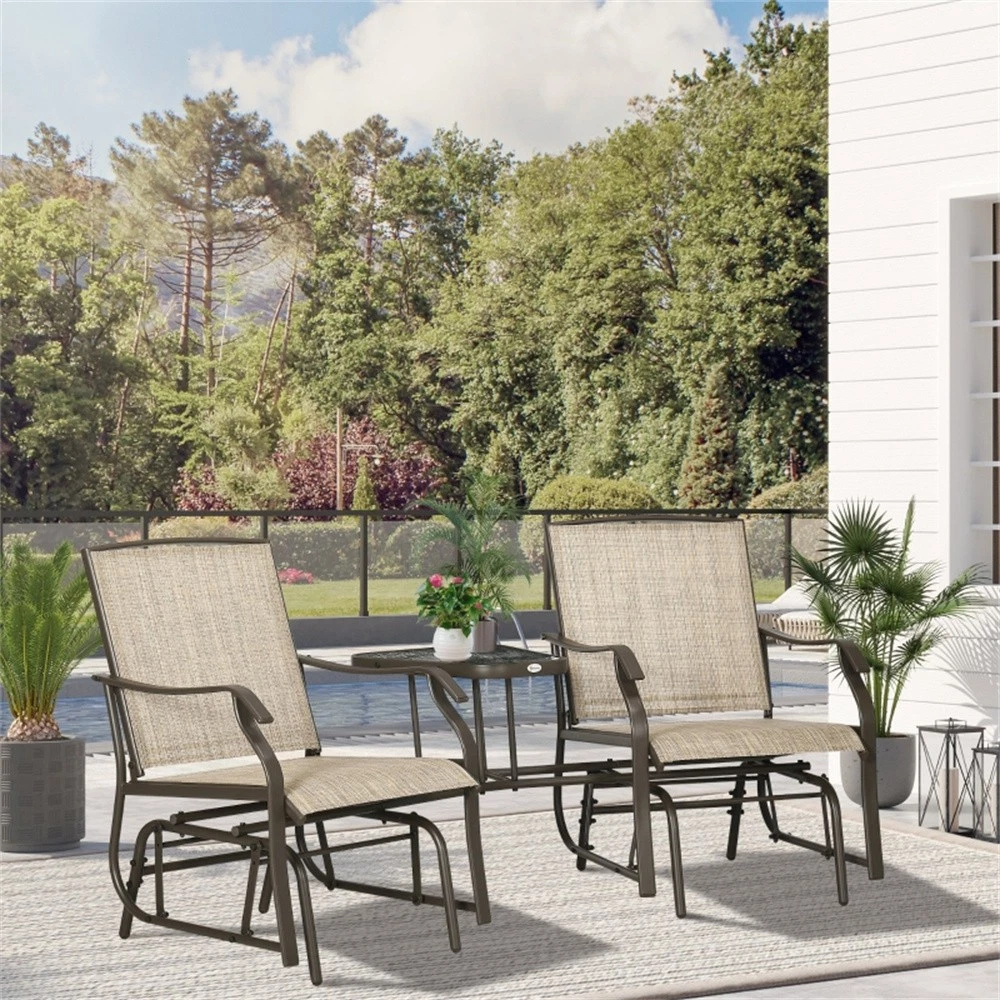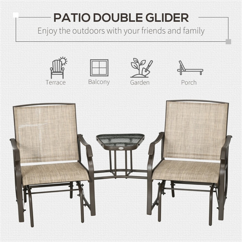 Features: - Seats two people - Table can be used to hold snacks, drinks, books, magazines, and more - Curved armrests and high back offer extra comfort and support - Sturdy steel metal frame sits two people comfortably at 352 lbs. per chair - Ideal for outdoor use with its weather-resistant material and lightweight design - Simple assembly required Specification: - Color: Brown Frame, Light Brown Fabric - Materials: Steel, Sling Fabric - Overall Dimensions: 76.75" L x 34.75" W x 35" H - Seat Dimensions: 20.5" W x 20.5" D - Seat to Floor Height: 17" H - Table Dimensions: 17" W x 19.5" D x 1.5" H Package Includes: - 1 × Double Patio Glider with Tea Table - 1 x Manual On Mar 30, 2026 at 02:28:59 PDT, seller added the following information: