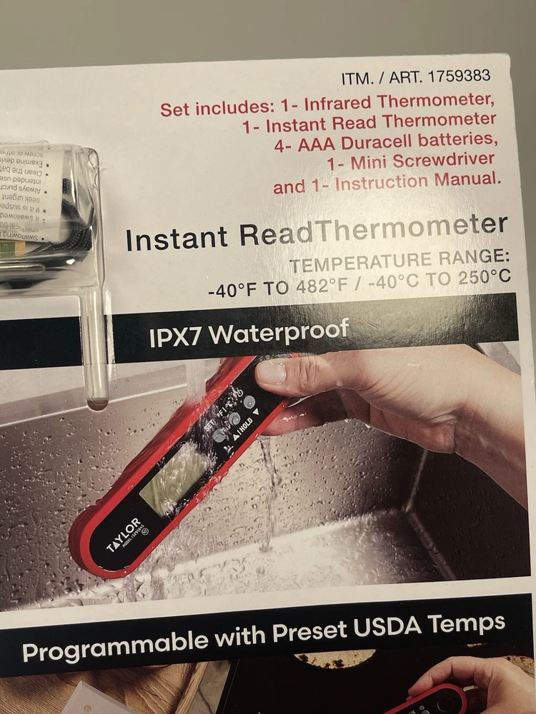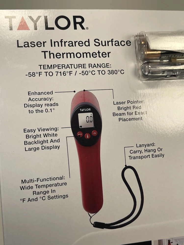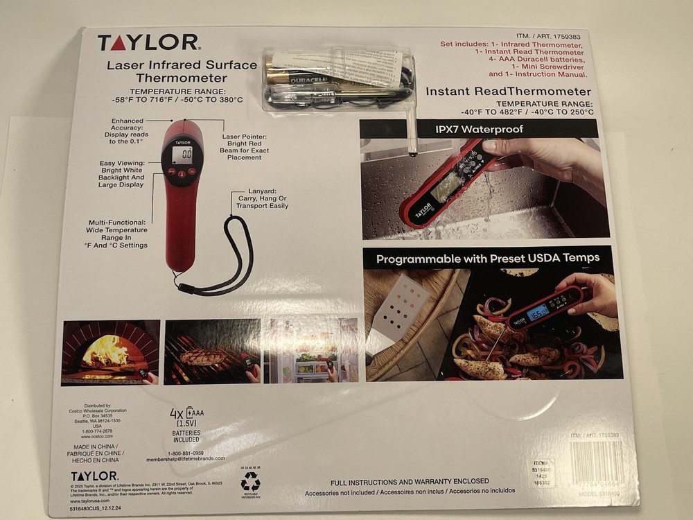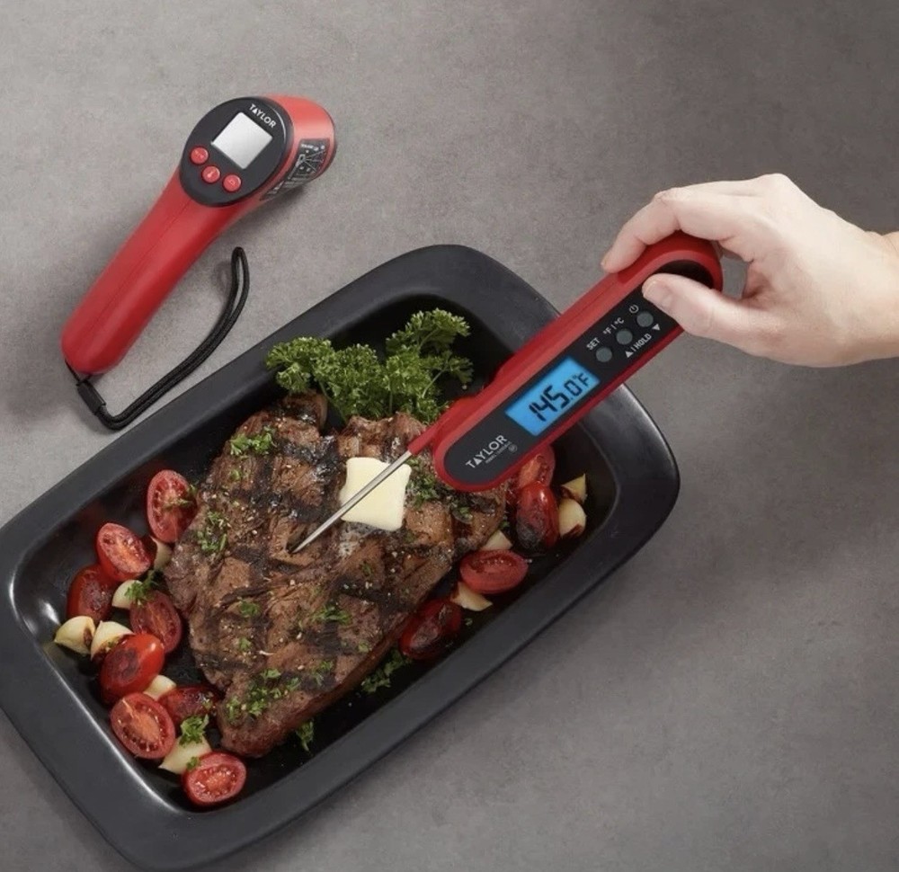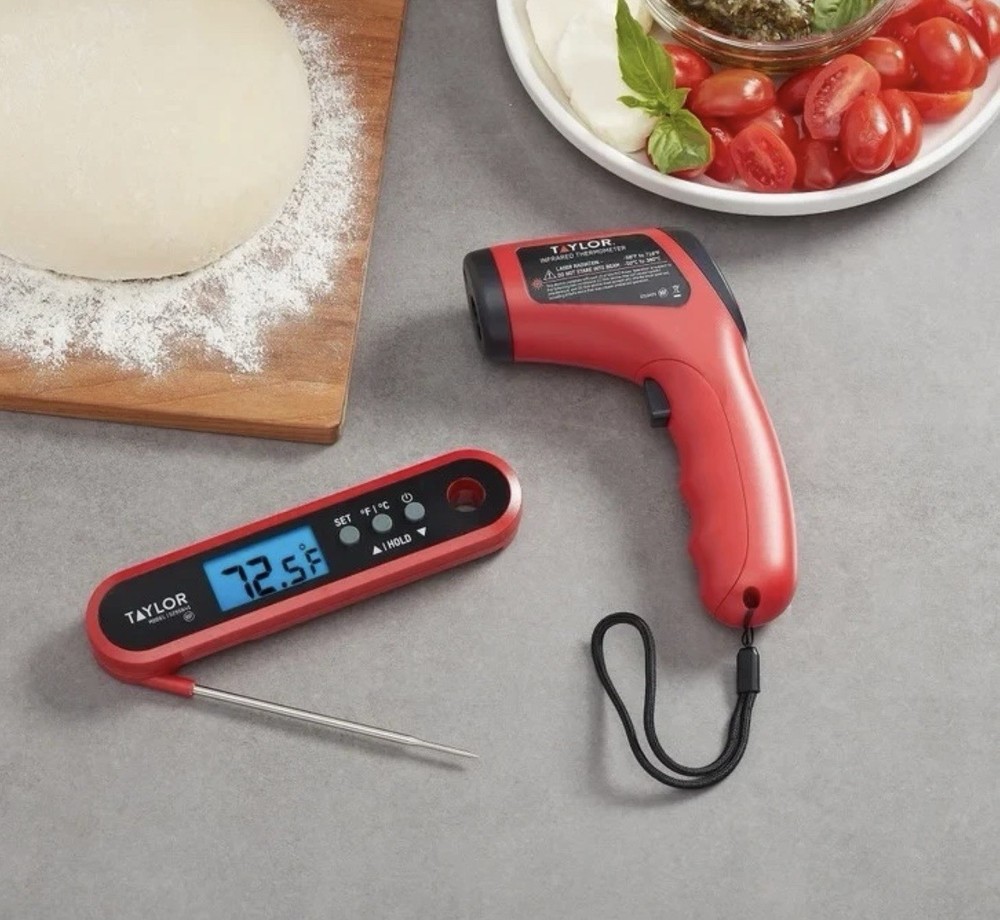 The Taylor 2-Piece Digital Thermometer Bundle combines instant-read and laser infrared surface thermometers in one convenient package. The red thermometers feature digital technology for precise measurements, making them ideal for cooking and baking tasks in the kitchen. With the Taylor brand known for quality and accuracy, this bundle offers versatile and reliable tools for monitoring food temperatures effortlessly.