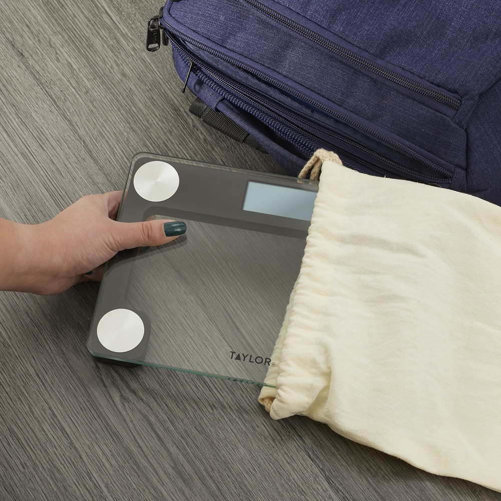 CONVENIENT AND PORTABLE: Compact Travel Bath Scale with travel/storage tote. The stylish drawstring canvas bag adds a layer of protection and makes carrying the scale hassle-free. DURABLE GLASS PLATFORM: The compact 9.7" x 6.7" platform offers ample space and a sleek, minimalist look, making it portable and easy to carry in your tote. EASY-TO-READ: The 2.4" x 1" display offers clear, easy-to-read numbers, making it simple to check your weight at a glance from any angle. CONSISTENT & ACCURATE: Our USA-based teams engineer high-quality, accurate products. TAYLOR has the highest sales in bathroom scales. For over 170 years, we have been dedicated to innovation and quality. FSA/HSA ELIGIBLE: Check with your provider for eligibility.