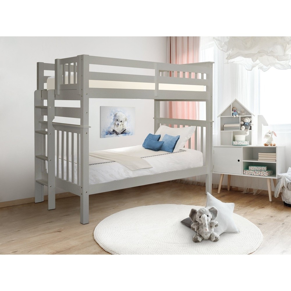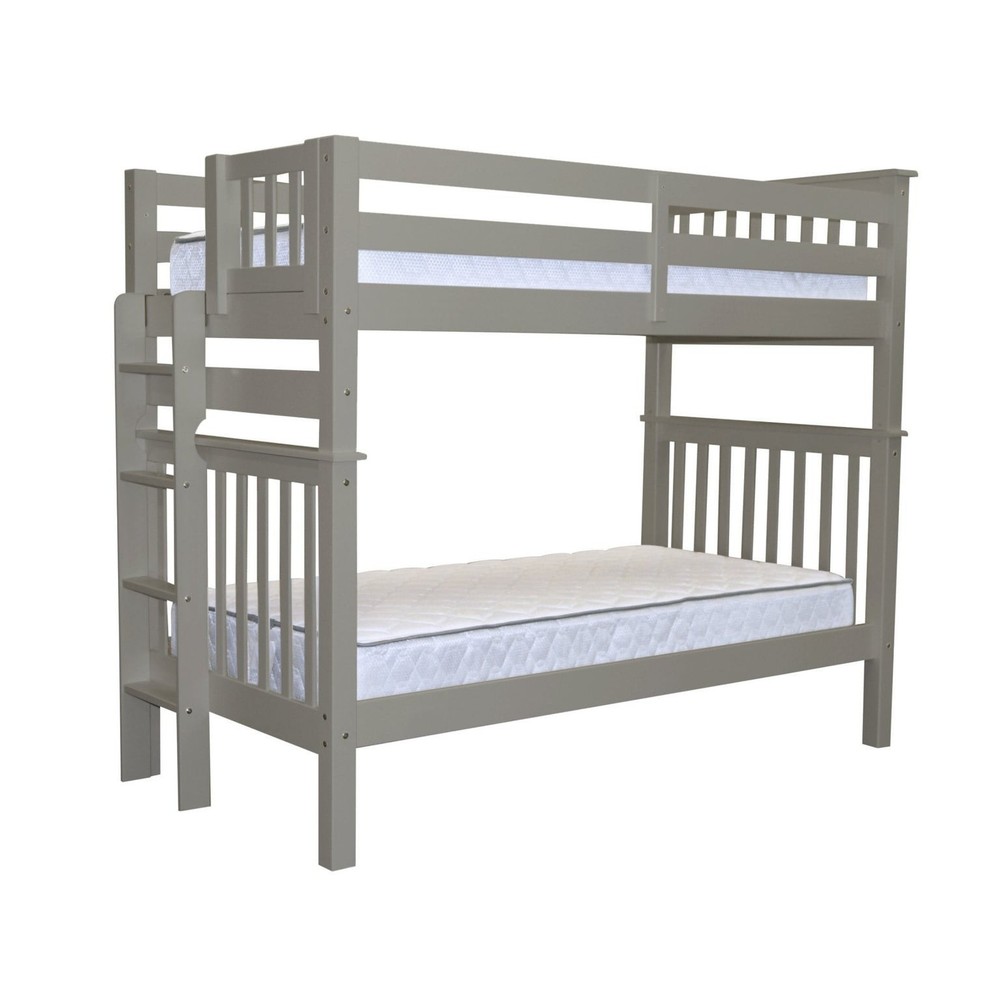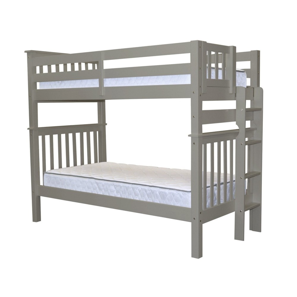 Constructed from stable pine wood with a charming grey finish, this classy and reliable bunk bed is a fantastic solution for roommates and large families. The bunk features a twin over twin construction with an end ladderFeatures:Includes hardwareGrey finishSolid PineAssembly RequiredSale is for bunk bed only (excludes mattresses)69 inches high x 43 1/2 inches wide x 83 1/2 inches longThis product will ship to you in multiple boxes.Assembly Required Free Shipping Over $49.99* Details Taylor & Olive Trillium Tall Twin over Twin Bunk Bed with End Ladder Product Description: Constructed from stable pine wood with a charming grey finish, this classy and reliable bunk bed is a fantastic solution for roommates and large families. The bunk features a twin over twin construction with an end ladder Features: Includes hardware Grey finish Solid Pine Assembly Required Sale is for bunk bed only (excludes mattresses) 69 inches high x 43 1/2 inches wide x 83 1/2 inches long This product will ship to you in multiple boxes. Assembly Required
