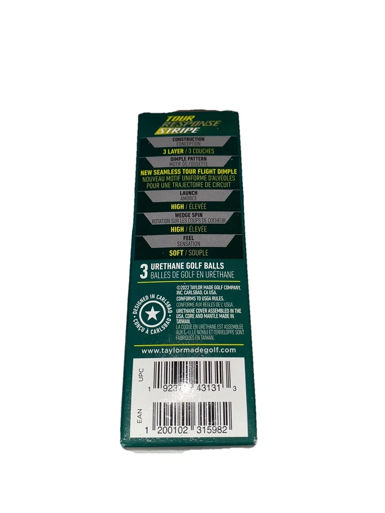 Type:Golf BallsVintage:NoModel:StripeBall Type:Tour PreferredNumber in Pack:3Material:PolyurethaneSigned:NoBrand:TaylorMadeFeatures:Control, Short game, DistanceSuitable For:MatchSport/Activity:GolfUPC:0192371431313Color:MulticolorNumber of Items in Set:3Ball Construction:3-pieceMPN:NOT SPECIFIEDgtin13:0192371431313Compression Rating:HighProduct Line:TaylorMade Tour ResponseManufacturer Color:Lime/White