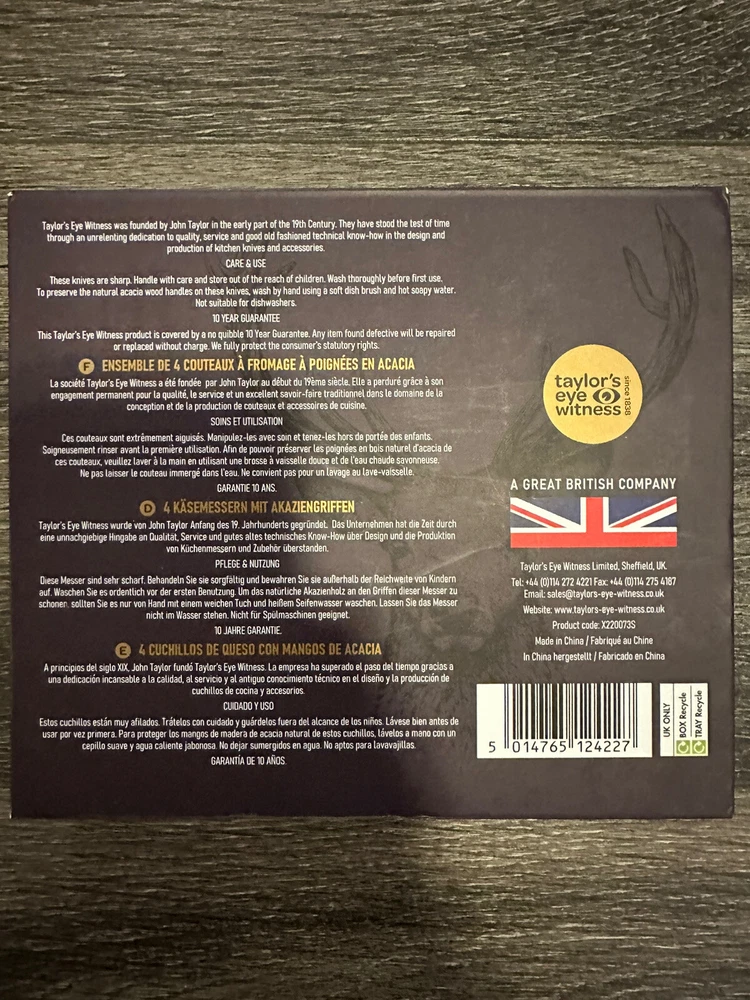 Brand:Taylor's Eye WitnessTheme:Animalsgtin13:Does not applyPattern:Animal PrintNumber of Items in Set:4Country/Region of Manufacture:ChinaUPC:Does not applyColor:BrownCustom Bundle:NoPersonalize:NoType:Cheese Knife