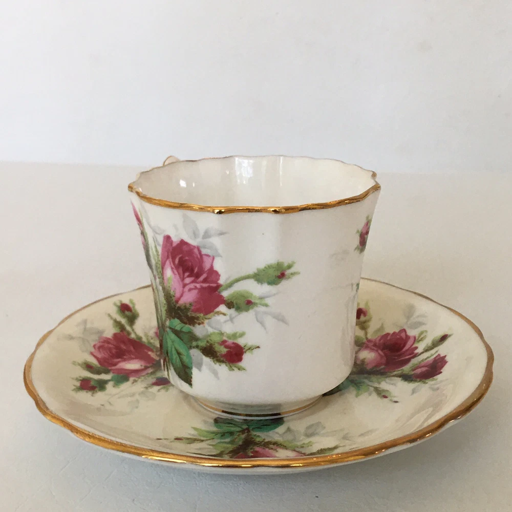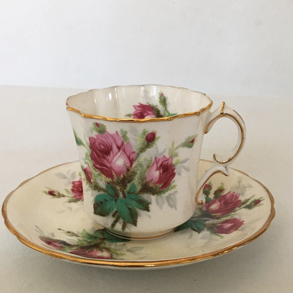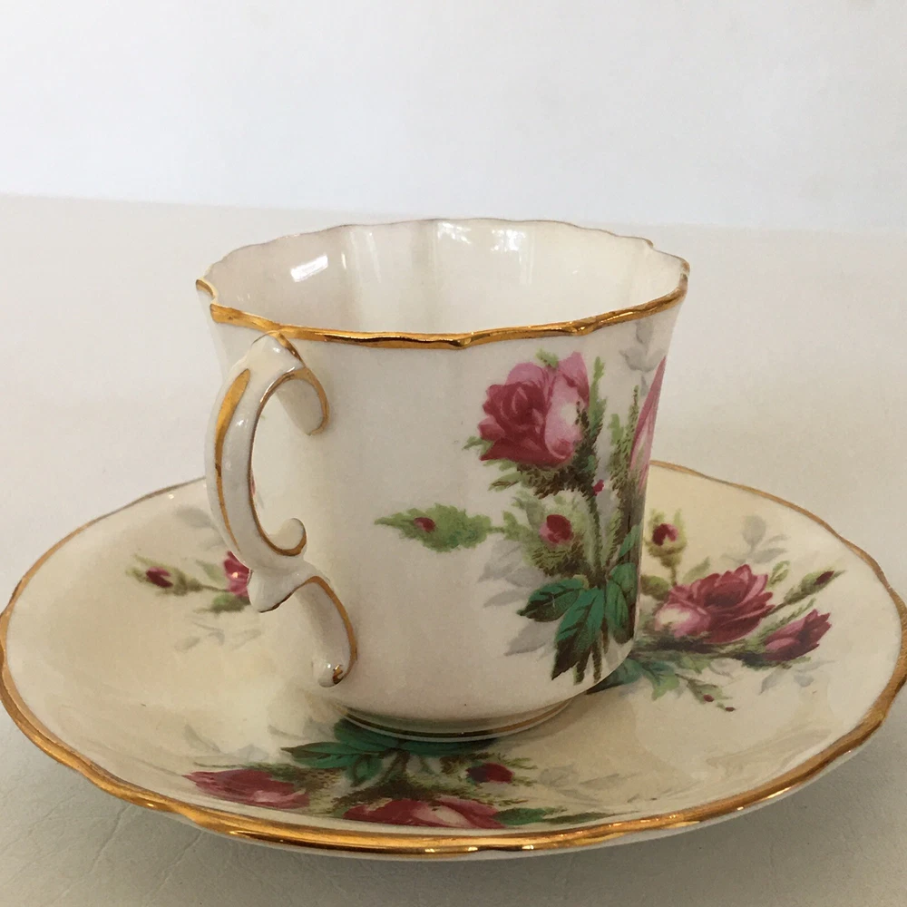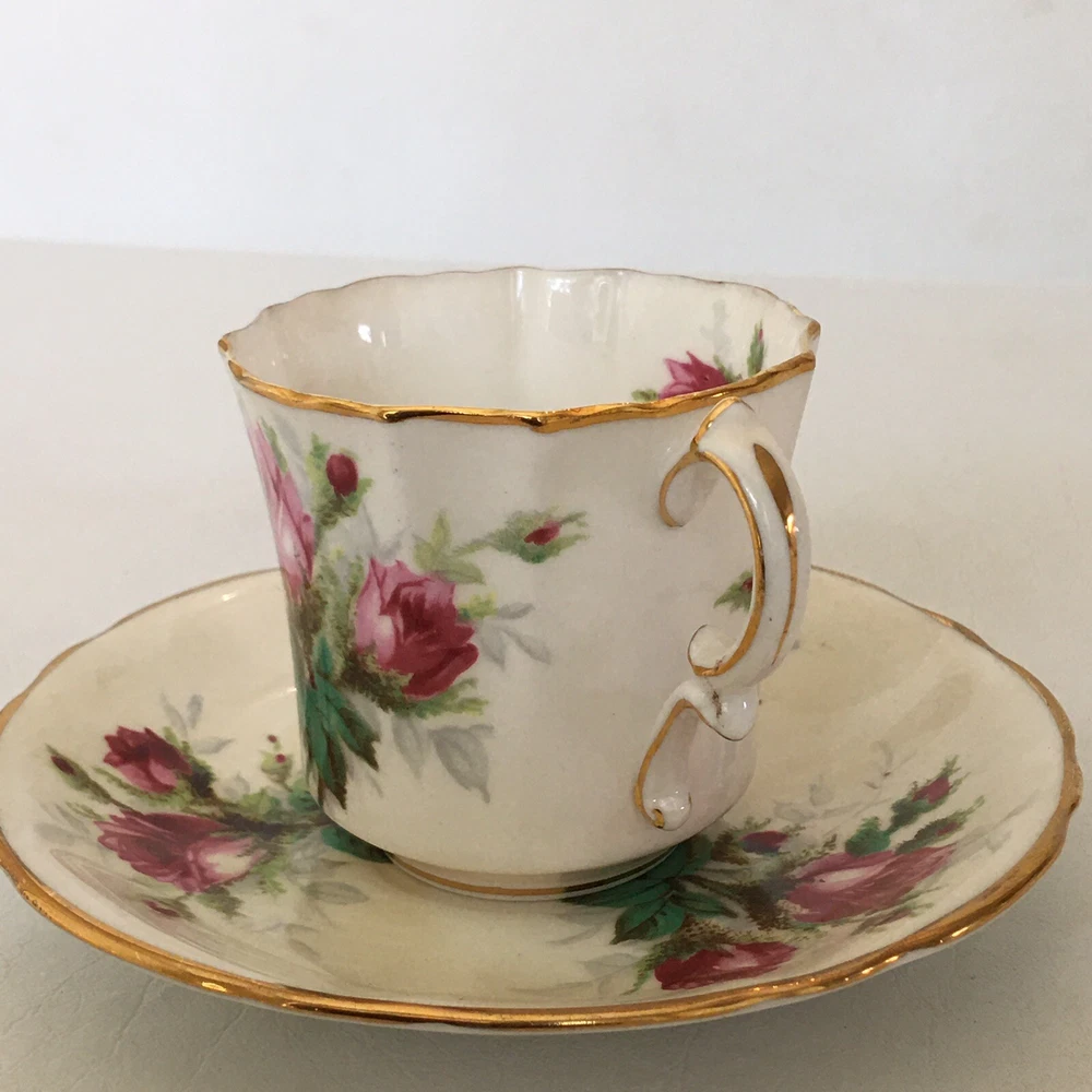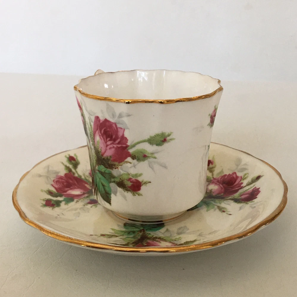 This beautiful vintage tea cup and saucer set is a wonderful addition to any collection. Made of fine bone china from Hammersley in England, this set features a charming floral pattern with red roses. The set includes a cup and saucer, perfect for sipping your favorite tea. The colors are bright and cheerful, and the set is in excellent condition. It's a great way to add a touch of elegance to your tea time. The vintage design adds a touch of nostalgia to the set, making it a great conversation piece.