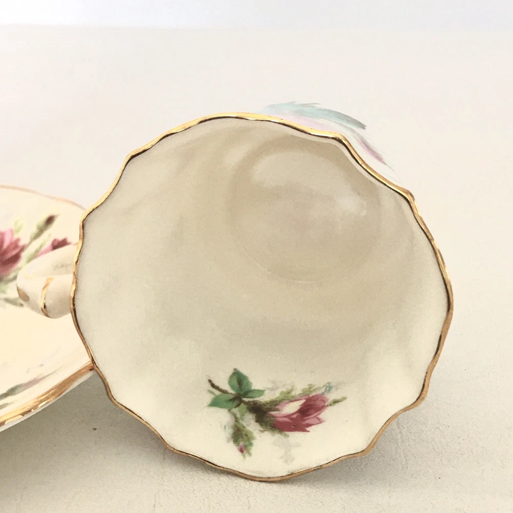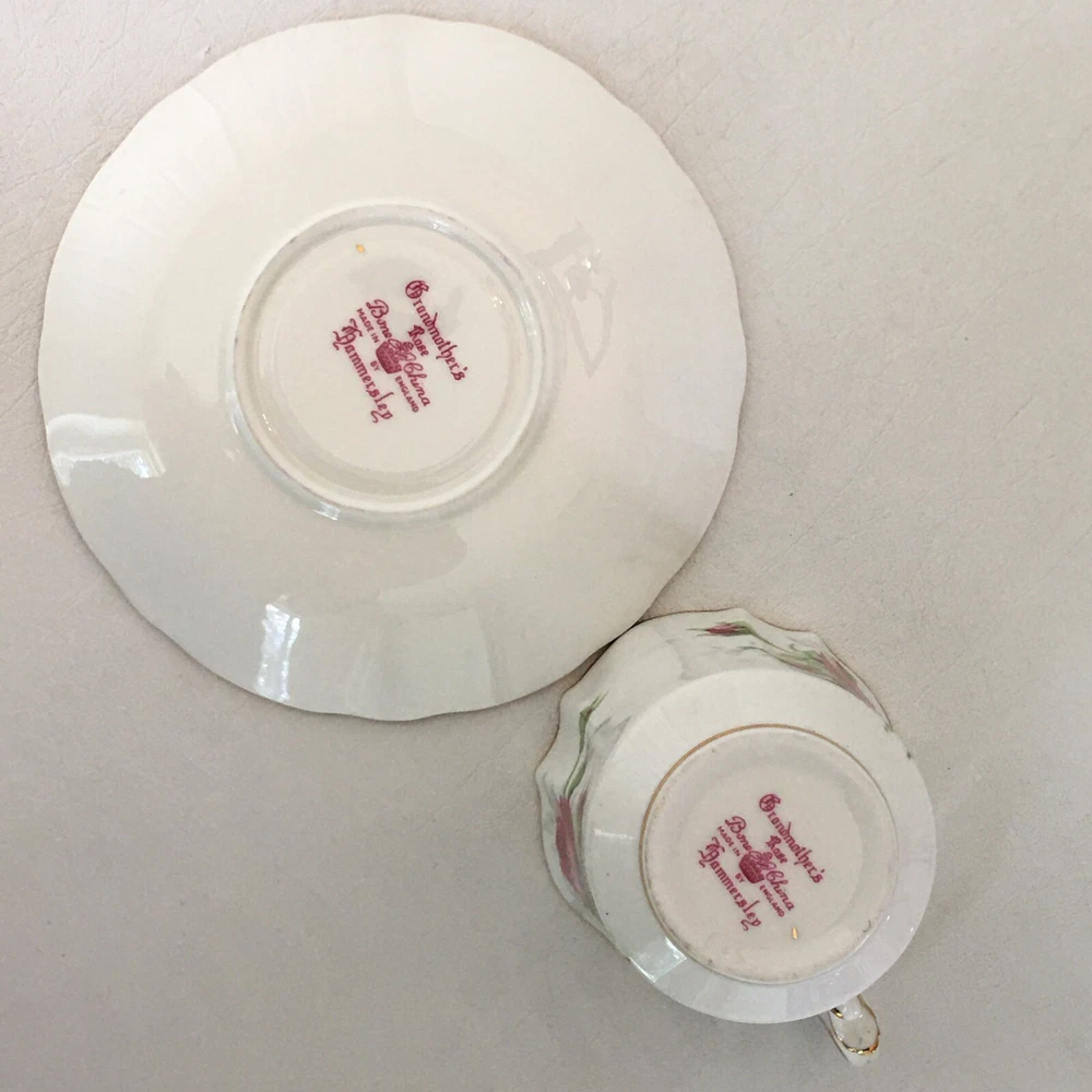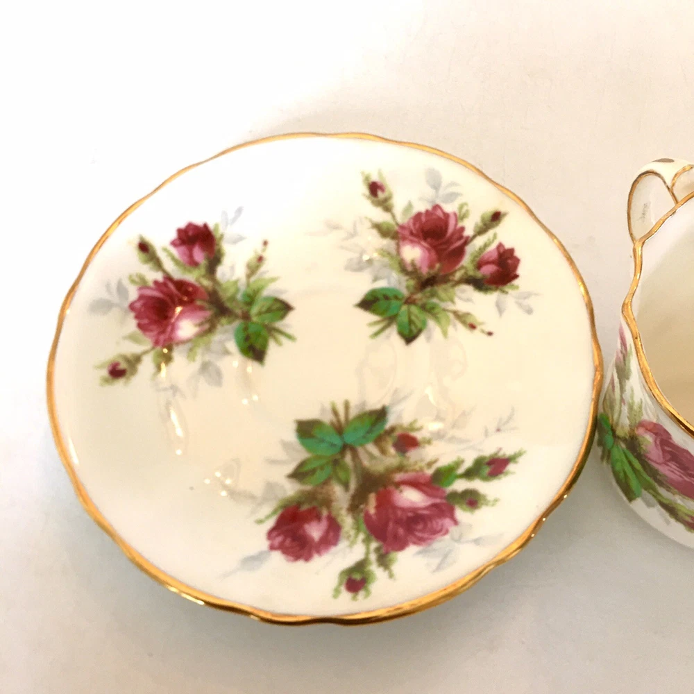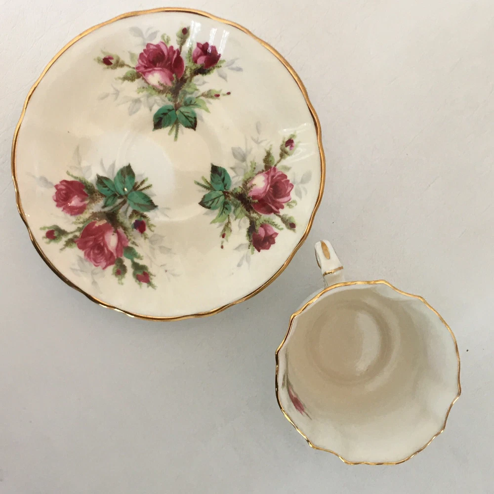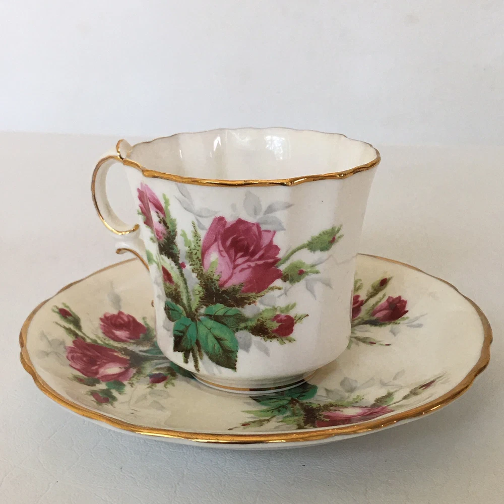This beautiful vintage tea cup and saucer set is a wonderful addition to any collection. Made of fine bone china from Hammersley in England, this set features a charming floral pattern with red roses. The set includes a cup and saucer, perfect for sipping your favorite tea. The colors are bright and cheerful, and the set is in excellent condition. It's a great way to add a touch of elegance to your tea time. The vintage design adds a touch of nostalgia to the set, making it a great conversation piece.