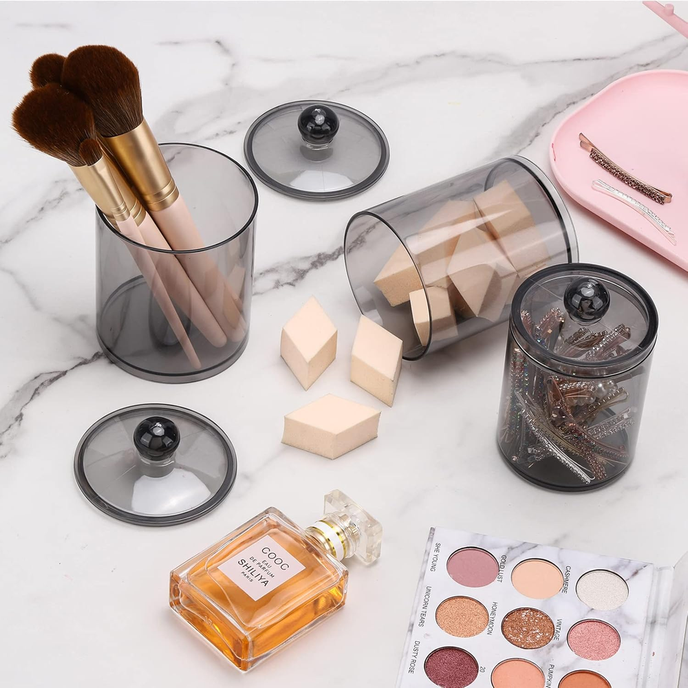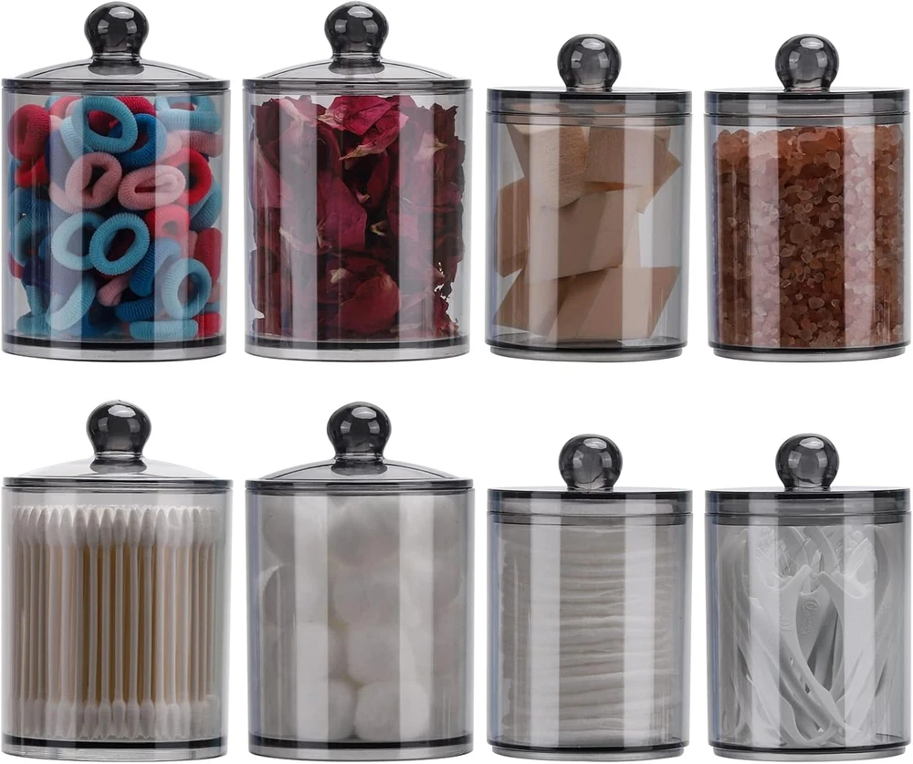 Packing: 2 pcs samll jars into 2pcs large jars, not just 2 jars, please check carefully when you receive the package Size - 10oz: With the lid, height = 4.4 inches, diameter = 2.7 inches Without lid: about 3.5 high, 12oz: With the lid, height = 4.8 inches, diameter = 3 inches Without lid: about 3.6 high Q tip Storage Organizer - Look like glass but are a really sturdy plastic and will not shatter, safe for kids Bathroom Accessories - Each floss pick dispenser has a removable lid and a wide mouth, easy to get them out These canisters are great looking and perfect for the vanity, bathroom and kitchen Product Description 4 Pack Bathroom Accessories Organizer - 12oz & 10oz Qtip Holder Dispenser for Cotton Ball Swab Pad Bathroom Storage Containers 4 individual Jar on the package Little things also allowed. Easy to get your fingers downet your fingers down Hard solid plastic,Looks just like glass - lightweight won't broken and hurt your kids Small size but can hold many things. Doesn't take too much space and it keeps things organized on your vanity 4 lids fit very tightly to keep form dust