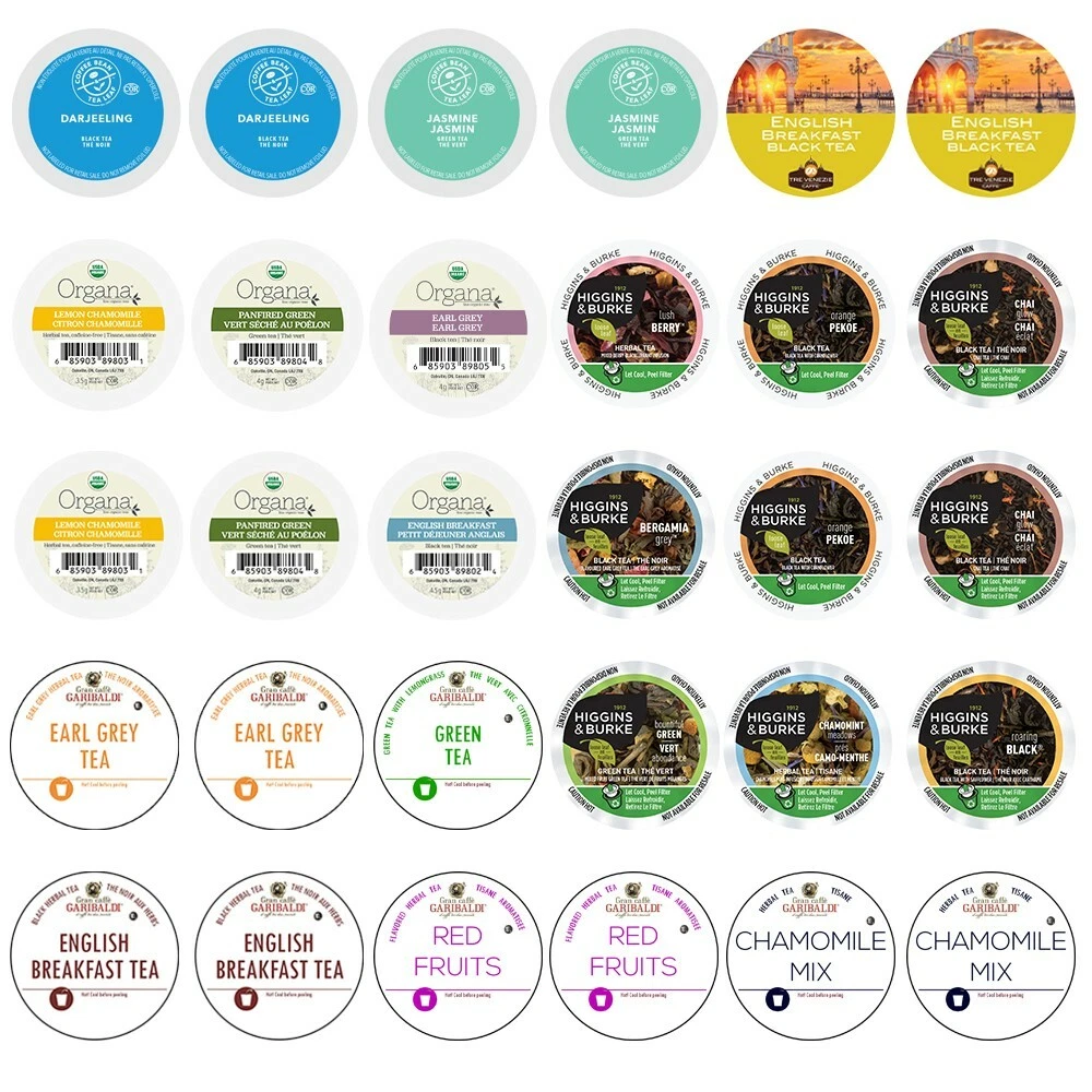 Product Highlights SAMPLE A WIDE VARIETY OF TEA: This sampler pack includes a great array of 30 Keurig tea pods and other single serve tea cups. Find your favorites without committing to a full box of each. REAL TEA AND HERBAL TEA OPTIONS: Enjoy classics such as Earl Gray, English Breakfast Tea, and super invigorating Green Tea k cups alongside more adventurous herbal tea flavors like mint tea, red fruit tea, lemon tea, and more. TOP BRANDS AND FLAVORS: Enjoy single serve tea pods and tea kcups for keurig from top producers such as Organa, Coffee Bean and Tea leaf and Garibaldi. Taste them all and find your favorite tea pods for Keurig machines. BREW HOT OR AS ICED TEA: These single serve capsules and Keurig tea k-cups are carefully engineered and verified to work in all k cups brewers, including the Keurig 2.0. You can enjoy them hot, and many of them are refreshing as iced tea k cups. The tea pods for Keurig in this tea pods sampler pack are repackaged and not in original manufacturer's packaging. Keurig and K Cups are registered trademarks of Keurig and Green Mountain.