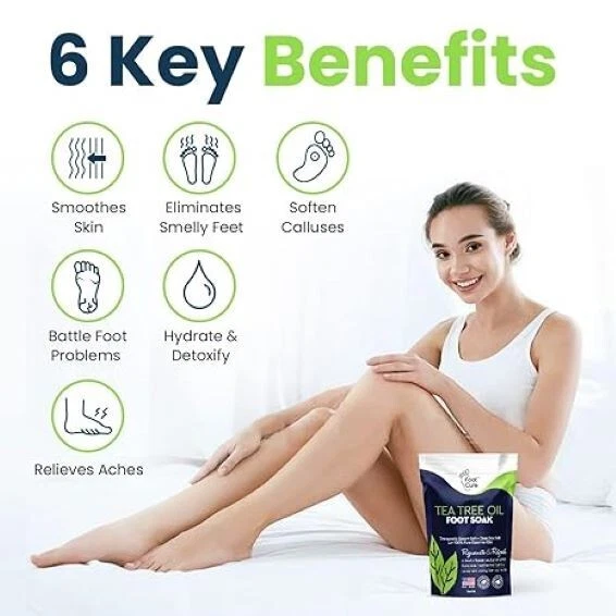 Spoil Your Feet & Toenails From the Comfort of Home: This tea tree oil foot soak will help you wave goodbye to stubborn calluses, dry skin, athlete's foot, irritations, funky odors, and all of those aches and pains; Now, you can wear open-toe shoes with the utmost confidence The Same Foot Soak Salts That Expensive Spas Use: You don't need to pay a fortune to pamper your feet at a high-end spa when you have this tea tree foot salt soak; This Epsom salt bath soak can also be used as bath salts for the ultimate hot tub aromatherapy. American-Made Foot Soak for Supreme Relaxation: This foot soak for dry cracked feet is made from hand-selected natural and organic ingredients; It's a proprietary blend of Dead Sea Salt, Epsom Salt, Magnesium, Tea Tree, Eucalyptus, Rosemary, Peppermint, Spearmint, and Chamomile Gentle on Even the Most Sensitive Skin Types: The Foot & Bath soak does not contain any harsh chemicals, fillers, additives, and other potentially harsh ingredients; This foot callus remover soak is super skin-friendly, so it will get the job done without irritating your sensitive skin A Transformative, Timeless Bath Blend: Bath time is quality time, especially when you’re relieving muscle aches, easing stress or headaches, calming overactive nerves, or preparing for a better night’s sleep. Choose a highly effective Pure Epsom salts magnesium bath soak known to offer rejuvenating results.