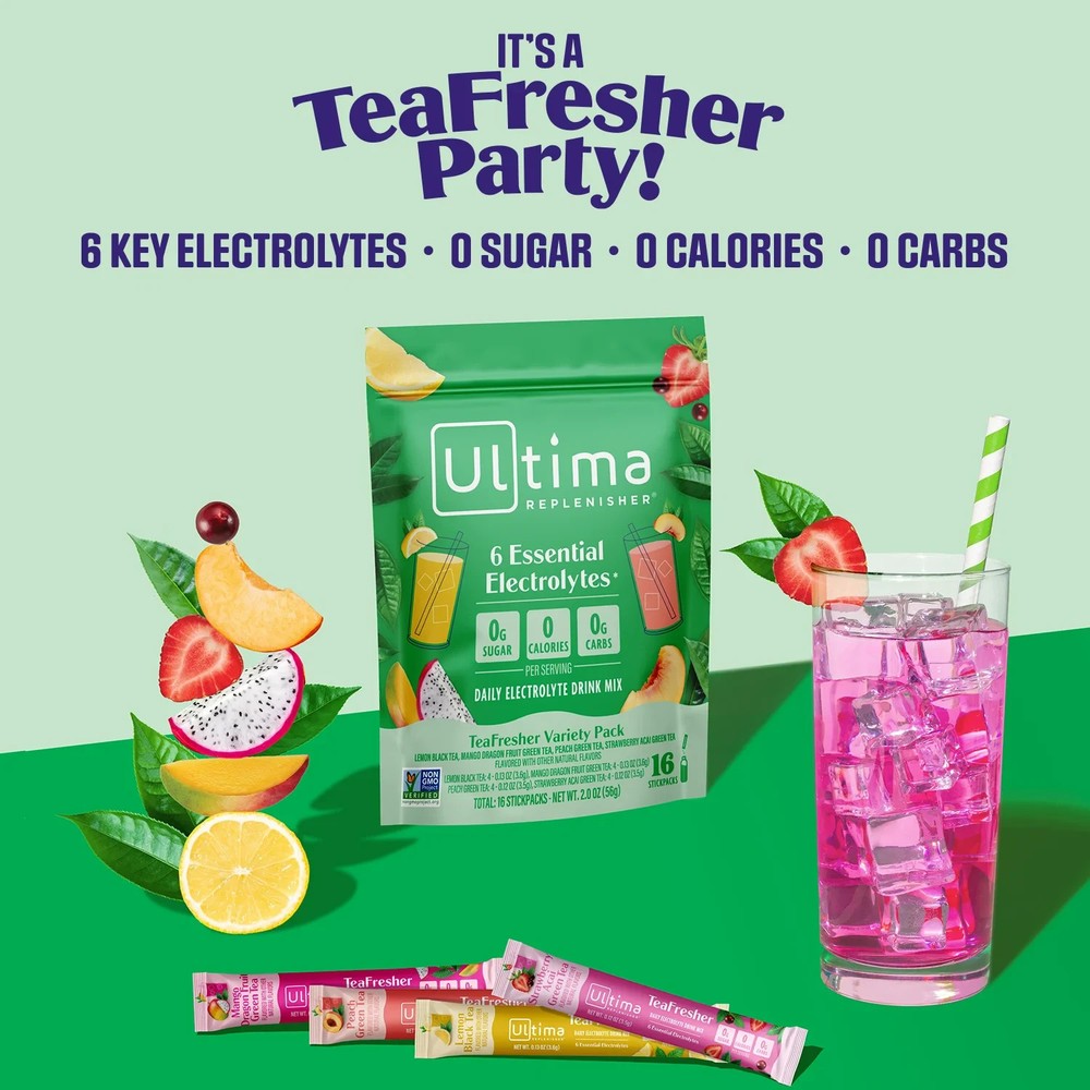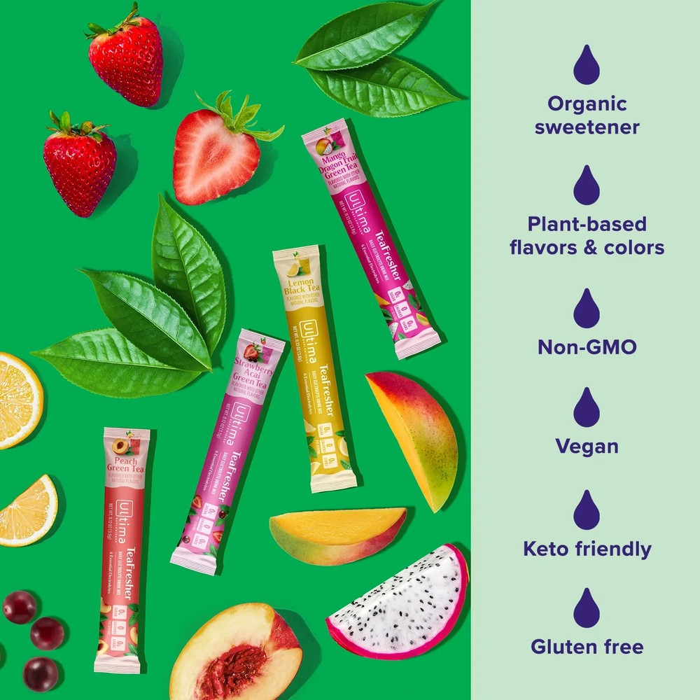 Ultima Replenisher TeaFreshers Daily Electrolytes Powder and Instant Tea Mix - Variety Pack, 16 Stickpacks - Hydration Packets with 4 Sugar-Free Fruit and Tea Fusions, 6 Key Electrolytes Simply add 1 stickpack of our hydration powder to 16 ounces of water and shake or stir well It’s a TeaFresher party: Come for the delicious fruit and tea fusions, stay for the sugar-free electrolytes; Ultima electrolytes powder delivers daily hydration packed with 6 key electrolytes, vitamin C and zinc, but without the sugar, calories or carbs Here for the tea: Made with 6 key electrolytes - magnesium, calcium, potassium, chloride, phosphorus and sodium, plus vitamin C and zinc - this naturally sweetened iced tea and fruity hydration powder fusion brings feel-good replenishment to the party Feel-good fusions: Fruity tea variety pack with Lemon Black Tea, Mango Dragon Fruit Green Tea, Peach Green Tea, and Strawberry Acai Green Tea; our electrolyte powder replenishes electrolytes with keto-friendly, plant-based flavors and colors Bring it with you: Unlike your average tea party, this 16-serving Variety pack of our fruit and tea electrolyte powder packets is perfect for bringing your iced tea mix on the go; simply add 1 stickpack to 16 ounces of water and shake or stir well The Ultima difference: We’ve spent over 25 years taking electrolyte hydration to a delicious new level; you deserve balanced hydration to replenish your body while you’re living your ultimate life, every day Drink Mix Type Electrolyte Drink Mixes Nutrient Content Claims Sugar-Free Food Form Powders Container Type Packet Ingredients Lemon Black: Magnesium Citrate, Citric Acid, Potassium Phosphate, Malic Acid, Natural Lemon and Tea Flavors (With other natural flavors), Calcium Lactate Gluconate, Potassium Aspartate, Calcium Ascorbate, Salt (Sodium Chloride), Organic Rebaudioside A (from Organic Stevia Leaf), Apple and Hibiscus Concentrate (Color), Decaffeinated Black Tea (leaf) Powder, Zinc Citrate and Manganese Citrate Peach Green Tea: Magnesium Citrate, Citric Acid, Potassium Phosphate, Natural Tea, Peach, and Lemon Flavors (with other natural flavors), Malic Acid, Calcium Lactate Gluconate, Potassium Aspartate, Calcium Ascorbate, Salt (Sodium Chloride), Organic Rebaudioside A (from Organic Stevia Leaf), Beta Carotene (Color), Beet Extract (Color), Green Tea Powder, Zinc Citrate and Manganese Citrate. Strawberry Acai Green Tea: Magnesium Citrate, Citric Acid, Natural Strawberry, Acai, and Tea Flavors (with other natural flavors), Potassium Phosphate, Malic Acid, Calcium Lactate Gluconate, Potassium Aspartate, Calcium Ascorbate, Salt (Sodium Chloride), Organic Rebaudioside A (from Organic Stevia Leaf), Beet Extract (Color), Green Tea Powder, Zinc Citrate and Manganese Citrate Mango Dragon Fruit Green Tea: Magnesium Citrate, Citric Acid, Potassium Phosphate, Malic Acid, Natural Mango, Dragon Fruit, and Tea Flavors (with other natural flavors), Calcium Lactate Gluconate, Potassium Aspartate, Calcium Ascorbate, Salt (Sodium Chloride), Organic Rebaudioside A (from Organic Stevia Leaf), Beetroot and Carrot Extracts (Color), Green Tea Powder, Zinc Citrate and Manganese Citrate