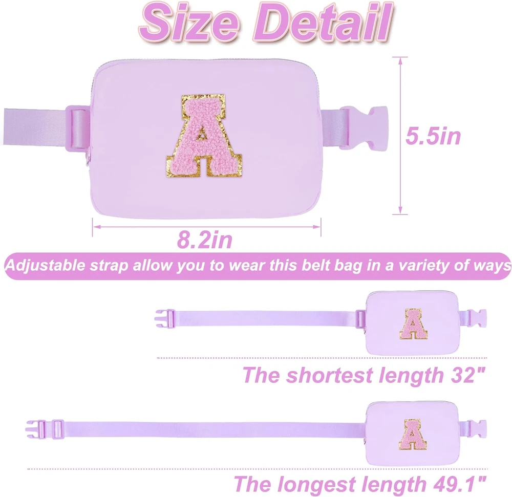 EXCLUSIVE A-Z LETTER DESIGN: Each letter on the belt bag has a special meaning. Therefore, it makes a special personalized gift as well as a meaningful keepsake. Let your beloved know that she is the most important person to you PICK YOUR STYLE: The adjustable shoulder strap allows you to wear this fanny pack in a variety of ways. It can be used as a crossbody bag, waist bag, shoulder bag or handbag.This belt bag will make your outfit look chic HIGH QUALITY MATERIAL:Made of waterproof nylon material,but please do not immerse it in water.This fanny pack is designed with a round metal zipper head and personalized initials for a stylish and elegant look IDEAL GIFT FOR HER: These personalized belt bags are both stylish and practical.We highly recommend it as a special gift/present for women,girlfriends and girls on birthday,anniversaries,weddings,Thanksgiving,Christmas,New Year,Valentine's Day,Mother'Day FUNCTION: Our cute fanny pack is lightweight and easy to carry, roomy for phone, wallet, passport, keys and other small items,providing great convenience.Great for traveling or on the go Product Description