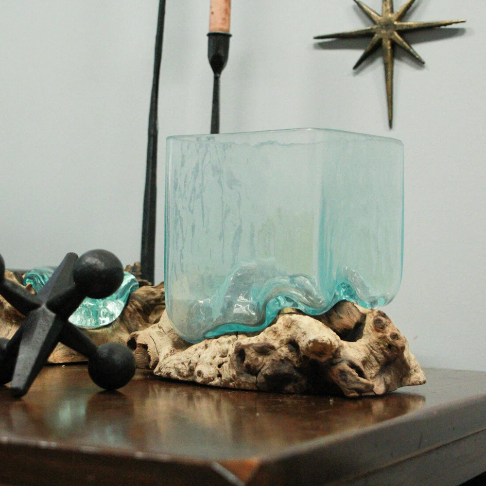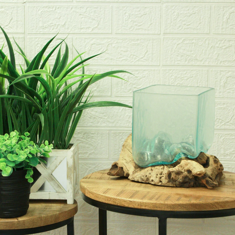 Versatile Size - This piece measures approximately 9 inches long, 8 inches high, and 7.5 inches wide, with slight variations due to its handcrafted nature, ensuring uniqueness in every item. Quality Craftsmanship - Crafted with care, this sculpture features a molten glass vase delicately formed over a teak driftwood base, creating an elegant and earthy decorative accent suitable for various purposes. Individual Beauty - The clear glass bowl is meticulously shaped over an organic wood base, resulting in a distinctive glassscape bottom, making it an exquisite addition to tables, counters, or desks, showcasing nature's artistry indoors. Our eBay Store About Us Add to Favorite Sellers Teak Driftwood and Melted Glass Square Vase, Bowl, or Planter – Approximately 8 Inches High – Nature-Inspired Elegance for Home and Patio Decoration Versatile Size - This piece measures approximately 9 inches long, 8 inches high, and 7.5 inches wide, with slight variations due to its handcrafted nature, ensuring uniqueness in every item. Quality Craftsmanship - Crafted with care, this sculpture features a molten glass vase delicately formed over a teak driftwood base, creating an elegant and earthy decorative accent suitable for various purposes. Individual Beauty - The clear glass bowl is meticulously shaped over an organic wood base, resulting in a distinctive glassscape bottom, making it an exquisite addition to tables, counters, or desks, showcasing nature's artistry indoors. Natural Charm - Ideal for succulent gardens, air plants, greenery, herb cultivation, or crafting personalized terrariums and fairy gardens, this piece adds a touch of the natural world to any space, bringing a sense of tranquility and beauty. Perfect Gift - Whether for your home or as a thoughtful present for loved ones, this unique and versatile glass and teak sculpture makes an excellent gift choice, showcasing the beauty of nature through artistic craftsmanship. Experience the perfect fusion of nature and artistry with this captivating sculptural vase. The square bowl, crafted from molten glass, features organic shapes that beautifully capture nature's essence. Its elegant design is complemented by the natural contours of teak driftwood, creating a striking contrast. Measuring approximately 9 inches long, 8 inches high, and 7.5 inches wide (sizes may vary slightly), this versatile piece offers endless possibilities for creative expression. Use it to showcase house plants, cultivate fresh herbs, or design a whimsical fairy garden. Alternatively, fill it with vibrant stones, shells, or dried flowers to create a stunning centerpiece. The transparent glass, with its molten elegance, enhances any space with its organic charm. Whether used as a decorative focal point, a terrarium, or a vessel for floral arrangements, this piece adds a touch of natural allure to your home. Each element is expertly crafted by artisans, embodying the beauty of nature and enriching your décor with unique sophistication. Product Details Color Brown Height 8 Length 9 Weight 6.3 LB