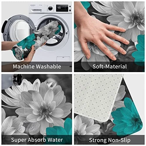 Antibacterial treatment: Flannel Indoor Outdoor Usage: Outdoor, Indoor Product Dimensions: 24"L x 16"W Item Width: 1 Theme: Flowers gtin13: Does Not Apply Product Care Instructions: Machine Wash Back Material Type: Rubber Type: Does Not Apply UPC: Does Not Apply Item Weight: 0.33 Pounds Room Type: Bathroom Included Components: Bath Mat Age Range Description: Adult Brand: Does Not Apply EAN: Does Not Apply Item Height: 1 Manufacturer: Does Not Apply Rug Form Type: Doormat Style: Modern Water Resistance Level: Not Water Resistant Size: 16"x24" MPN: Does Not Apply Batteries required: No Shape: Rectangular Color: Teal Grey Floral Special Feature: Non-slip Pattern: Floral Number of Pieces: 1 Material: Polyester Item Thickness: 0.4 Inches Is Stain Resistant: Yes Item Length: 1 Construction Type: Machine Made Pile Height: Low Pile
