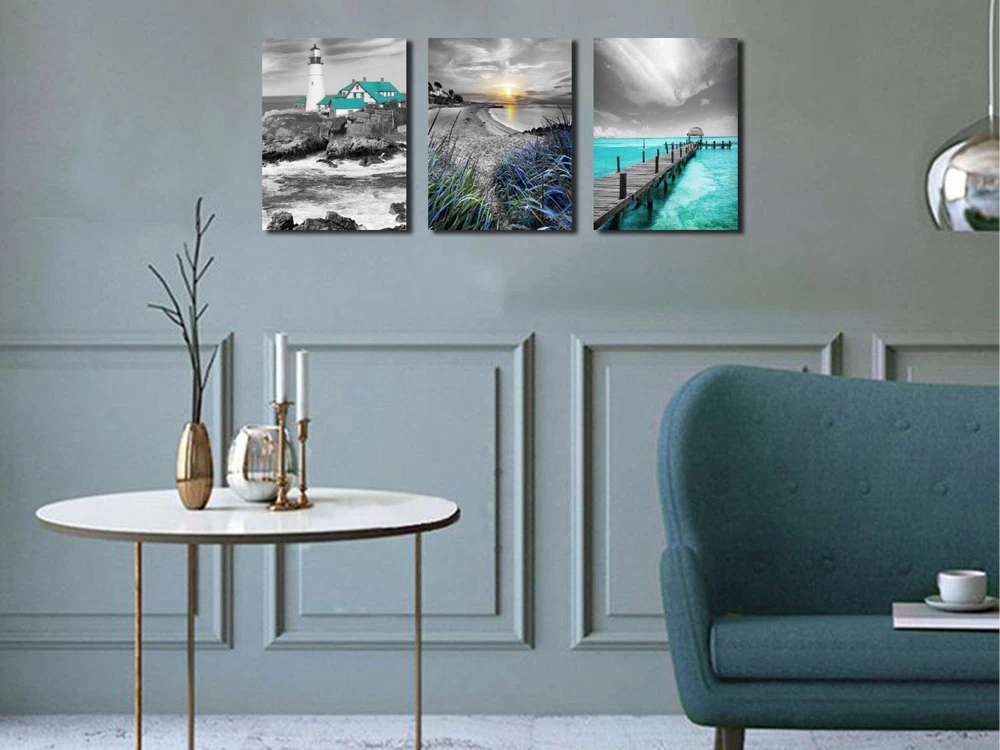 Canvas Wall Art Ocean Seascape Blue Painting Prints Modern Teal Lighthouse Pictures for Bathroom Kitchen Bedroom Spa Wall Decor . Red Flowers Painting Description: *HD prints on thick canvas with vivid color, waterproof, non-fading, dust proof features. *Each canvas panels already framed and stretched over solid pine wood bar with hook accessories nailed, easy to hang. *Each panels edges of paintings are also printed to make it get perfect 3D effect, perfect wall decoration for home and office to make you feel relax while working or get off work. About Us: Art are art creator and manufacture over 10 years experience for 100% hand painted oil paintings and canvas prints artwork. We are professional online supplier for modern canvas wall art, handmade oil paintings, acrylic paintings, watercolor paintings, abstract art paintings. We 30 days money back and make you rest assure to purchase our products with high quality and affordable price. Wall Painting Decoration Guide : Perfect choice for bedroom, living room, guest room, meeting room, bathroom, dinning room, coffee bar, nurseries house, hallway, corridor, college dormitory, hotel, inn, spa, lounge, salon, home and office decor. Perfect Gift Idea : Best choice gift idea for holiday, wedding, Christmas, Valentine's Day, Anniversary, Father's Day, Mother's Day, Birthday. Warm Tip for Size : The painting displayed in the pictures above provides an idea of how this canvas art printing looks like on your wall. It does not represent the exact size of the printing. Please measure your wall before you choose the ideal size. Due to the different brands of monitor setting, the printing colors may appear slightly different. If you have any questions, please us directly. We will try our best to help you within 12 hours, hope you have a enjoy shopping experience in . Teal Ocean Wall Art Size: 12inx16inx3pcs(30cmx40cmx3pcs), framed gallery wrapped ready to hang. Making this wall art a striking focal point in any room and sparking conversations with its charm Teal Wall Art Feature: High definition superior inject machinery printing on good quality canvas,waterproof, non-fading for many years. Gallery T with wooden bar inner and hooks mounted on each panels, simply assemble for wall decor Wall Art: Wall decor and gift idea for Thanksgiving Day, Christmas, New Year, holiday, wedding, Valentine's, Anniversary, Father's Day, Mother's Day, Birthday etc Suitable places: Living room, bedroom, kitchen, dinning room, bathroom, guest room, master bedroom, over fireplace, home, office, porch, salon, spa, hallway, stairway, waiting room wall decoration This design is a timeless symbol of guidance and hope, making this wall art a striking focal point in any room and sparking conversations with its charm