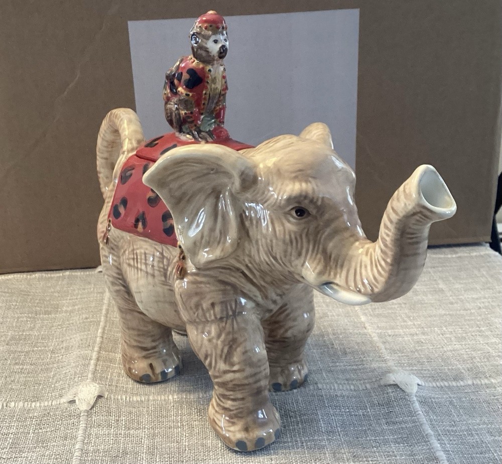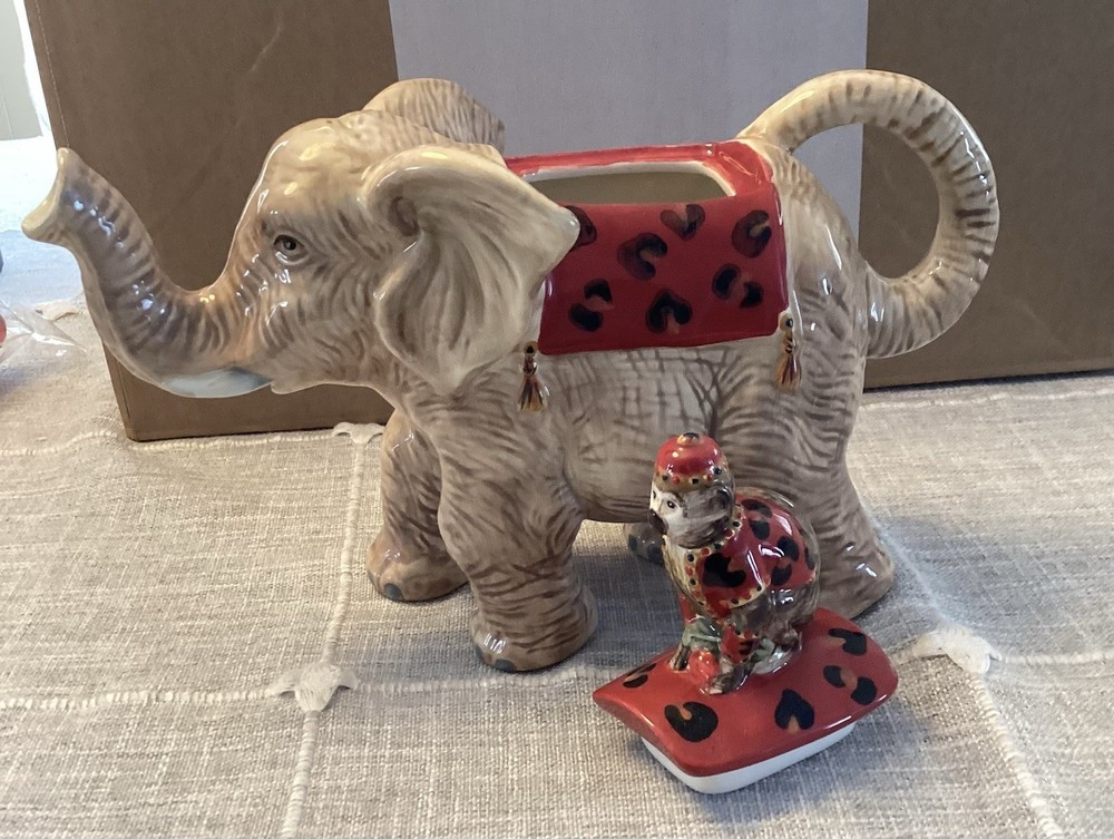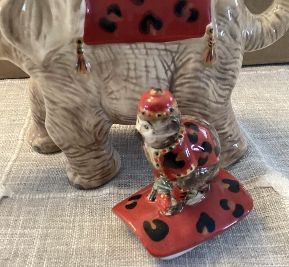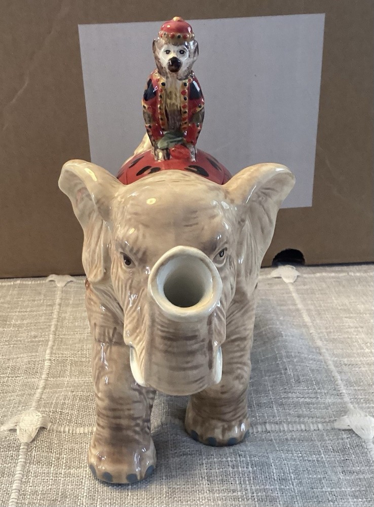 This vintage ceramic elephant with a monkey teapot is a unique and charming piece by clay art. The multicolor design gives it a whimsical and playful feel, perfect for serving tea in a fun and artistic way. Made from ceramic material, this teapot adds a touch of vintage charm to any kitchen or dining room decor. Its imaginative theme and high-quality craftsmanship make it a collectible item that is sure to stand out in any tea set collection. Perfect condition. No chips or cracks. Measures 10 x 8.5”.