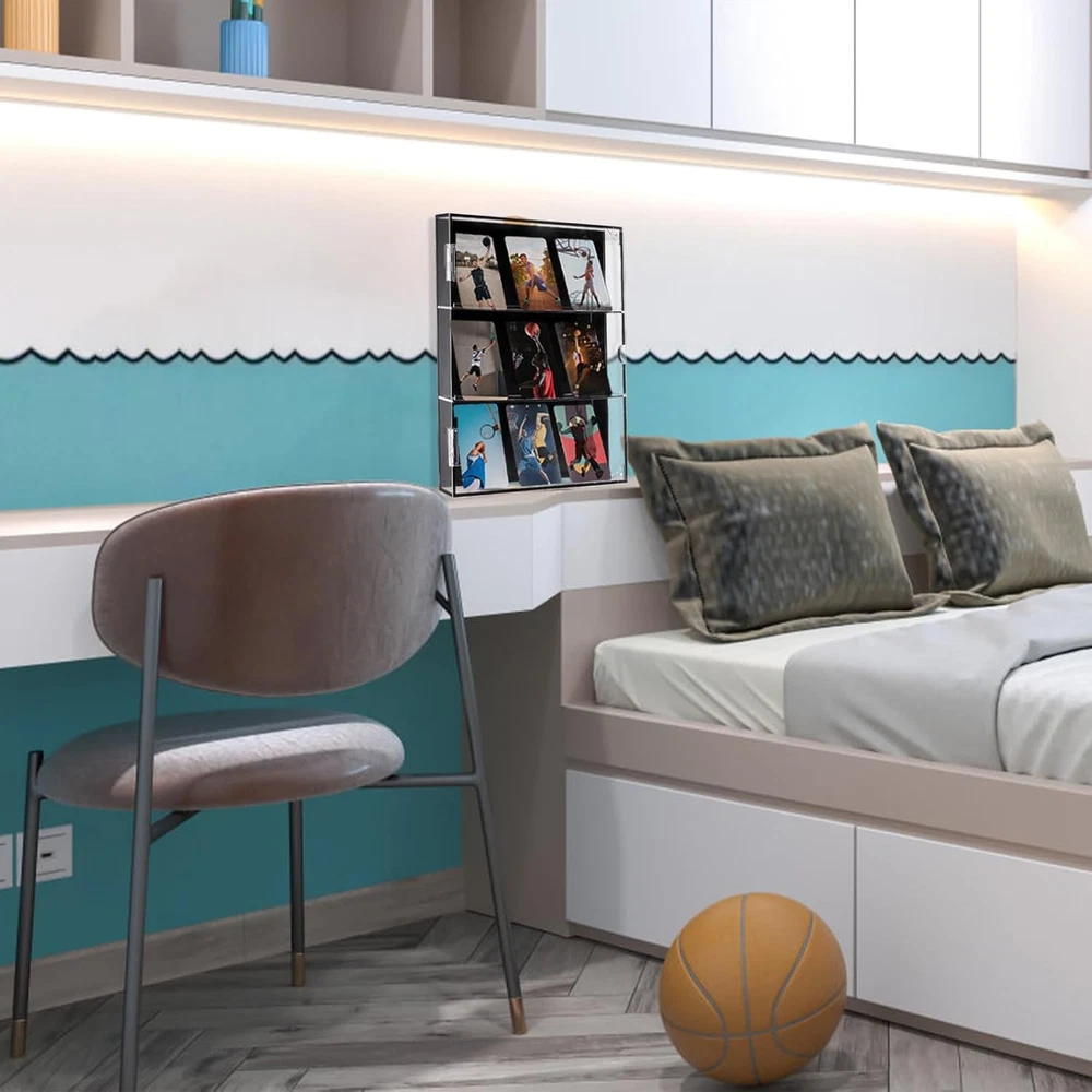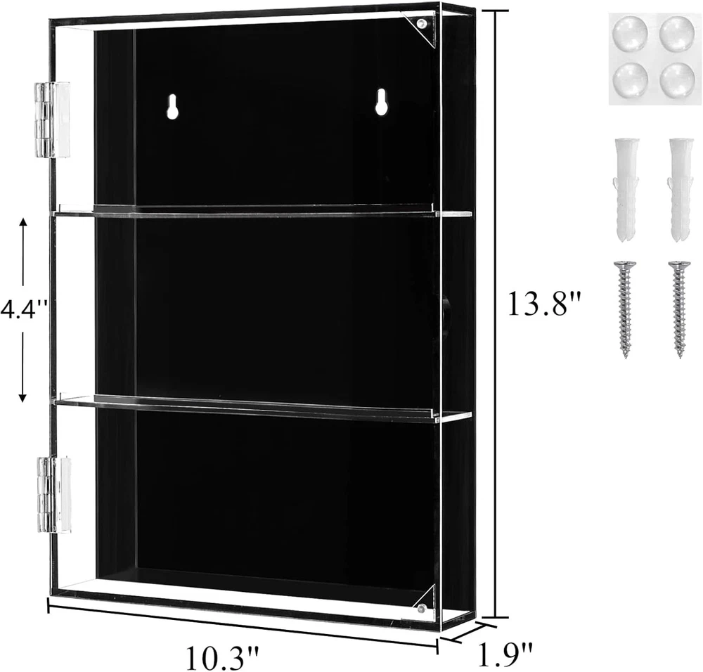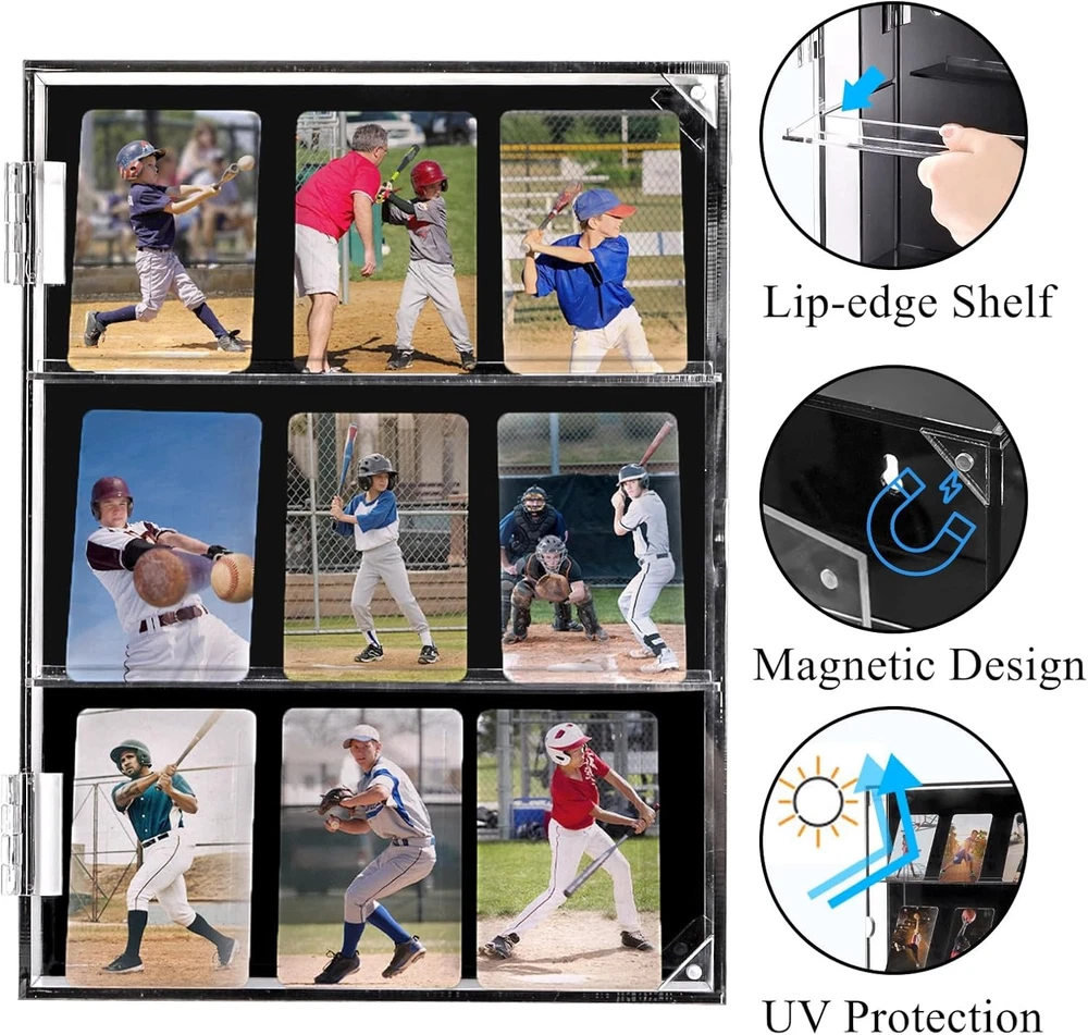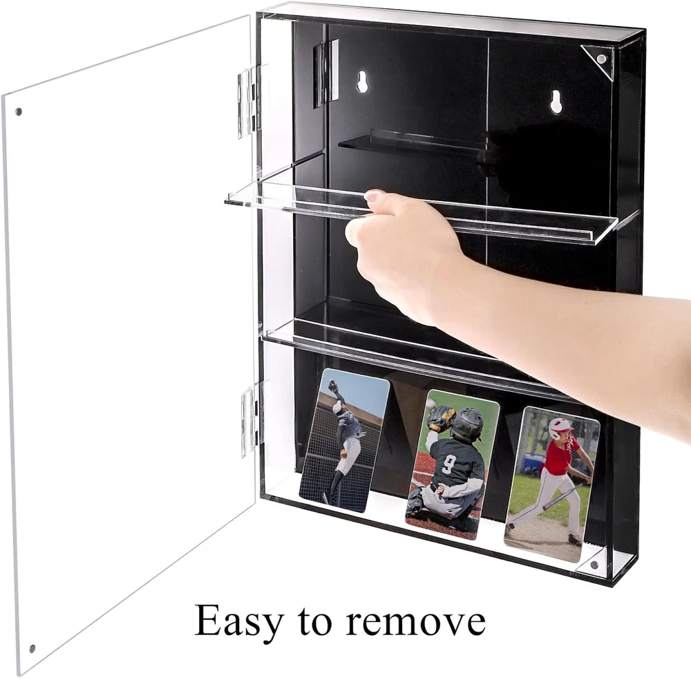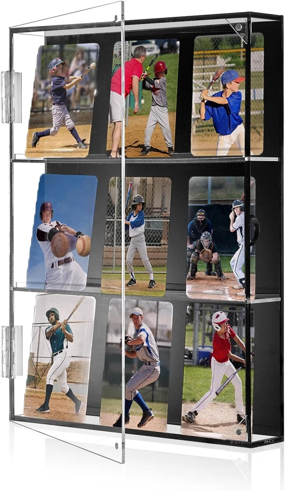 Tebery Baseball Card Display Case Acrylic, Sports Trading Black Transparent Product Details Mounting Type: Wall Mount, Tabletop Mount Frame Size: 12.3 x 1.5 inches Shape: Rectangular Manufacturer: Tebery Product Dimensions: 10.3 x 1.9 x 13.8 inches Item Weight: 2.51 pounds Item model number: Baseball Card Display Case Assembly required: No Batteries required: No Color: Black Transparent Brand: Tebery Product Dimensions: 10.3"L x 1.9"W x 13.8"H Frame Material: Acrylic Item Weight: 1.14 Kilograms Sports Card Display Case: This display case overall measures 10.3''L x 1.9''W x 13.8''H, inside depth: 1.5", space between shelves: 4.4". It can display up to 9 standard sports cards at a time, fitting for baseball, basketball, hockey, football cards, or any other cards that are no more than 4.4'' tall. NOTE: Cards are not included. Does not fit 9 graded cards. Sturdy and Stable: Made of acrylic, it is sturdy and stable, no need to worry about breakage. You can put the baseball card display case directly on the table, or you can hang it on the wall. Waterproof and UV protection acrylic door can protect your items from yellowing or fading, offering clear 180-degree visibility to your cards. Convenient Design: The shelf lips of this solid card cabinet collector keep the cards from sliding around or falling. Detachable shelves make it more practical. It can display cards of almost any size by removing the shelves. The magnetic door and slotted design makes it easier for you to open and close. No need to worry about forgetting to lock the door. Easy to Use: The shelf is very easy to remove. You can use it as a three-layer, two-layer or as a whole display case by removing shelves. The magnetic door design ensures tight closure, providing UV protection and keeping your cards away from dust. The top of this card case can display some other items. Multiple Applications: Designed for baseball, basketball, football, hockey, sports trading, toy games, graded cards, this wall mount trading card display frame can show the displayed things inside clearly. You can also display some other things in it. Classic look makes it suitable as a decoration for your home.