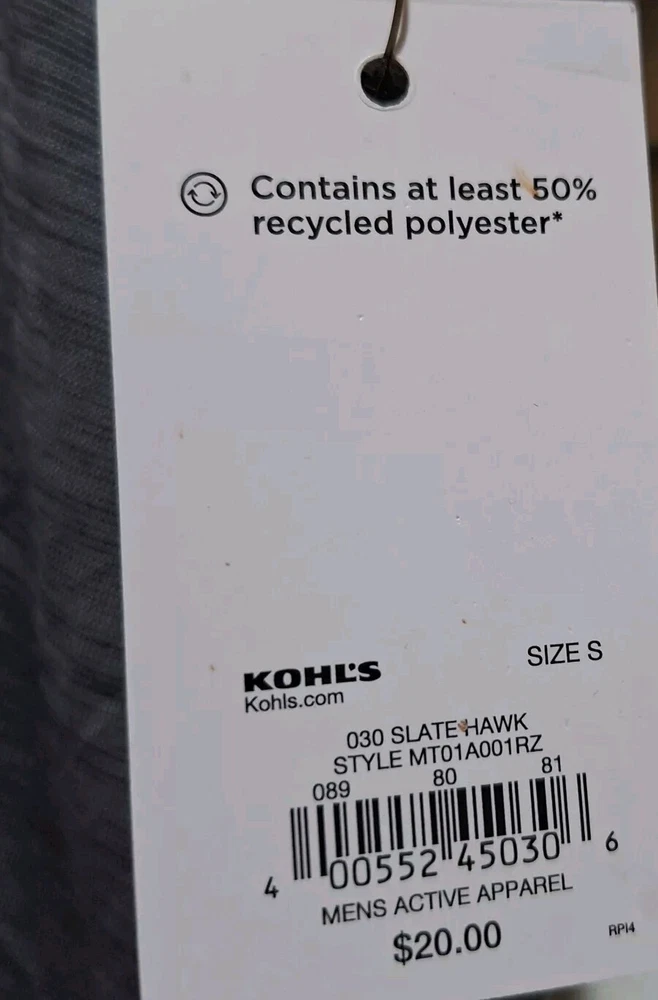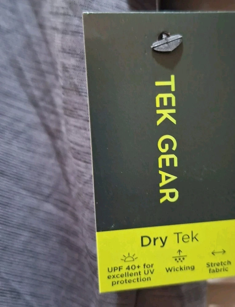 Tek Gear Dry Fit Slate Gray UPF 40 T-Shirt Men's Size Small NEW 100% polyester (50% recycled polyester). Brand new with tags from a smoke-free home. Approximate flat lay measurements: Pit to pit: 19.5", Length from shoulder to hem: 28".