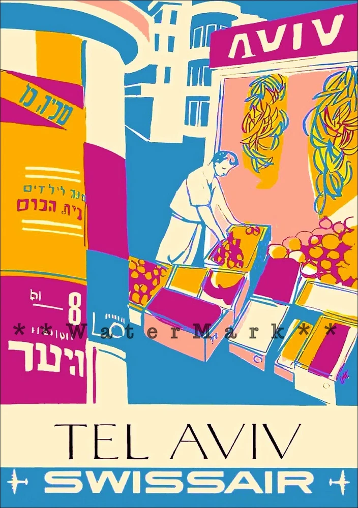 Tel Aviv Israel 1951 Swiss Airline Great colors, Israeli market place Vintage Poster Print Retro Style Restored Art ***We offer Free US Postage or Reduced Postage for Canada & Worldwide. **No charges for additional prints worldwide. ***These are not framed or stretched or mounted NOTE:**Delivery dates shown are only "Suggested" Order Early To Avoid Post Delay Dramas **Read Please: The print looks best with a nice mat (passe - partout or passepartout ) and frame. These prints are the exact proportion as the original and will not be stretched to fit the paper or canvas...this would cause a distorted print The image will be the exact aspect ratio as per the original poster, so there might be more white on the top and bottom, or side to side. Options available..use the drop-down menu * Watermark will not be on your image. *Cloth Canvas an artist canvas used also in museums and art galleries *Photo Gloss Paper is a high-quality Professional Photo paper *Matte Photo Paper is a great solution if you do not want a Gloss, this paper is great with colors *Luster Photo Paper this photo paper is neither glossy or mat. Glossy paper has a smooth texture, luster paper is slightly textured. This option is a good choice for something in between Metallic, Photo Gloss and Matte *Metallic Pearlescent Photo Paper is a very high-quality paper with a Pearlescent sheen, a glossy finish, and unique metallic appearance, these prints have extra visual interest and depth. This paper uses a combination of film laminate layers that produce striking, dimensional, lasting images on an ultra-bright background. The effect is sometimes described as "chrome on paper." This is NOT a metal plaque, it is a photo paper This poster print will be shipped in a sturdy container. We will ship usually within 24 business hours of payment, except for weekends or US Holidays If there is a question, please do contact me All is done to send you the best quality poster image. Don't forget to check out the Sales. There is a great Buy 3 Get 1 Free Offer!! Shipped with no extra postage..Worldwide! There are a variety of reasons why the images on your monitors don't match each other. The simplest is that each monitor is different; even monitors with the same model won't have colors that match up perfectly We are located, print and ship only from the USA The art is not AI generated, these are restored prints from originals