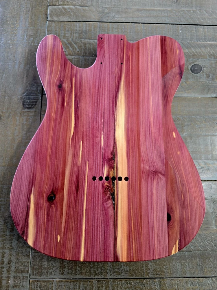 This Telecaster-style body features Eastern Red Cedar. Sanded to 320 and ready for further finishing. (Wiring and Jack holes are drilled) Neck Pocket: 0.625" Neck Pickup: 0.75" Bridge Pickup: 0.875" Jack Hole: 7/8" String Spacing: 54mm Vintage Ferrules: 5/16" (Fits fender brand ferrules) Weight: 4lb 10oz Item: M9JD For all available inventory visit Www.sawforgedwoodworks.com