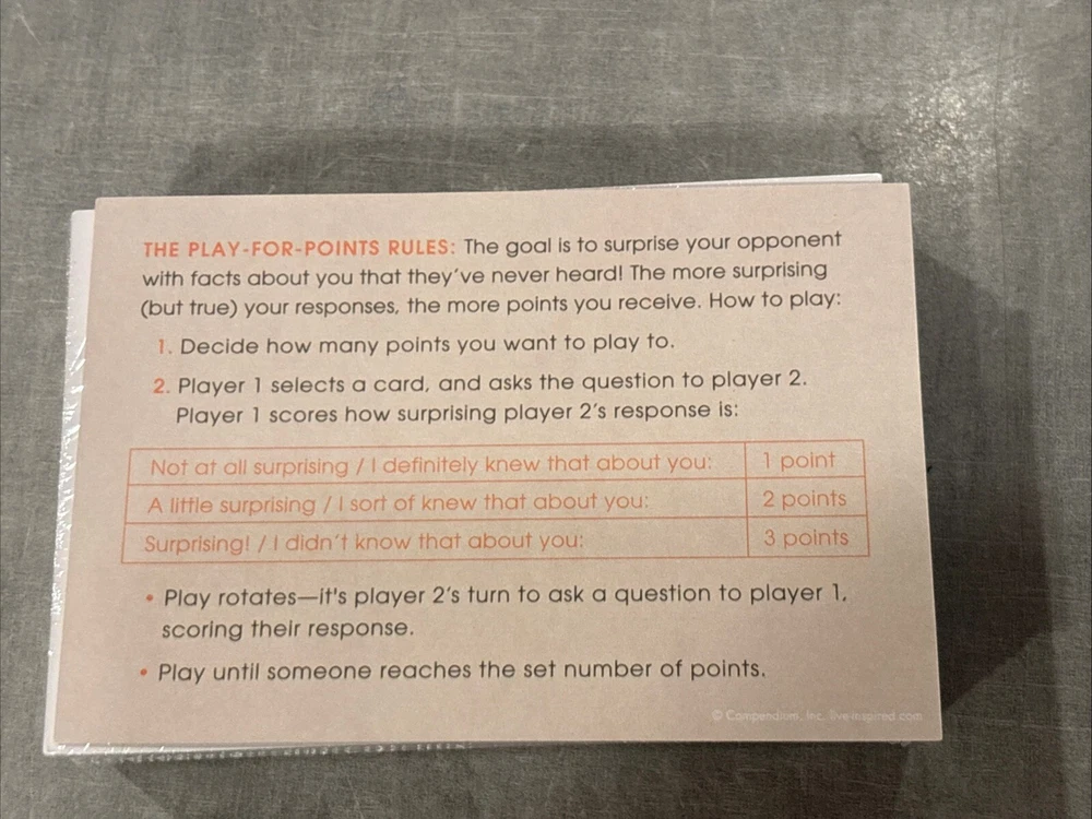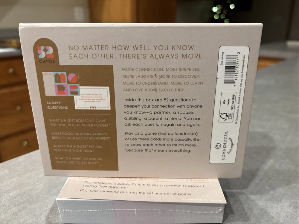 This game is perfect for anyone who wants to deepen their connections with others. With a set of conversation-starting questions, it can help people get to know each other better and build stronger relationships. The game is made by Compendium and comes in a package that measures 6.06x4.45x1.34 inches and weighs 0.58 pounds. It's a great addition to any toy or game collection and is suitable for people of all ages.