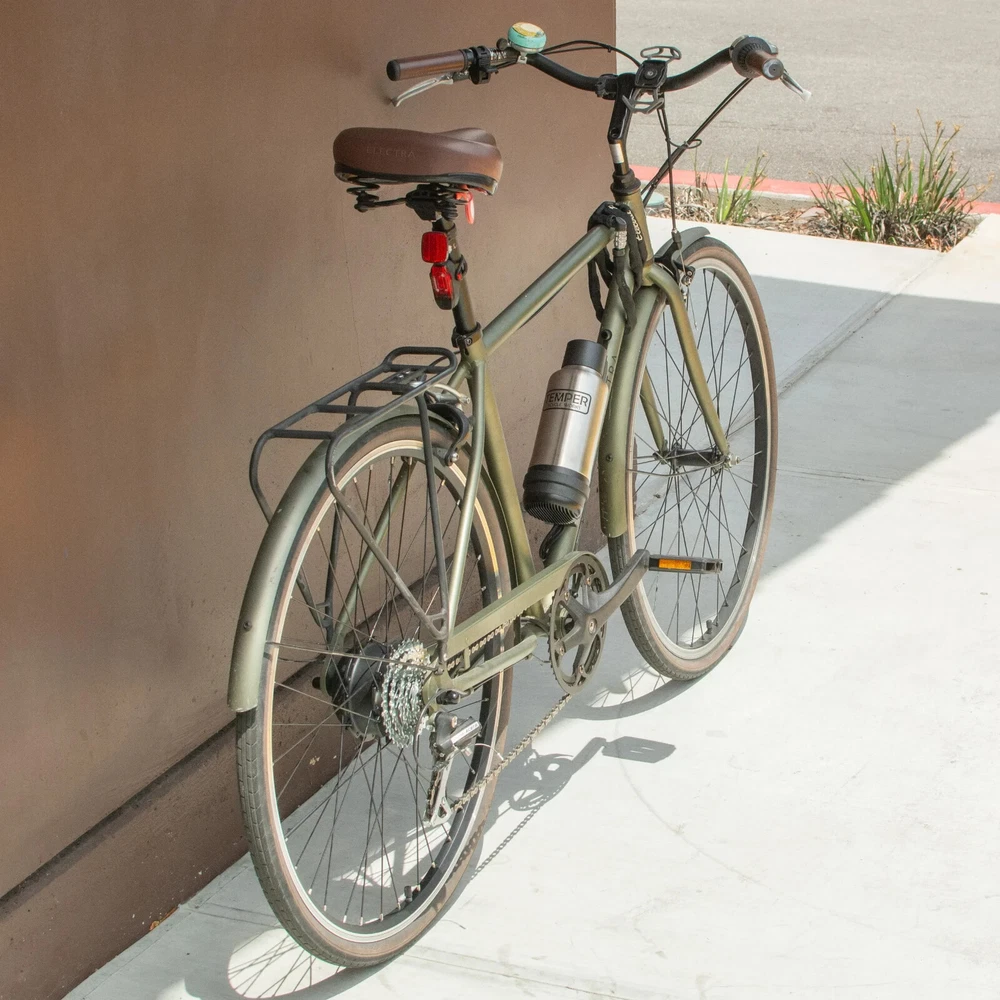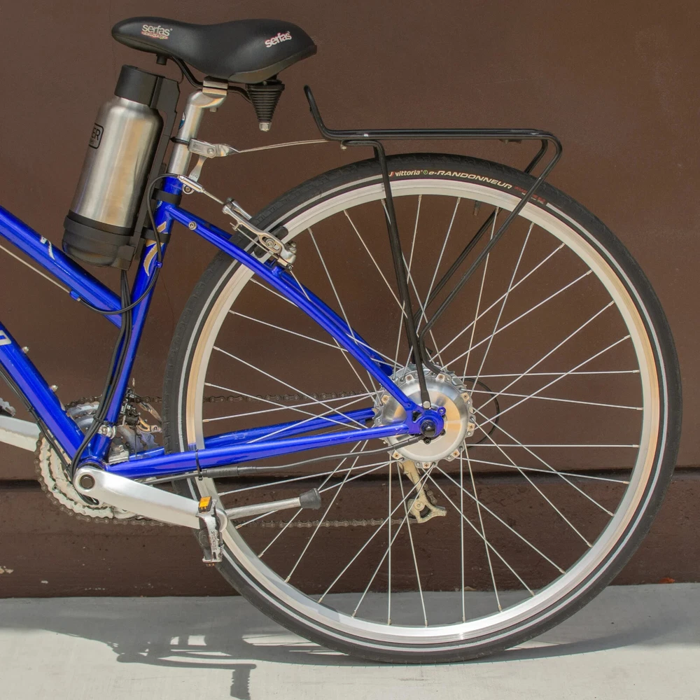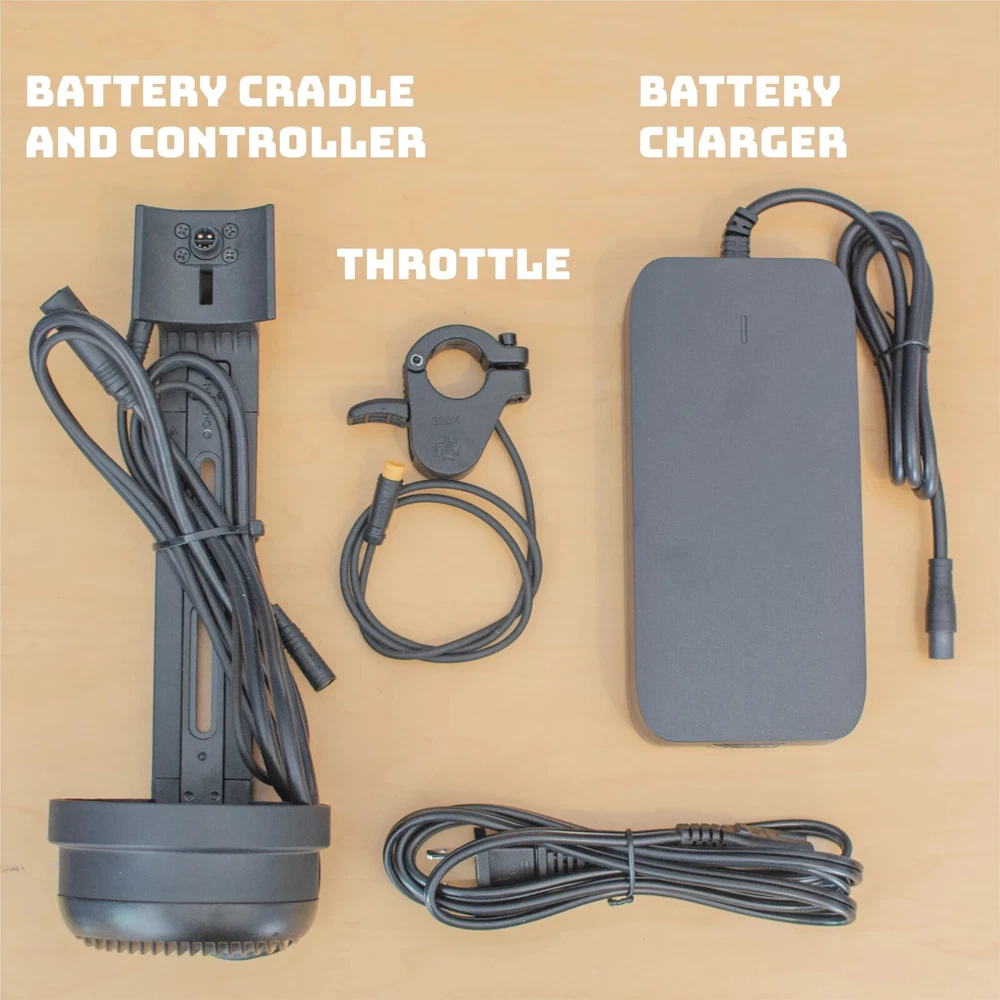 36V E-Bike Conversion Kit from Temper Bicycle Works Includes: 36V 10ah silver stainless steel battery with built in display, 5 levels of pedal assist and battery charge percentage 3A fast charger 500W controller built into battery mount for easy installation. Universal thumb throttle Pedal assist sensor built into rear wheel 26" black rear motor wheel, with machined silver sidewall, disc and rim brake compatible, 135mm axle width Brand new with 1 year manufacturer warranty
