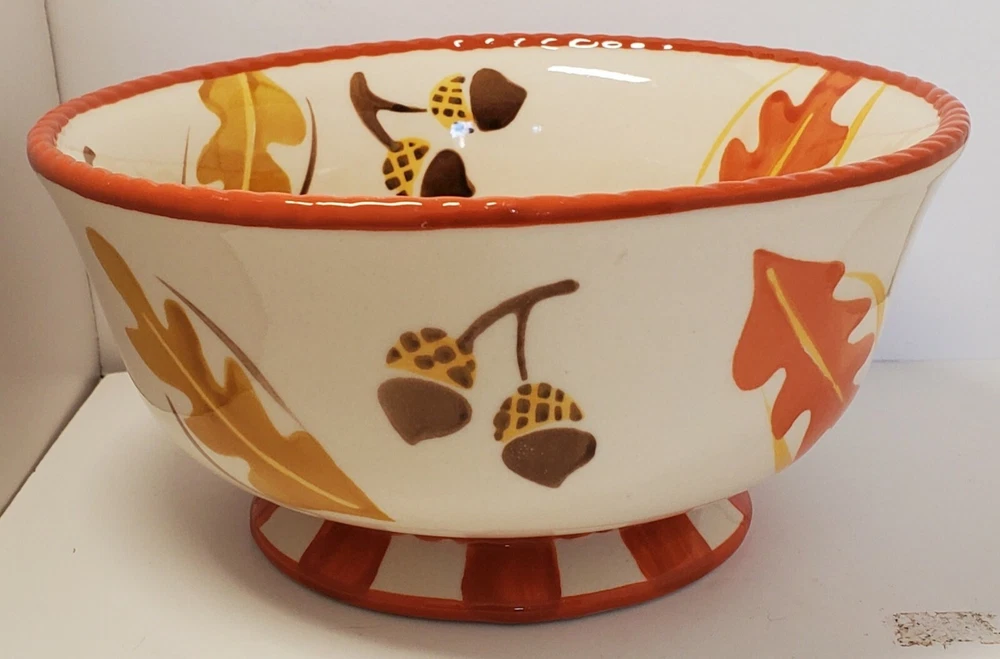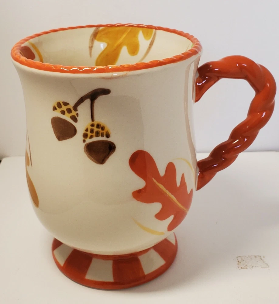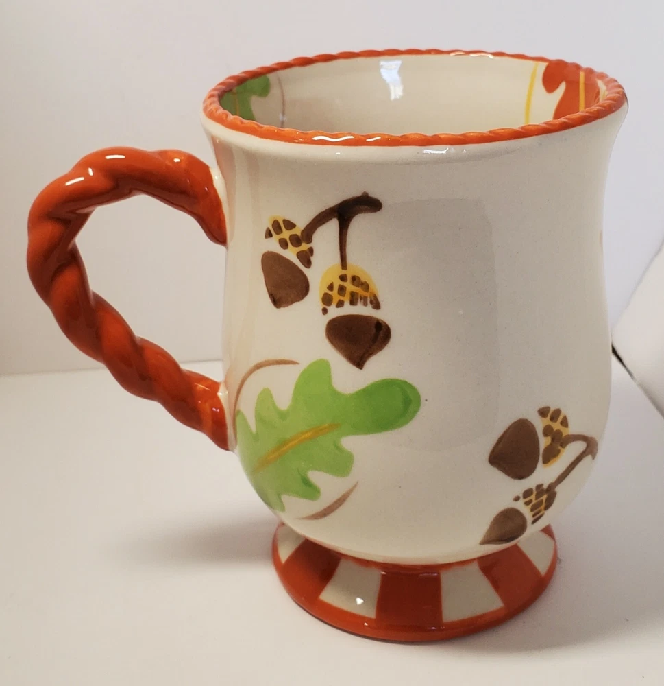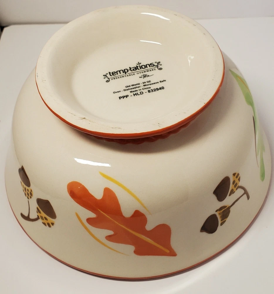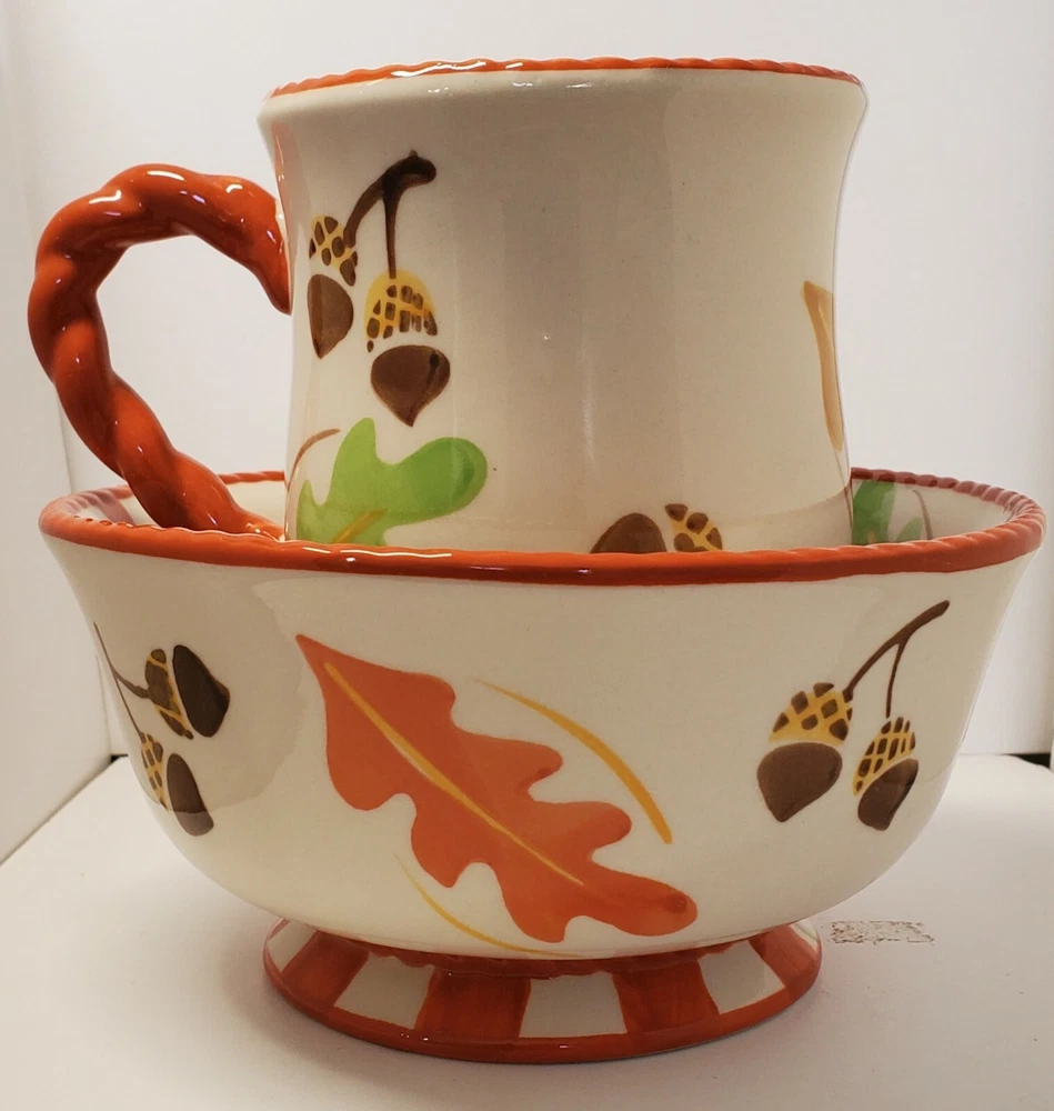 Temptations Old World Fall Leaf & Acorn 24 Oz Bowl (3" tall x 7" diam) & 16 Oz Footed Mug (5" tall x 6" wide at handle) Custom 2 piece set. This set would be nice in a basket with assorted tea or coffee and oatmeal; or hot chocolate and ice cream sprinkles. No chips/cracks noted. Please see photos. Also, please look at my other Temptations listings.