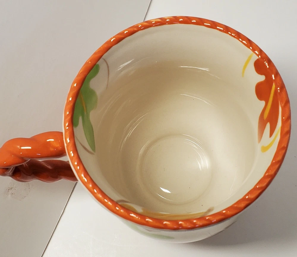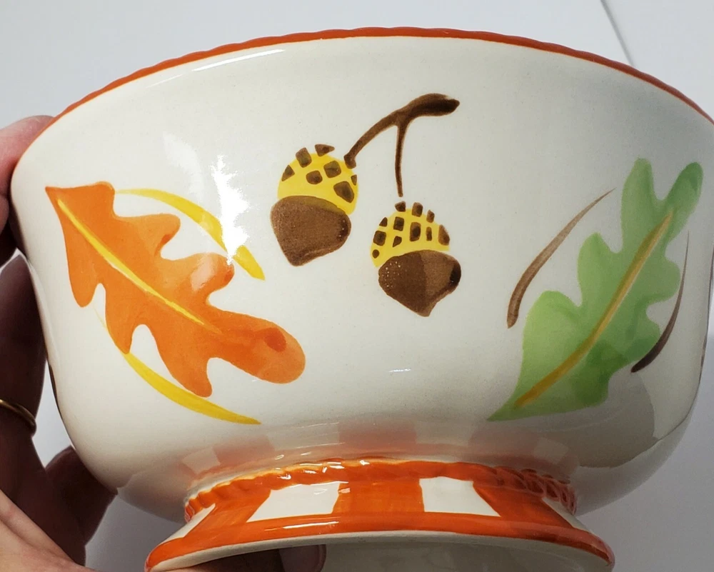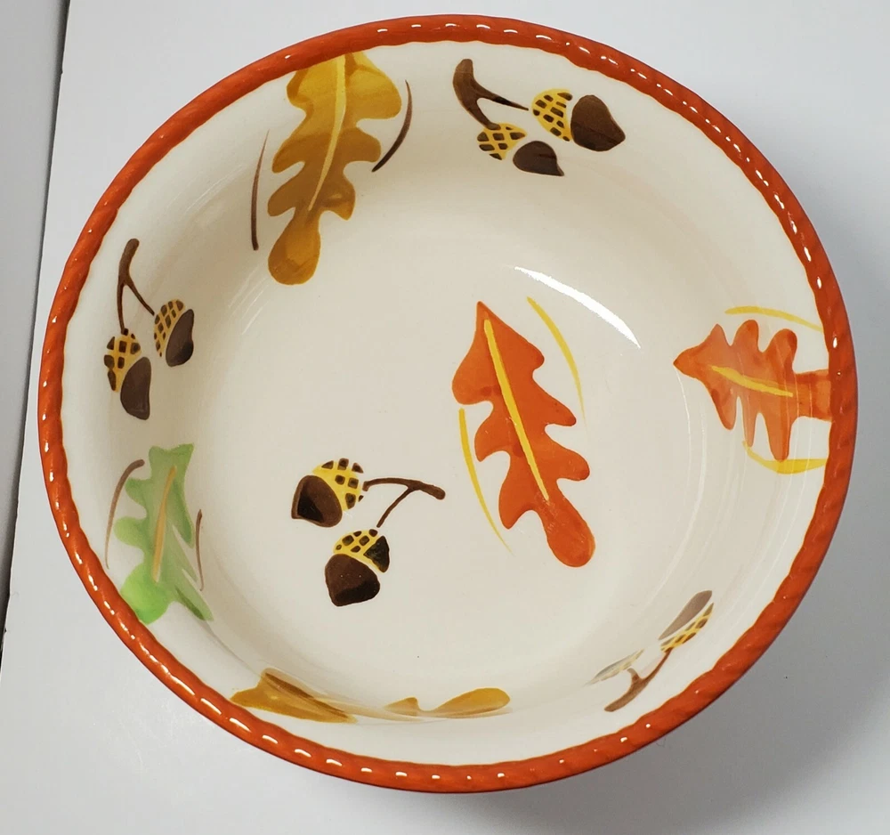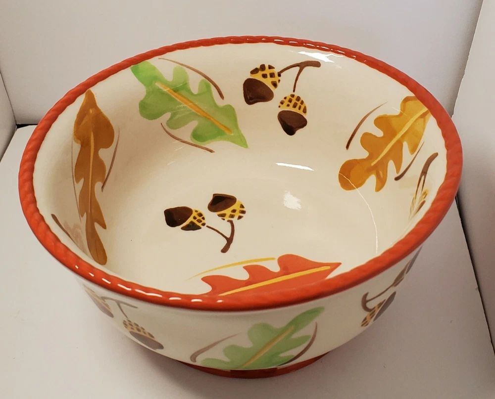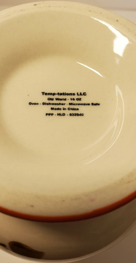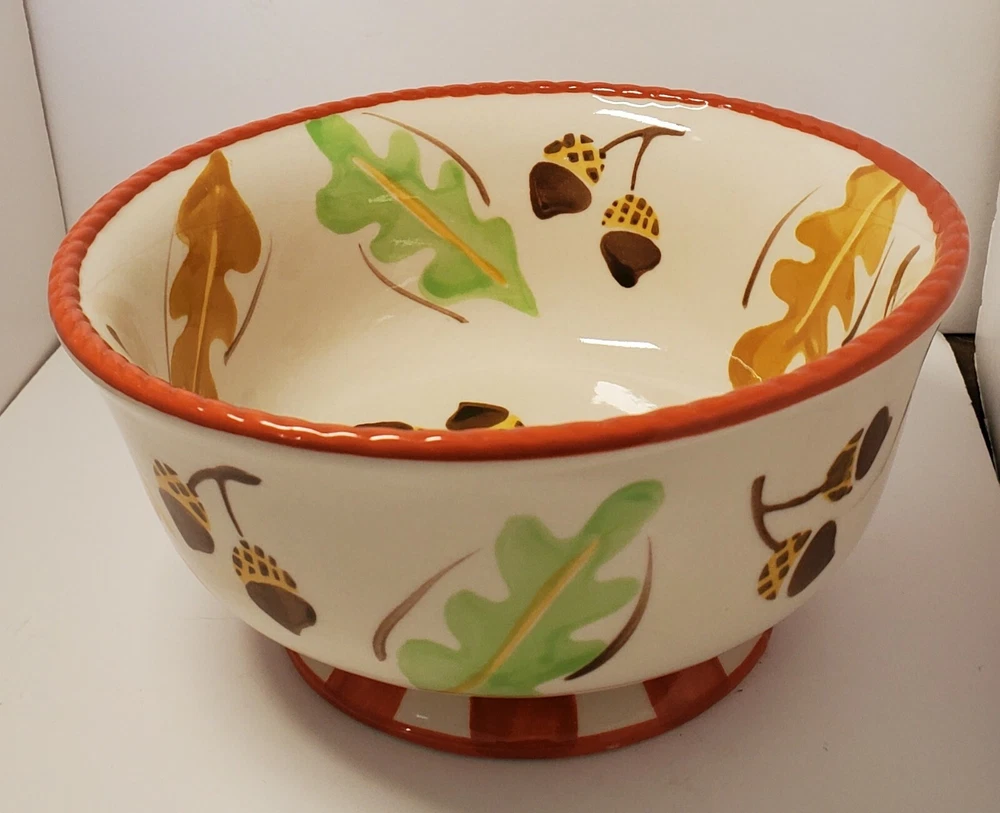 Temptations Old World Fall Leaf & Acorn 24 Oz Bowl (3" tall x 7" diam) & 16 Oz Footed Mug (5" tall x 6" wide at handle) Custom 2 piece set. This set would be nice in a basket with assorted tea or coffee and oatmeal; or hot chocolate and ice cream sprinkles. No chips/cracks noted. Please see photos. Also, please look at my other Temptations listings.