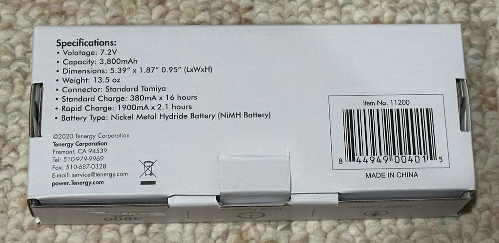 New never used Power up your radio-controlled car or flashlight with the Tenergy 7.2V 3800mAh 6-Cell NiMH Rechargeable Battery Pack. Specifically designed for RC cars and tanks, this reliable energy source boasts a high capacity that provides extended run times, ensuring your enjoyment is uninterrupted. The Tamiya plug compatibility makes it easy to power up your favorite models without the need for modifications. The battery pack features robust NiMH technology, offering a consistent and safe power delivery. With its versatile applications extending to flashlights, this battery pack is a suitable choice for a variety of devices. The model number 7.2V 6S 3800mAh NiMH Battery Pack, along with the manufacturer's part number 11200, ensures you're getting a genuine product with dependable performance.