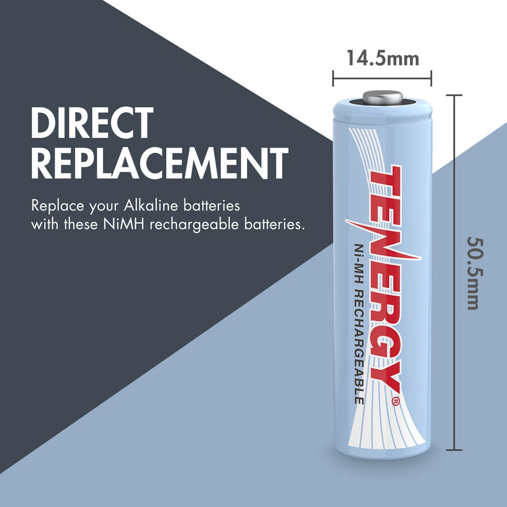 WELCOME TO THE OFFICIAL TENERGY EBAY STORE BATTERIES Standard Rechargeable Batteries AA AAA C D 9V Combos/Kits ALL NICD (AA, C, D, & SUB C) Standard Lithium Rechargeables 18650/14500 CR123A (164340) 9V SIZE Standard LiFe Batteries SLA (Sealed Lead Acid) Non-Rechargeable / Primary Akaline (AA, AAA, C, D, 9V) Lithium CR123A, CR2, 1/2 AA Button Cells Tech / Single Cells (ALL) NIMH | Sub C, A/AF, F, more NICD | Sub C, AA,C, more Li-Ion Single Cells Li-PO Single Cells LiFe Single Cells Hobby Batteries Airsoft RC Cars Drones, Planes, Heli's For Products Power Tools Roomba Batteries Solar Garden Lights BATTERY PACKS Li-Ion Packs NiMH Packs Airsoft RC Cars Drones, Planes, Heli's CHARGERS For Standard Batteries For 18650 & RCR123A For Battery Packs NiMH/NiCD Packs Li-Ion/LiPO Packs LiFe Packs TOYS Quadcopters/Drones STEM HOME/ELECTRONICS LED Lighting Bluetooth Mobile Accessories Combo: Tenergy AA 2500mAh / AAA 1000mAh NiMH Rechargeable Batteries Cells Ni-MH Lot REPLACE STANDARD BATTERIES - These NiMH rechargeable batteries measure 50.5mm (length) x 14.5mm (diameter) for AA and 44.5mm (length) x 10.5mm(diameter) for AAA. MONEY SAVING & ECO FRIENDLY - Tenergy NiMH batteries can be recharged up to 1000 times. You are also diminishing the carbon footprint by limiting the waste caused by disposable batteries. Switch over. Save. Reuse. Recharge with Tenergy. EVERYDAY USE - Our ideal rechargeable high capacity replacement AA/AAA cell is ideal for high/low draining electronic items. Use it in all your household everyday devices such as LED lights, flashlights, solar lights, night lights, calculators, remotes, controllers, cordless phones, RC toys, headlights, garden lights, headsets, alarm-clocks and many more. PERFORMANCE LASTING - At a battery capacity of 2500mAh for AA and 1000mAh for AAA, Tenergy rechargeable 1.2V NiMH battery keeps your devices running longer. NO MEMORY EFFECT - With no memory effect on our rechargeable AA/AAA NiMH batteries, charge your batteries anytime. Even when they are close to full or partially drained you won't have to worry about long term memory effects and will still get the full capacity each use. How to choose correct size and quantity: Step 1: Choose battery size. Step 2: Select quantity: 4, 8, 12, 24, 60 or 120-pack Product Description Features And Benefits: REPLACE STANDARD BATTERIES - These NiMH rechargeable batteries measure 50.5mm (length) x 14.5mm (diameter) for AA and 44.5mm (length) x 10.5mm(diameter) for AAA. MONEY SAVING & ECO FRIENDLY - Tenergy NiMH batteries can be recharged up to 1000 times. You are also diminishing the carbon footprint by limiting the waste caused by disposable batteries. Switch over. Save. Reuse. Recharge with Tenergy. EVERYDAY USE - Our ideal rechargeable high capacity replacement AA/AAA cell is ideal for high/low draining electronic items. Use it in all your household everyday devices such as LED lights, flashlights, solar lights, night lights, calculators, remotes, controllers, cordless phones, RC toys, headlights, garden lights, headsets, alarm-clocks and many more. PERFORMANCE LASTING - At a battery capacity of 2500mAh for AA and 1000mAh for AAA, Tenergy rechargeable 1.2V NiMH battery keeps your devices running longer so that it doesn't fail you when you need it most. NO MEMORY EFFECT - With no memory effect on our rechargeable AA/AAA NiMH batteries, charge your batteries anytime. Even when they are close to full or partially drained you won't have to worry about long term memory effects and will still get the full capacity each use. Specifications Size: AA Voltage: 1.2V Weight: 26.5g Capacity: 2500mAh Dimensions: 50.5mm x 14.5mm Size: AAA Voltage: 1.2V Weight: 13g Capacity: 1000mAh Dimensions: 45.5mm x 10.5mm See Compatible Charger Recommendations: Tenergy 01474 Tenergy 01162 Tenergy 01160 Tenergy 01438 Compatible Chemistry NiMH & NiCD NiMH & NiCD NiMH & NiCD NiMH & NiCD Charging Slots 4 8 12 16 Charging Rate AA & AAA: 450mA per hour AA: 500mA per hour AAA: 250mA per hour AA: 500mA per hour AAA: 250mA per hour AA:500mA per hour AAA: 250mA per hour Display LCD LCD LCD LCD Powered By USB AC Wall Adapter Car Adapter AC Wall Adapter AC Wall Adapter Car Adapter *Note: charger recommendations above are some options from Tenergy. This battery can be used with any other branded chargers as long as it supports NiMH batteries. Extend Your NiMH Battery Life With The Following Practices Do not over-charge the battery, remove the battery from charger when you are done recharging. Heat lowers battery life, do not charge or discharge the battery when it's hot. Always let the batteries cool down to room temp before using it/charging it. Do not store the battery with low voltage, recharge after each use to avoid over-discharge. Always store the battery in a dry and cool place, never expose it to heat or direct sunlight. Recharge the battery once every 6-months, if they will be unused or stored long term.