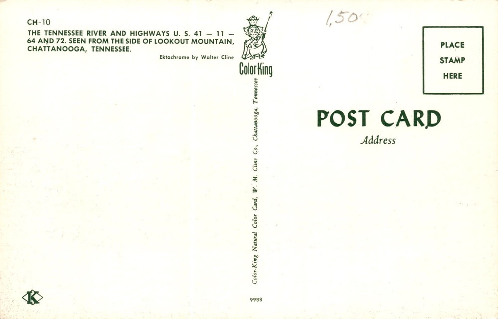 This postcard depicts a view of the Tennessee River and highways U.S. 41, 11, 64, and 72 as seen from the side of Lookout Mountain in Chattanooga, Tennessee. The image was captured using Ektachrome by Walter Cline, a renowned photographer known for his vivid and high-quality color photography.