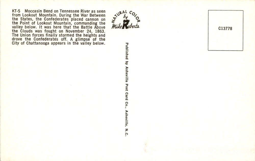 MAKE AN OFFER. THE MORE YOU BUY THE BETTER DEAL I WILL ACCEPT The postcard describes a natural color view of KT-5 Moccasin Bend on the Tennessee River, visible from Lookout Mountain. During the Civil War, Confederates positioned cannons on Lookout Mountain's Point to control the valley below.