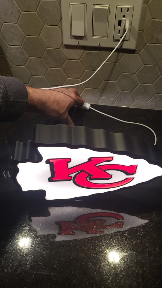 LED Lightbox Sign/Lamp - custom designed and ready for you to display. Great for the room of your choice! The lightbox is 3D printed with an LED light strip inside. Comes with and on/off switch. Can hang onto the wall or sit on your desk (comes with white stand). Plugs into any 5V USB A Changer or battery bank. Sign Measurements are 9.5 in x 9 in x 1.8 in The sign is 3D Printed on a machine, this process takes approx 6-7 hours This unique piece is perfect for adding character to any room. Made in Canada, this collector's item is a must-have for any KC fan of something unique. Ideal for adding a pop of color to your collection or as a standout addition to your decor, this illuminated sign is sure to impress. Perfect for collectors or those looking for a statement piece, this item is a great way to add a touch of personality to any space. Materials: Plastic Features: - ON/OFF push button switch - 3 1/2 ft long USB cable approx. - USB plug work on all USB charging adapter, computer/laptop USB port/ USB portable charger. - Ultra-safe as our light box use and LED light which operates at 5V DC (which draws very little amperage) because of this, it is super safe for kids and emits little to no heat