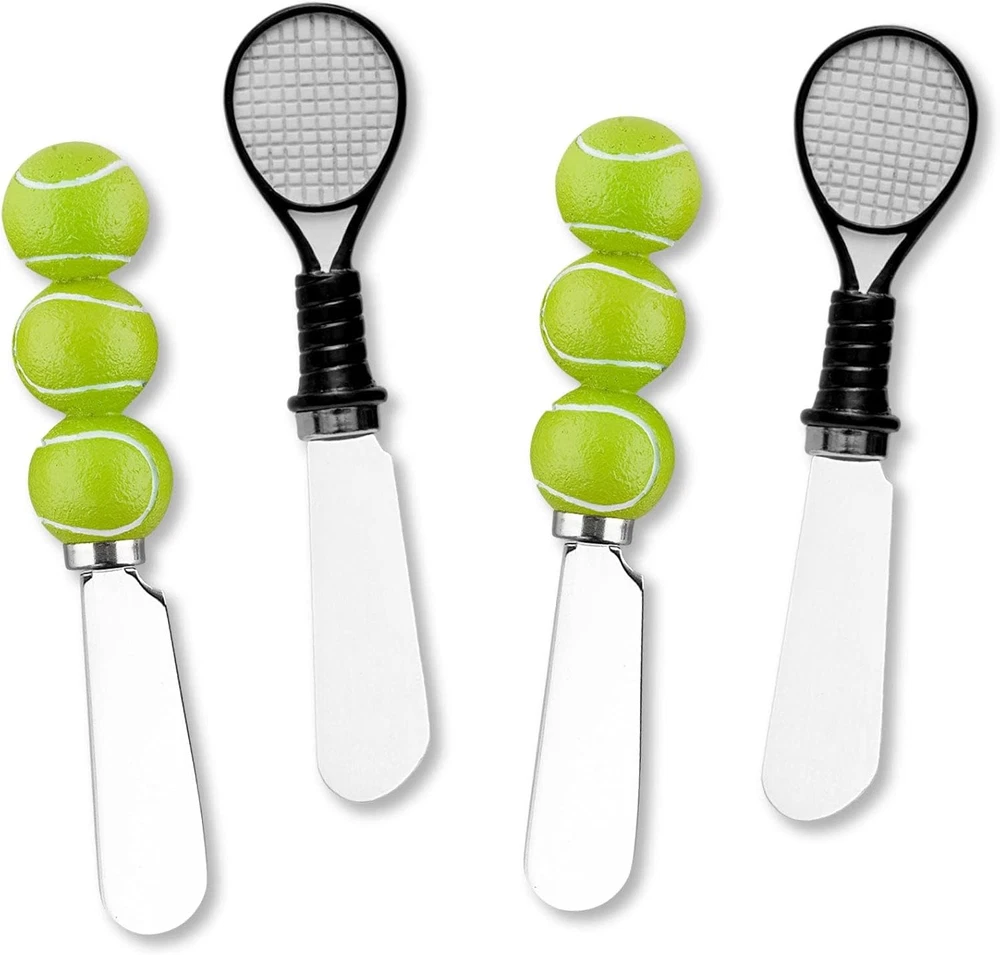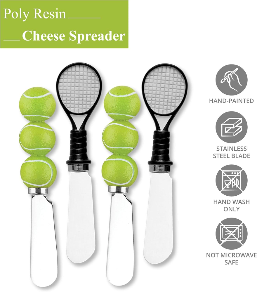 Tennis Themed Cheese Spreaders, Hand-Painted Resin Handles with Stainless Steel Blades for Spreading Cream Cheese, Butter, and Jam, Assorted Designs, Set of 4 Size: 5 inch L Material: Hand Painted Resin, Stainless Steel Care & Clean: Hand Wash Only Includes: 4-Piece Tennis resin handles have two different kinds: tennis ball and tennis racket Wine Things Tennis Resin Cheese Spreaders Set of 4 Item model number 5232 Style Modern Blade Edge Round Age Range (Description) Adult Country of Origin China Blade Shape Sheepsfoot Item Length 5 Inches Model Name Resin Spreader S/4 Is Discontinued By Manufacturer No Hand Orientation Ambidextrous Reusability Reusable Customer Package Type Standard Packaging Included Components Resin Spreader S/4, 4 cheese spreaders Item Weight 6.2 ounces Special Feature Foldable Color Tennis Theme Tennis Is Cordless? Yes Global Trade Identification Number 00740731252322 Handle Material Resin Recommended Uses For Product Spreading cheese, butter, or other soft spreadable food items Blade Material Stainless Steel Product Care Instructions Hand Wash Only Size 5" . Weight: 6.2 oz Shipping from the USA All of our products are shipped from the USA, ensuring quick delivery to your destination. Payment We offer the following payment methods: PayPal, credit card, bank transfer, and eBay's secure payment system. Free Shipping & Free Returns Shipping within the USA is FREE. Additionally, any return is absolutely free for you. Risk-Free Purchase You have the option to return an item within 30 days without any justification. We cover the return shipping costs! Fast Shipping We ship immediately upon receipt of payment. Generally, the package is delivered within 2-3 days in the USA. If it takes longer, we will contact you. Quality and Costs Made in Europe, USA, China No customs fees or additional charges Total satisfaction guarantee Invoice with declared VAT available upon request in .pdf format Feedback Your feedback is very important to us. After you pay for your purchase, you will automatically receive positive feedback from us.