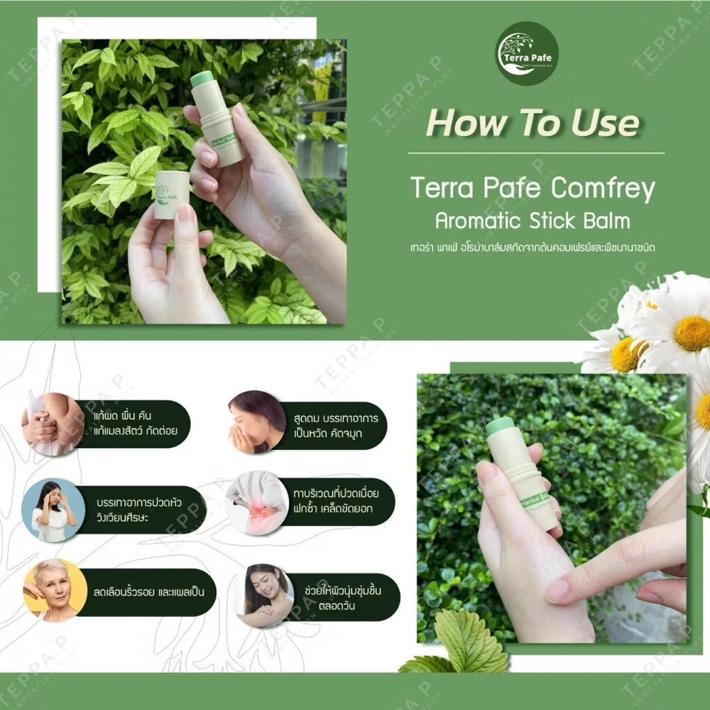 TTerra Pafe Comfrey Aromatic Stick Balm 🌿 Net content 7 grams Registration number: 10-2-6700018631 “Itchy” then “don’t scratch” use “Terra Pafe” “Dizzy” “Not refreshed” use “Terra Pafe” “Stop using balm” say goodbye to “dirty hands” use “Terra Pafe” Herbal balm stick, easy to carry But the properties are packed full of stock. Apply it anywhere and smell it whenever it's convenient for you to avoid messing up your hands. – Relieves itching on the skin – Relieve insect bites and stings – Sniff to relieve blurred vision dizzy – Apply and massage to relieve aches and pains. – Smell it and feel refreshed, use it during the day like a chic person. ✅ Correct use of balm There are the following guidelines: 1. Choose the right type of balm. For example, if you use it, you should choose a rub type. Or use it to cure fainting, you should choose an inhaled balm. 2. Apply balm rub formula when you have aches and pains. Or there are insect bites that do not have an allergic reaction, swelling, redness, or heat in the appropriate amount. 3. For inhalation balm formula It should be inhaled only when you feel dizzy, dizzy, or faint. 4. Test for allergies before use. In the case of using the balm for the first time 5. You should wash your hands before and after applying the balm every time. 6. If you have an allergic reaction to the balm, such as red skin. Burning sensation on the skin, rash appears, wash with clean water immediately. And if symptoms do not improve, you should see a doctor immediately. 7. Store the balm at room temperature. that is not exposed to sunlight And close the balm cap tightly after every use.