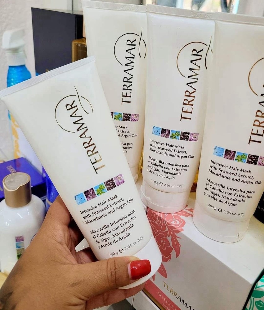 Terramar Mascarilla Intensiva Capilar Con Algas , Argany Y Macadamia 200gr. Mascarilla Intensiva capilar 200g 1.-Cuida tu cabello en estos dias de calor 2.-Mantenlo nutrido 3.-Suave 4.-Hidratado 5.-Sella puntas. 6.-Cuidalo de los químicos de las albercas o del exceso de agua salada.