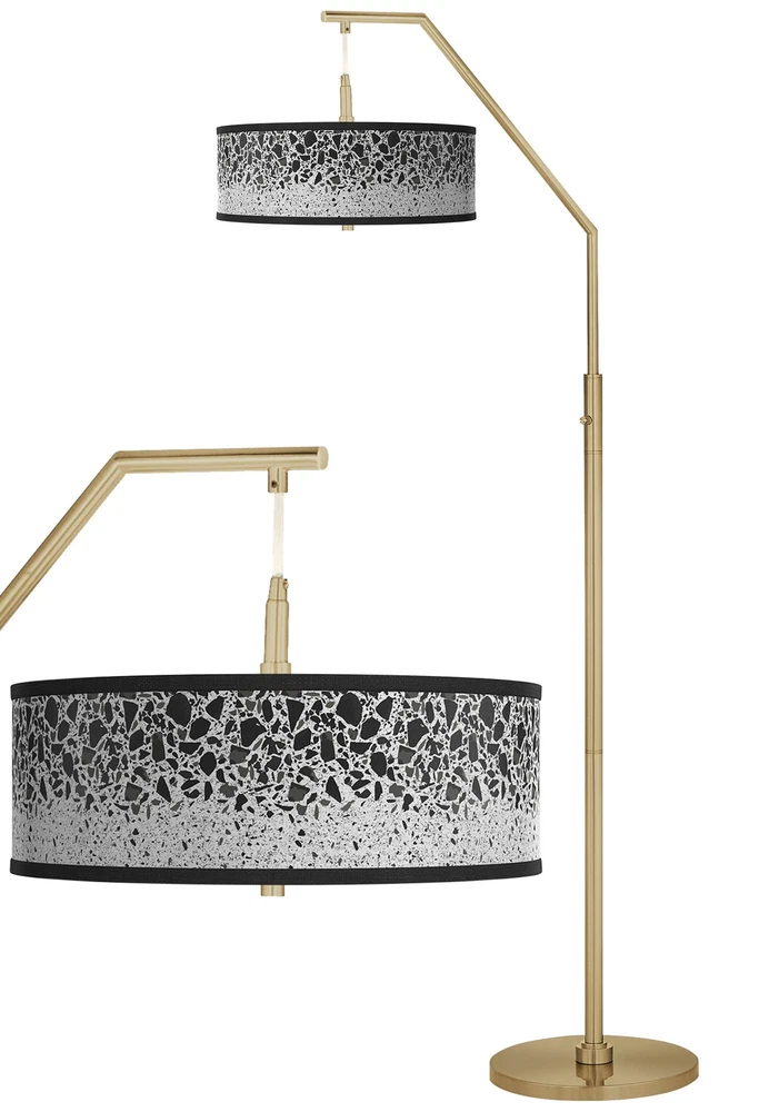 Shop Sale > Chandeliers Ceiling Lights Lamps Wall Lights Outdoor Lights Fountains Ceiling Fans Furniture Decor Terrazzo Giclee Warm Gold Arc Floor Lamp Style #189C9 PRODUCT DETAILS: 71 1/2" high overall. Base is 14" wide. Shade is 16" across the top x 16" across the bottom x 5 1/2" high. Weighs 23 lbs. Uses two maximum 100 watt standard-medium base light bulbs (not included). 4-position stem column switch. Switch positions: Right bulb on, left bulb on, both on, both off. Contemporary arc floor lamp from the Giclee Glow brand. Translucent Terrazzo shade with diffuser. Shade has the exclusive pattern and is custom made to order. Shade printing process U.S. Patent # 7,347,593. Warm gold finish. Metal construction. 8-foot long cord. DESCRIPTION: Add style with this contemporary arc floor lamp design. It features a warm gold finish and a shade with a bottom diffuser to prevent glare. The shade shows off an exclusive Terrazzo shade pattern and is giclee printed and made to order. Stem switch allows for two different lighting levels for ultimate convenience. Shade printing process U.S. Patent # 7,347,593. *Free Shipping applies only to orders shipping to the 48 continental United States that qualify and meet the minimum purchase requirement; standard shipping only and select products excluded, including freight and oversized items. Free Returns valid on select items in United States only; does not apply to freight, clearance, Daily Sale, designs with giclee art shades, Color Plus and Tiffany Color Plus brand items, or certain items with designer shades.