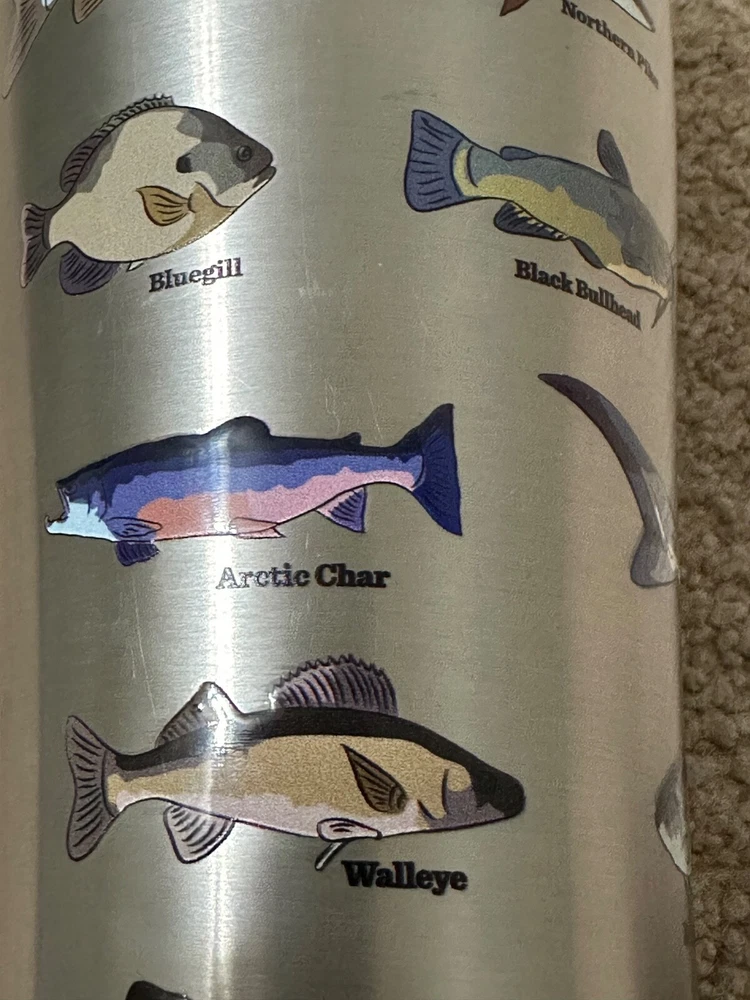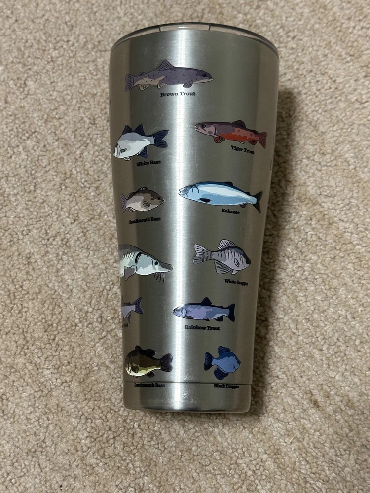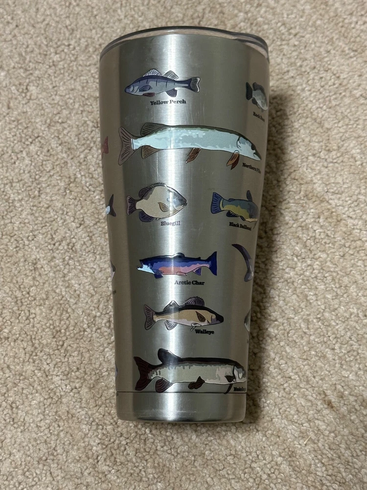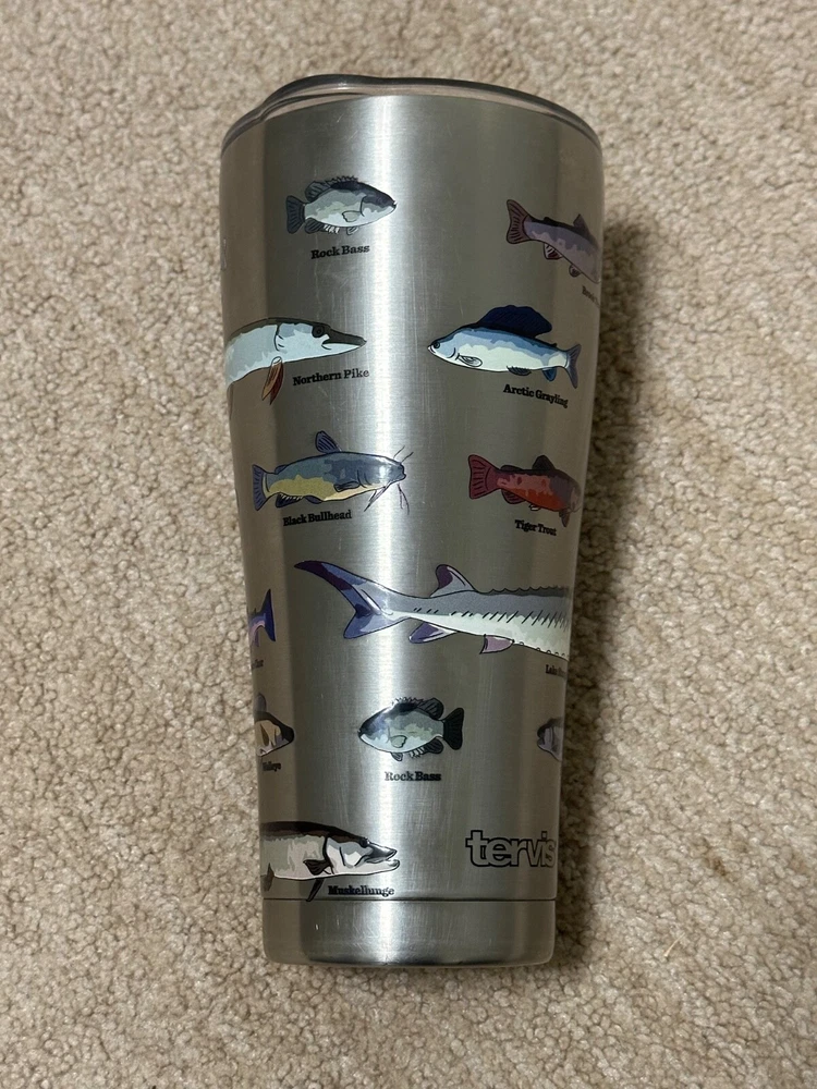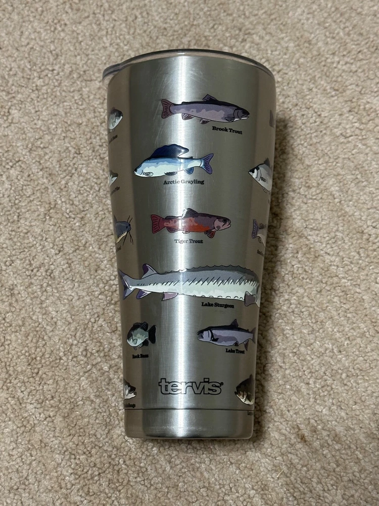 The fish stick out a little bit providing a nice texture and extra grip. The Tervis Fish Identifier 30 Oz. Stainless Steel Drink Tumbler is a round tumbler featuring a fish theme in multiple colors. It has a capacity of 30 ounces, stands at 8 inches tall, and comes with a slider lid. Made of stainless steel, this drink tumbler is designed for fish enthusiasts and is perfect for enjoying your favorite beverages on the go.