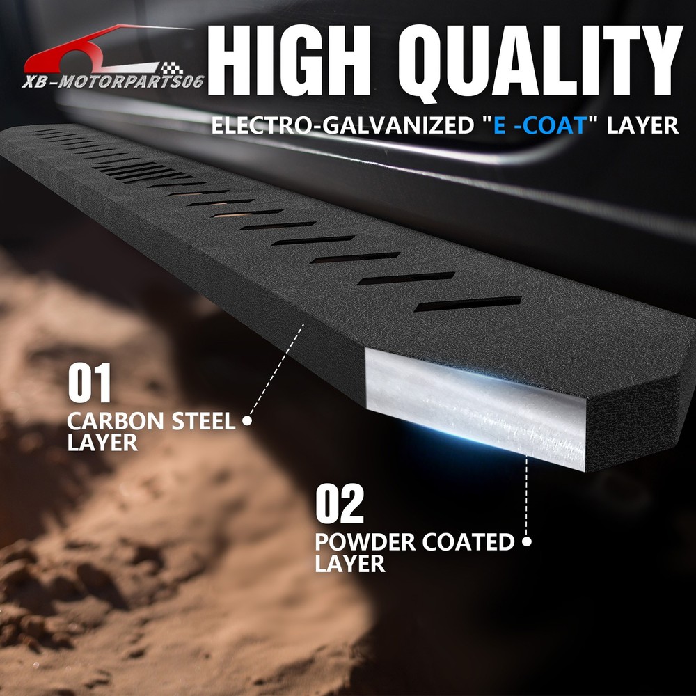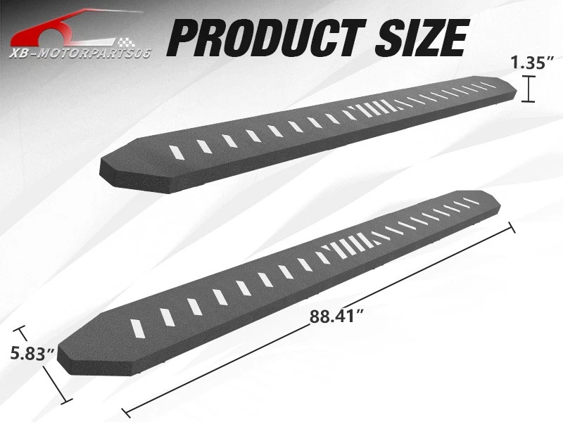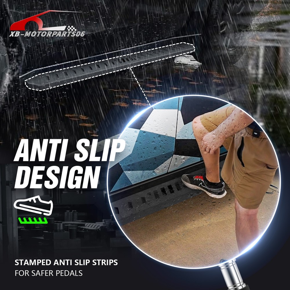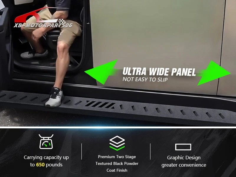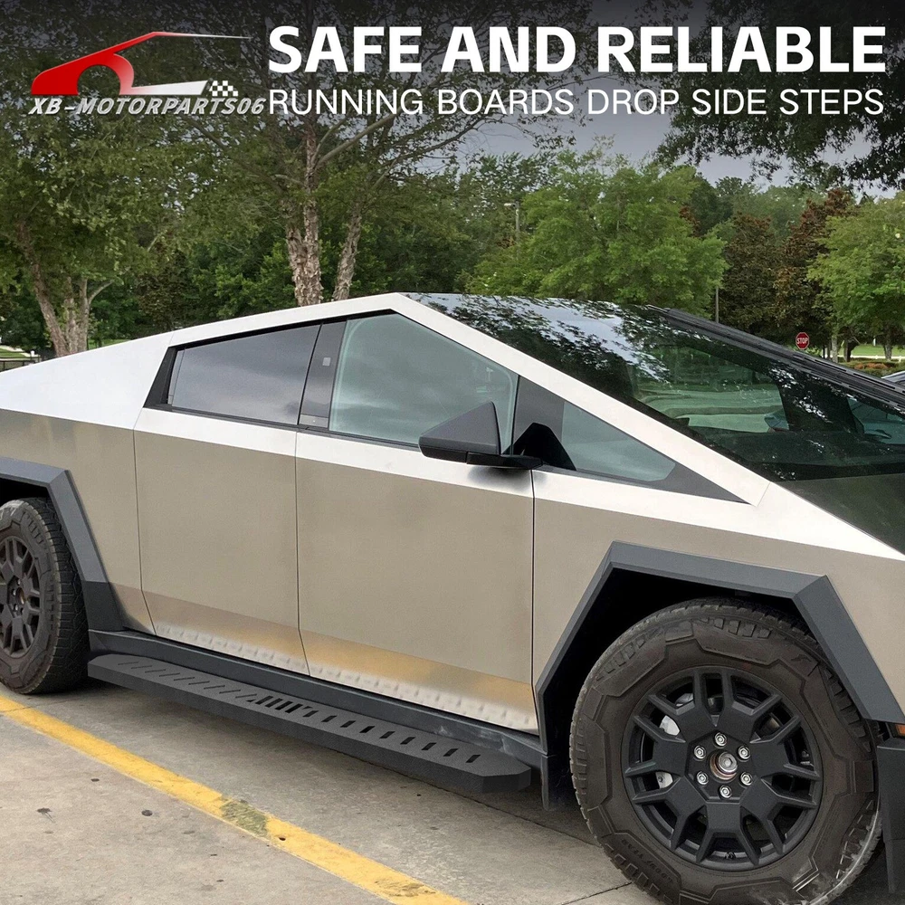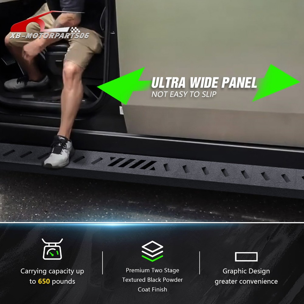 Running Boards Exterior Brackets Nerf Bar Step Rails For 24-25 Tesla Cybertruck Suitable Models : Compatible with 2024 2025 Tesla Cybertruck Package Includes : 2 x Running Boards Side Steps, brackets, instructions, and all necessary hardware Product Information : Product Dimensions: 88.41 x 5.83 x 1.35 inches Installation mode: Bolt-On Weight Limit: 550LBS Placement on Vehicle: Left and Right Item Weight: 57.86 pounds Material: Carbon Steel Color: Black (hand measurements may have an error of 2-3 mm/0.078-0.118 in) Feature: ① Enhancing convenience for vehicles with lift kits and oversized tires, while also making roof access easier; ② The extra-thick main tube provides superior load-bearing capacity, preventing deformation and enhancing vehicle protection; ③ The stepping area is designed with a high-end textured pattern, ensuring secure and stable footing to prevent slipping; ④ The high-quality black powder coating provides outstanding rust and corrosion resistance. Constructed from heavy-duty 2mm carbon steel, each side can withstand a weight of 650 pounds. Precision laser cutting and stamping techniques contribute to a non-slip step surface and enhanced traction; Warranty Period : 1 year Standard Shipping (FedEx Ground or FedEx Home Delivery) Will usually ship within 3 business days of receiving cleared payment Suitable Models : Compatible with 2024 2025 Tesla Cybertruck Package Includes : 2 x Running Boards Side Steps, brackets, instructions, and all necessary hardware Product Information : Product Dimensions: 88.41 x 5.83 x 1.35 inches Installation mode: Bolt-On Weight Limit: 550LBS Placement on Vehicle: Left and Right Item Weight: 57.86 pounds Material: Carbon Steel Color: Black (hand measurements may have an error of 2-3 mm/0.078-0.118 in) Feature: ① Enhancing convenience for vehicles with lift kits and oversized tires, while also making roof access easier; ② The extra-thick main tube provides superior load-bearing capacity, preventing deformation and enhancing vehicle protection; ③ The stepping area is designed with a high-end textured pattern, ensuring secure and stable footing to prevent slipping; ④ The high-quality black powder coating provides outstanding rust and corrosion resistance. Constructed from heavy-duty 2mm carbon steel, each side can withstand a weight of 650 pounds. Precision laser cutting and stamping techniques contribute to a non-slip step surface and enhanced traction; Warranty Period : 1 year