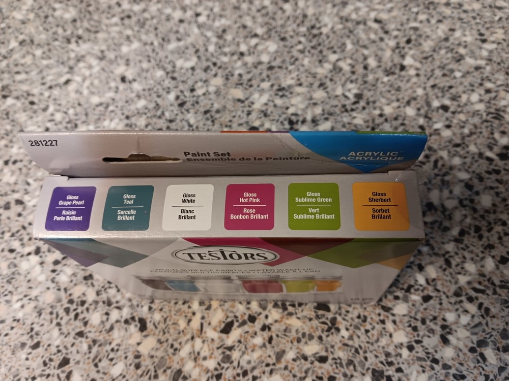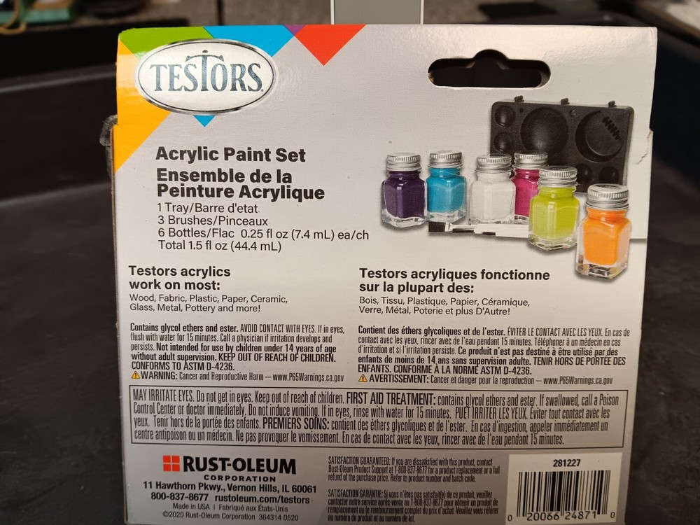 Testors Acrylic Paint Set - 6 Paints, 1 Paint Tray, 3 Brushes - 281227 Brand New - Factory Sealed Testors’ Acrylic Paint Sets are the perfect gift item for casual and younger modelers and hobbyist! These quality paints in the tiny bottles are also great for school and scout projects, craft projects, wood working,... just about anything that requires painting. Testors’ Acrylic Paints are fast drying, non-toxic, easy water wash-up, and low odor. 281227 – Colors (Gloss Grape Pearl , Gloss Teal, Gloss White, Gloss Hot Pink, Gloss Sublime Green, Gloss Sherbert); Accessories: 3 paint brushes and 1 paint tray