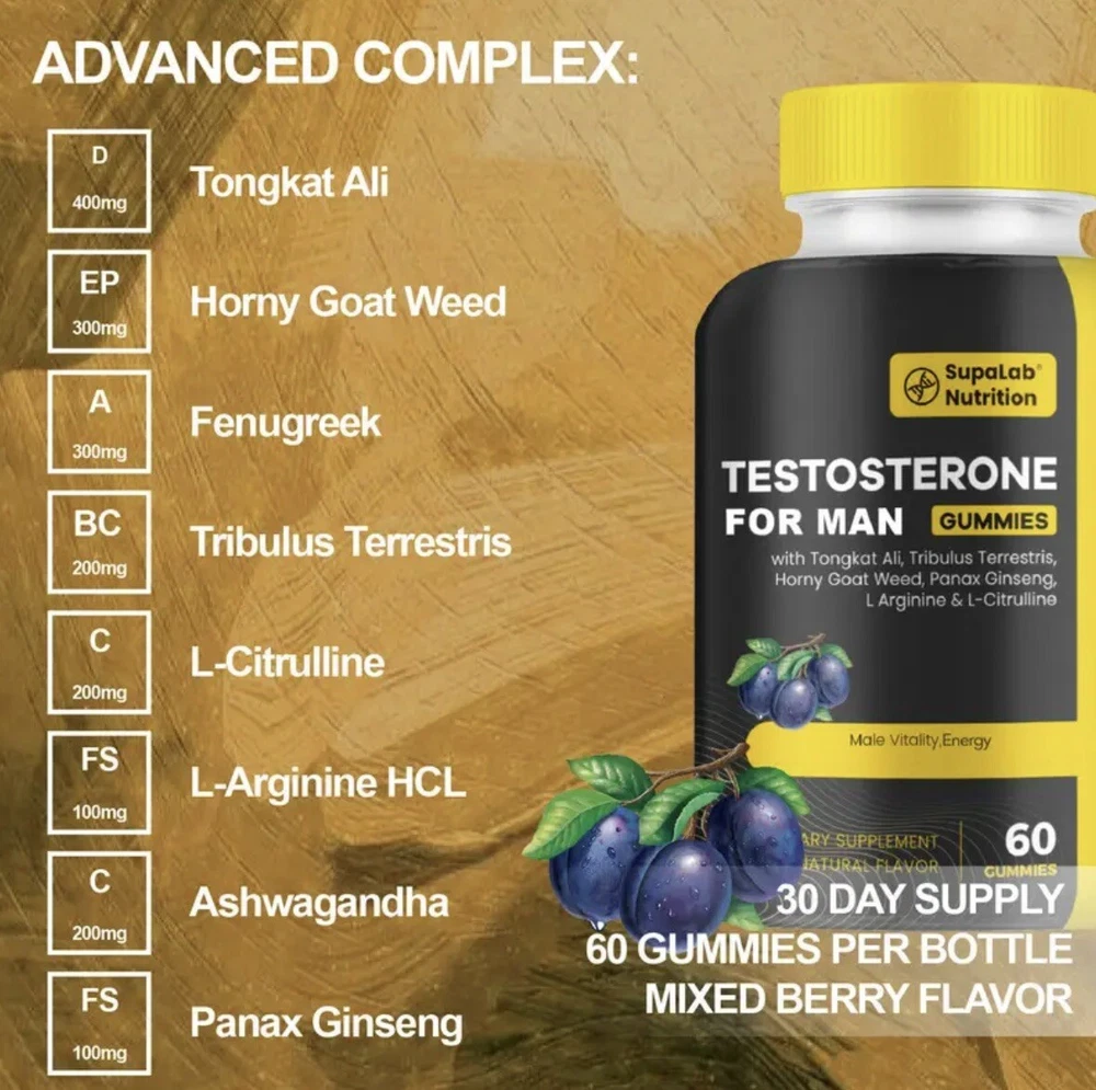Testosterone Booster for Men, Male Enhancement Pills, Energy, Libido 60 Capsules. SupaLab Nutrition All-Natural Testosterone Booster - 60 Capsules Elevate your performance, energy, and overall wellness with SupaLab Nutrition’s All-Natural Testosterone Booster. Specifically formulated for male enhancement, workouts, and healthy living, this supplement is your ultimate partner for achieving your health and fitness goals. Key Benefits: • Boost Natural Testosterone Levels: Support muscle growth, strength, and stamina. • Enhance Male Vitality: Improve overall performance and energy throughout the day. • Optimize Workouts: Maximize endurance and recovery for peak physical performance. • Promote Healthy Living: Formulated with premium, all-natural ingredients for safe, long-term use. Why Choose SupaLab Nutrition? • Natural Formula: Made with carefully selected herbal extracts and vitamins to support your body’s natural processes. • Convenient: 60 easy-to-swallow capsules for a full month’s supply. • Quality Assured: Manufactured in a GMP-certified facility for the highest safety and quality standards. Take the next step in your journey to optimal health and fitness with SupaLab Nutrition’s All-Natural Testosterone Booster. Perfect for men looking to improve energy, build muscle, and maintain a balanced lifestyle. Order now and feel the difference in your workouts and daily life! (Consult a healthcare professional before use. Not intended to diagnose, treat, cure, or prevent any disease.)