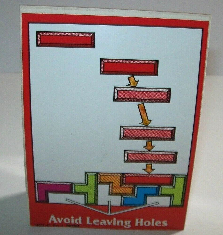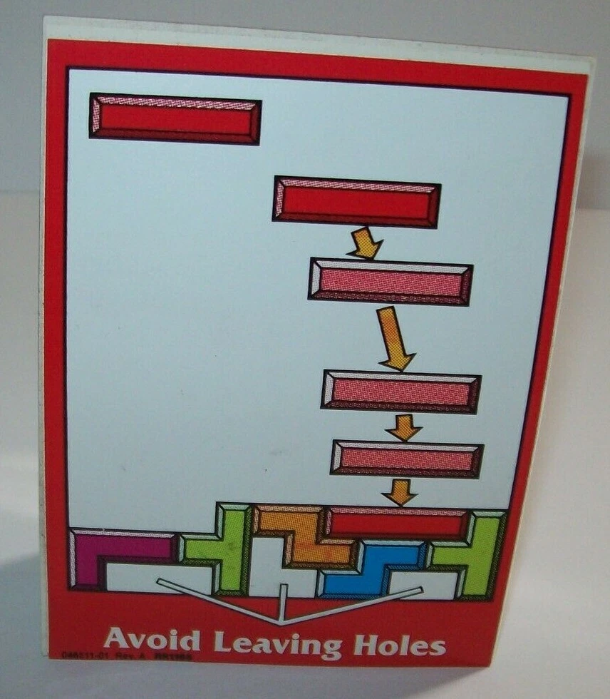 Atari Tetris Video Arcade Game Avoid Leaving Holes Decal Sticker Original 1988 Original new old stock decal sticker for the Atari Tetris game. Has minor spotting on front and discoloring on the back peel off paper but was never used. Has light fading. Found in storage. 4.5" x 3.25". See photos. More pinball, jukebox, slot machine, and arcade game items for sale in our store. SHIPPING Bundle and save by using cart and making single payment. International buyers are responsible for any import fees/taxes. ABOUT US Seller of vintage collectibles, gifts, advertising, artwork, original pinball flyers, vinyl records, video arcade flyers, pinball machine translites, game manuals, score cards, magazines, antique Halloween and holiday postcards, Christmas items, super hero memorabilia, horror themed art.