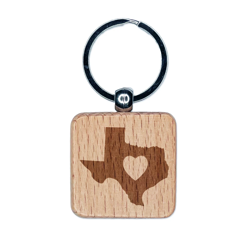 Texas State with Heart Engraved Wood Square Keychain Tag Charm