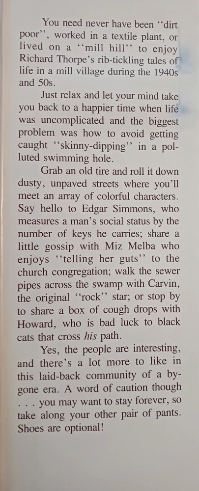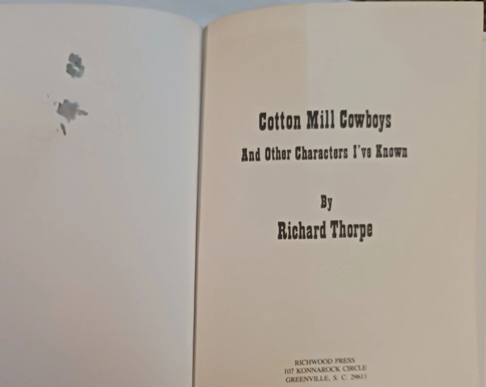 Number of Pages: 176 Pages Author: Richard Thorpe ISBN: DoesNotApply Genre: Biography & Autobiography Format: Hardcover gtin13: DoesNotApply Language: English Book Title: Cotton Mill Cowboys : and OTHER Characters I've Known Publication Year: 1984 Publisher: Richwood Press