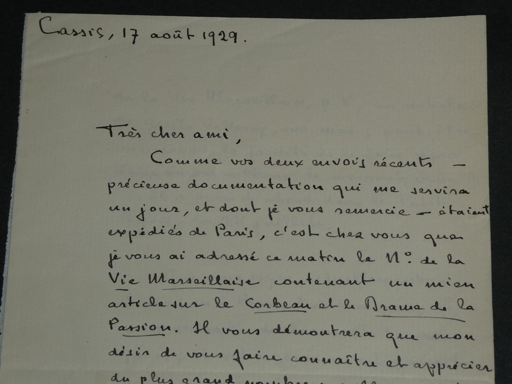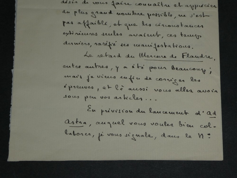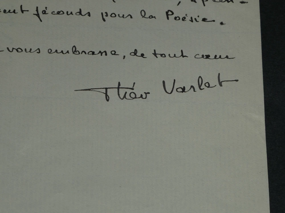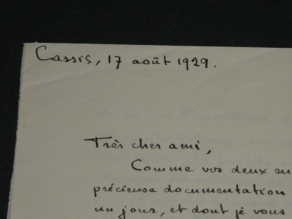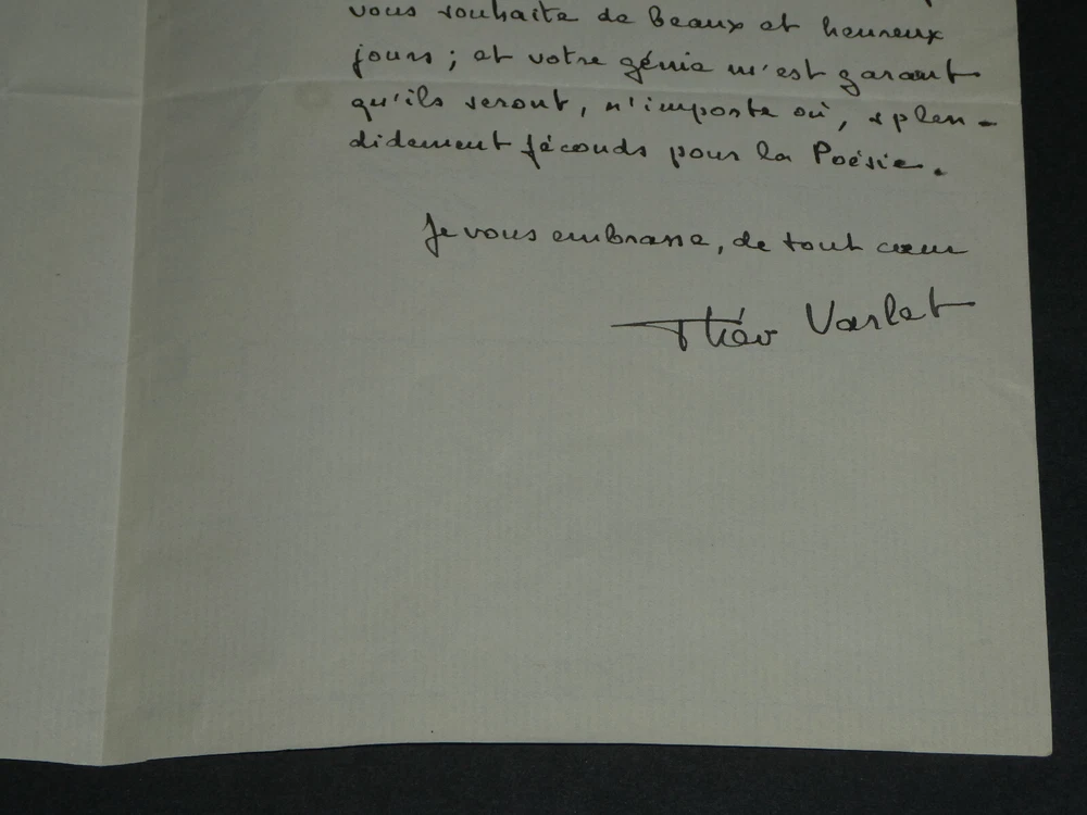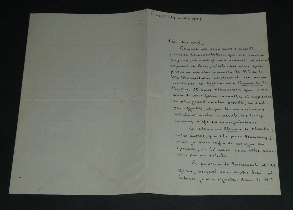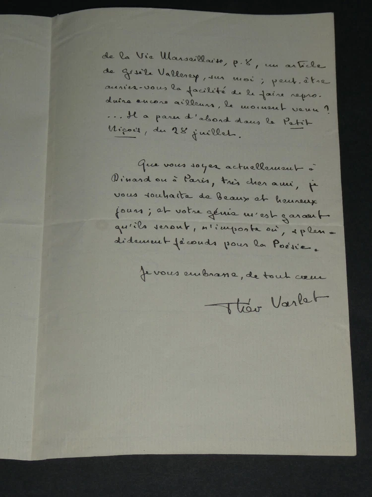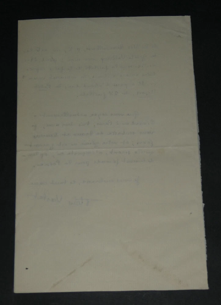 Free eBay listing template designed by dewiso.com Théo Varlet - Poet - SIGNED AUTOGRAPH LETTER To Armand GODOY - 1929 The description of this item has been automatically translated. If you have any questions, please feel free to contact us. Theo Varlet. Autograph letter signed, addressed to Armand Godoy, 1929 French poet Autograph letter signed by Théo Varlet, French poet, addressed to the poet Armand Godoy, written in black ink on a double sheet, dated August 17, 1929 in Cassis. He sends his correspondent an issue of the journal de la Vie Marseillaise in which there is one of his articles in which he talks about two books by Armand Godoy: "I sent you this morning the issue of la Vie Marseillaise containing an article of mine on the Raven and The Drama of the Passion. It will show you that my desire to make you known and appreciated by as many people as possible has not weakened, and that external circumstances alone have, in recent times, rarefied its manifestations." Dimensions: 21.2 x 13.5 cm State : Miter mark on the back. See photos for details. Number of pages: 2 pages Theo Varlet Théo Varlet, alias Déodat Serval, born Mars 12, 1878 in Lille and died October 6, 1938 in Cassis, is a poet, fantasy and science fiction writer and French translator of the 20th century. Wikipedia Armand Godoy Armand Godoy, born in Havana in 1880 and died in Lausanne in 1964, is a symbolist poet of Cuban origin. First involved in the Cuban tobacco trade, he changed his language at the age of forty to become a French poet "in the language of Baudelaire" and settled in Paris in 1919. Wikipedia Contact us Autograph letters, old papers, old books, photographs, engravings, stamps... We appraise and/or buy your letters, collections of letters and old books throughout France. Payment Payments by eBay, PayPal, transfer or check are accepted. Sending Careful delivery in rigid, waterproof packaging within three days. Allow for the usual postal delays in addition. Back Satisfaction guaranteed or your money back. If you are not completely satisfied, return at the seller's expense for Europe. At the buyer's expense for the rest of the world. Autograph letter signed by Théo Varlet, French poet, addressed to the poet Armand Godoy, written in black ink on a double sheet, dated August 17, 1929 in Cassis. He sends his correspondent an issue of the journal de la Vie Marseillaise in which there is one of his articles in which he talks about two books by Armand Godoy: "I sent you this morning the issue of la Vie Marseillaise containing an article of mine on the Raven and The Drama of the Passion. It will show you that my desire to make you known and appreciated by as many people as possible has not weakened, and that external circumstances alone have, in recent times, rarefied its manifestations." Dimensions: 21.2 x 13.5 cm State : Miter mark on the back. See photos for details. Number of pages: 2 pages