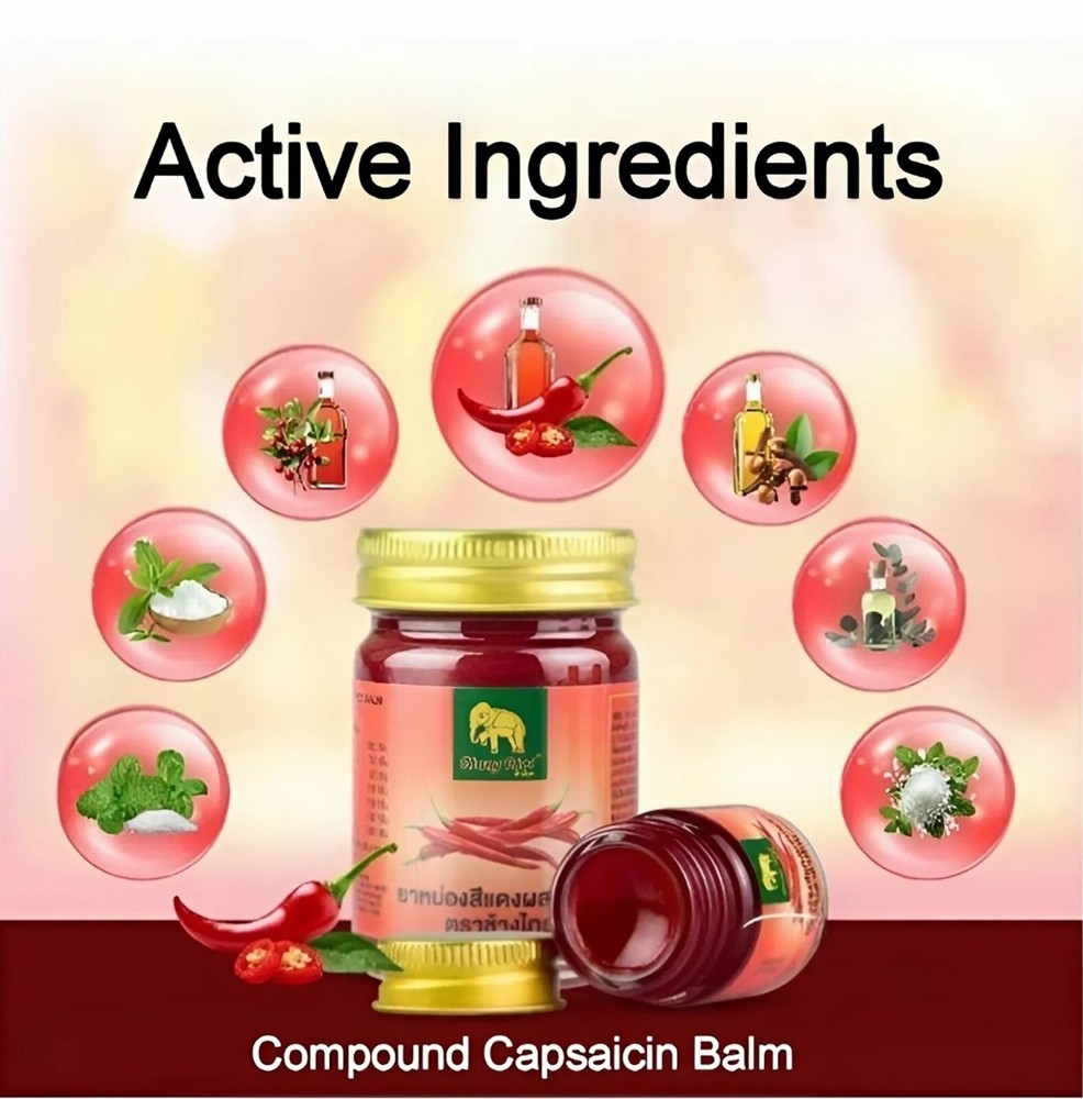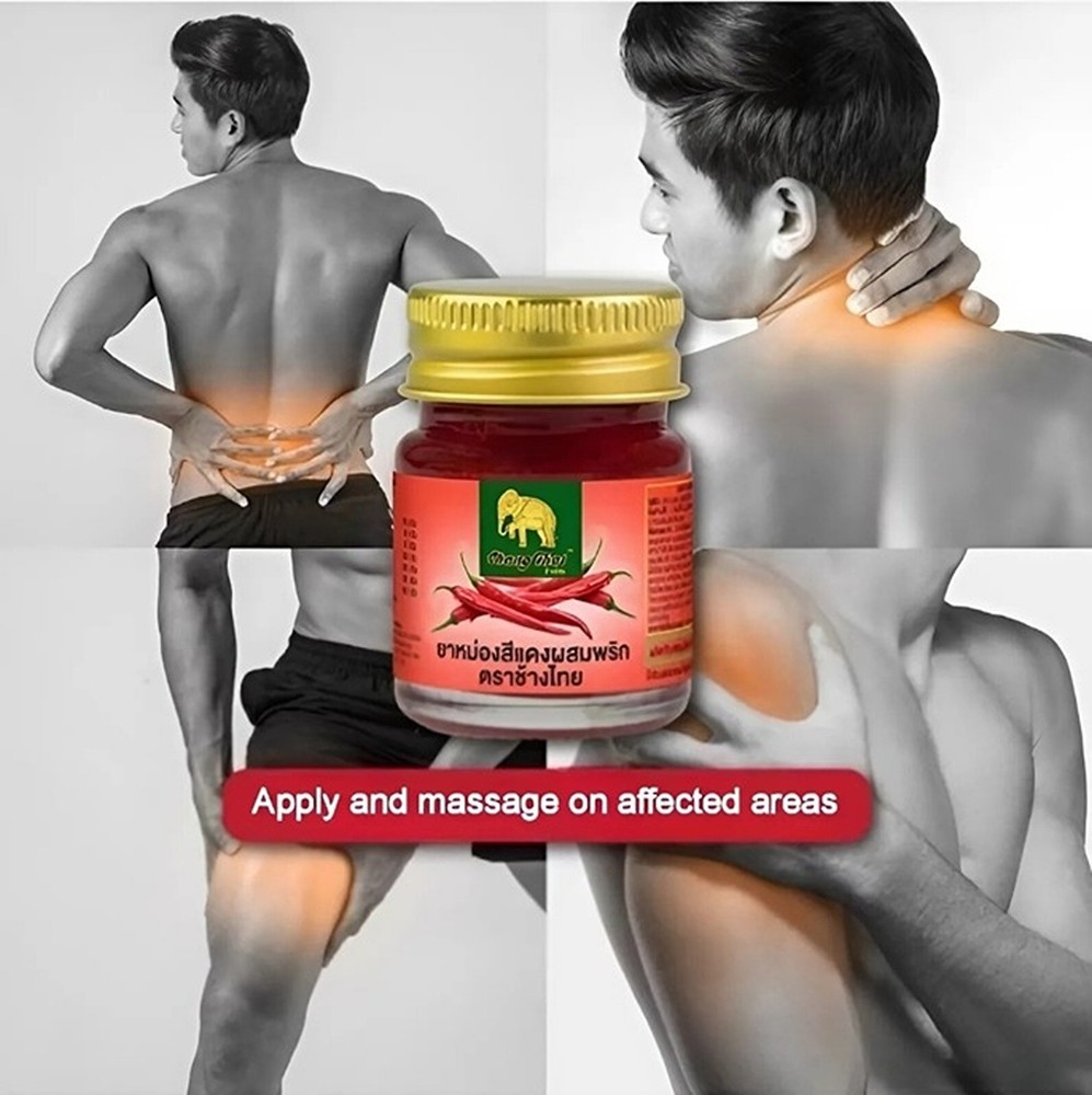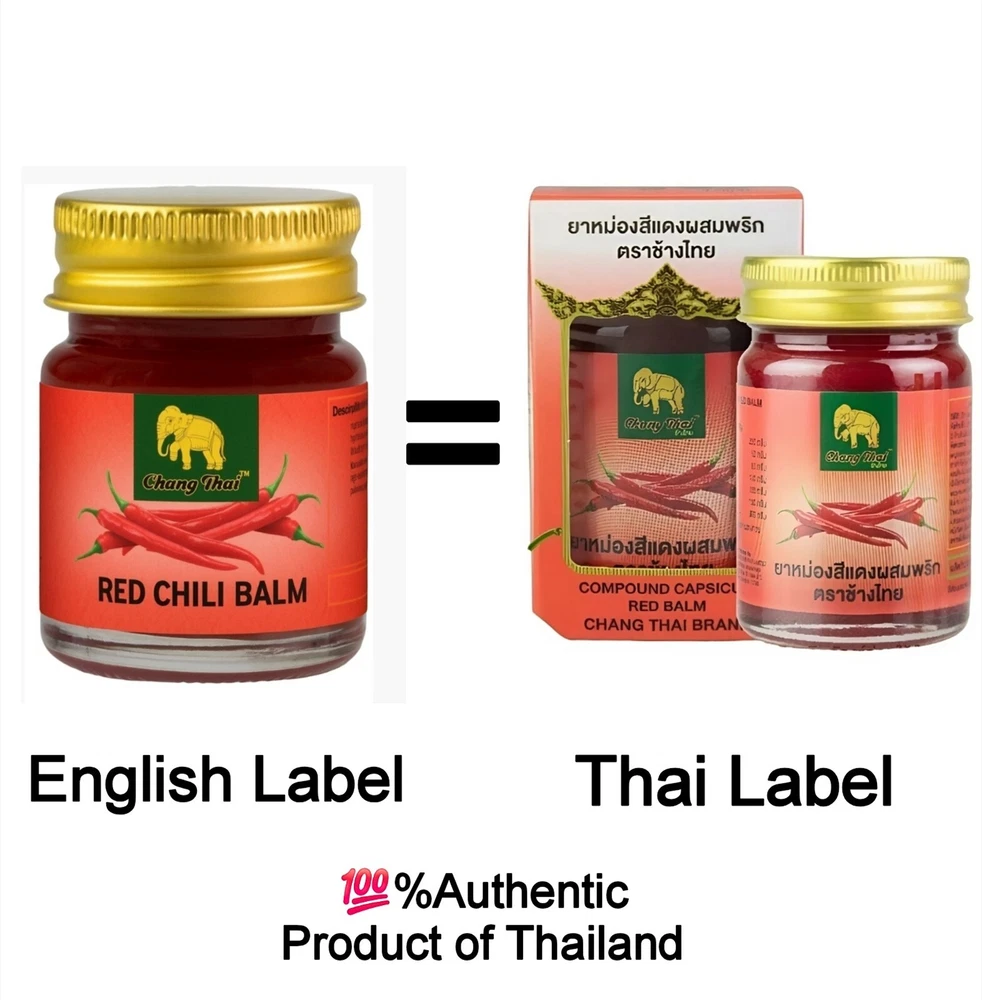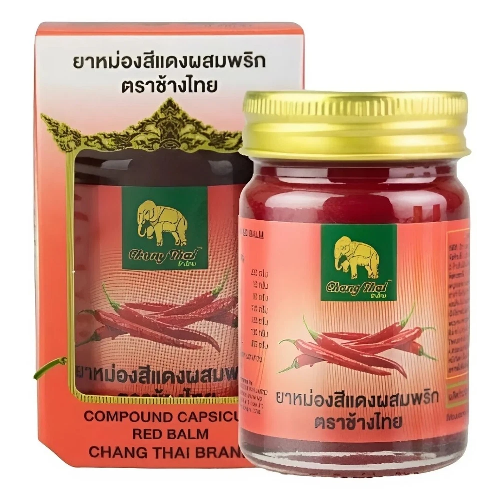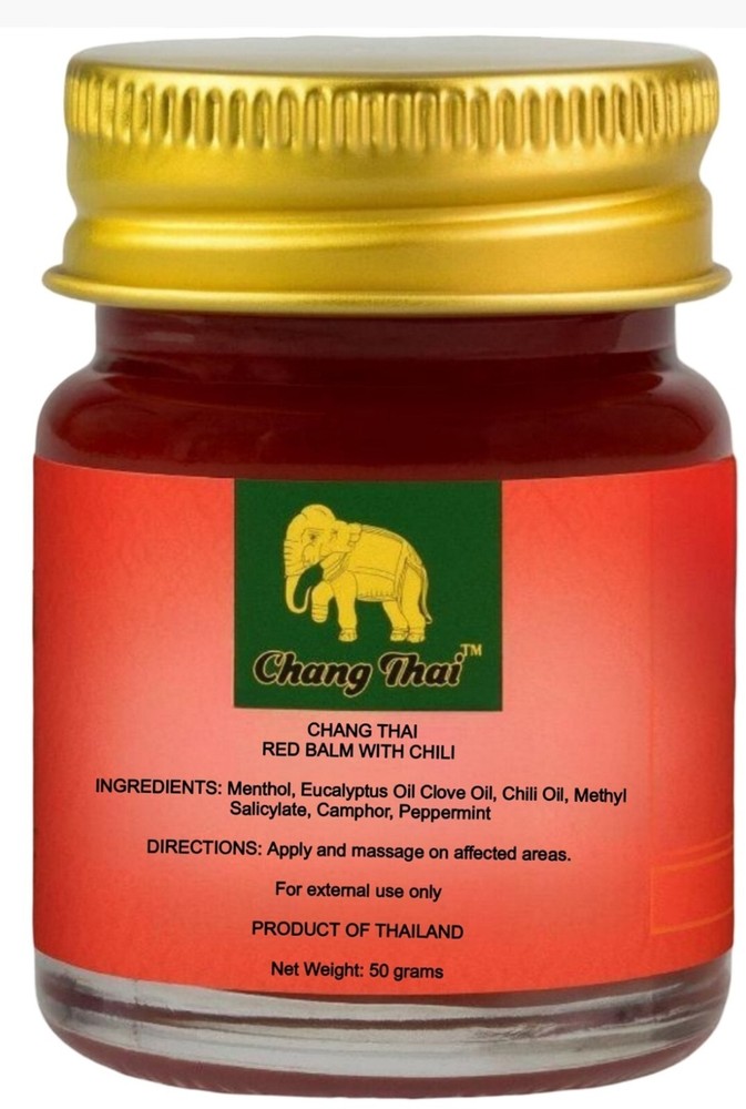 🔥 Red Herbal Balm with Chili – Chang Thai Brand – Traditional Thai Warming Balm 100% Herbal Discover the Power of Thai Tradition in a Jar For generations, Thai herbal balms have been a staple in local households—used by farmers, athletes, and grandparents alike. Chang Thai Red Balm with Chili carries on this legacy, blending ancient wisdom with natural ingredients to create a warming balm that comforts the body and delights the senses. 🌿 Key Features Infused with Natural Chili Extract – Adds gentle warmth to promote a soothing sensation. Traditional Thai Formula – Passed down from Thai herbalists, combining multiple plant-based ingredients. Compact & Convenient – Great for travel, gym bags, or office drawers. Strong Aroma, Long-Lasting Effect – Classic Thai herbal scent that refreshes and invigorates. 🌱 Highlighted Ingredients Chili Extract (Capsicum) – Naturally warming, helps promote a feeling of relief in tight or overworked areas. Menthol & Camphor – Provide an immediate cooling effect and help deliver the balm deep into the skin. Steamed Herbal Oils – Includes wintergreen oil, peppermint, and other local Thai botanicals for a balanced aroma and texture. ✅ How to Use 1. Apply a small amount to the desired area (such as shoulders, neck, back, or joints). 2. Gently massage in circular motions until absorbed. 3. Wash hands after use and avoid contact with eyes or sensitive areas. Use as needed. External use only. 📦 Storage Instructions Keep in a cool, dry place away from direct sunlight. Close the lid tightly after each use. Avoid exposure to high heat or moisture. 📌 Caution For external use only. Do not apply to broken or irritated skin. Avoid eyes, mouth, and other sensitive areas. Test on a small area of skin before full application. Not suitable for children under 3 years old. Whether you're a fan of Thai herbal products or seeking natural comfort for daily use, Chang Thai Red Balm with Chili offers a trusted, time-honored experience in every jar. 🧳 Perfect for travelers, athletes, office workers, or anyone looking for a little warmth in their daily routine.