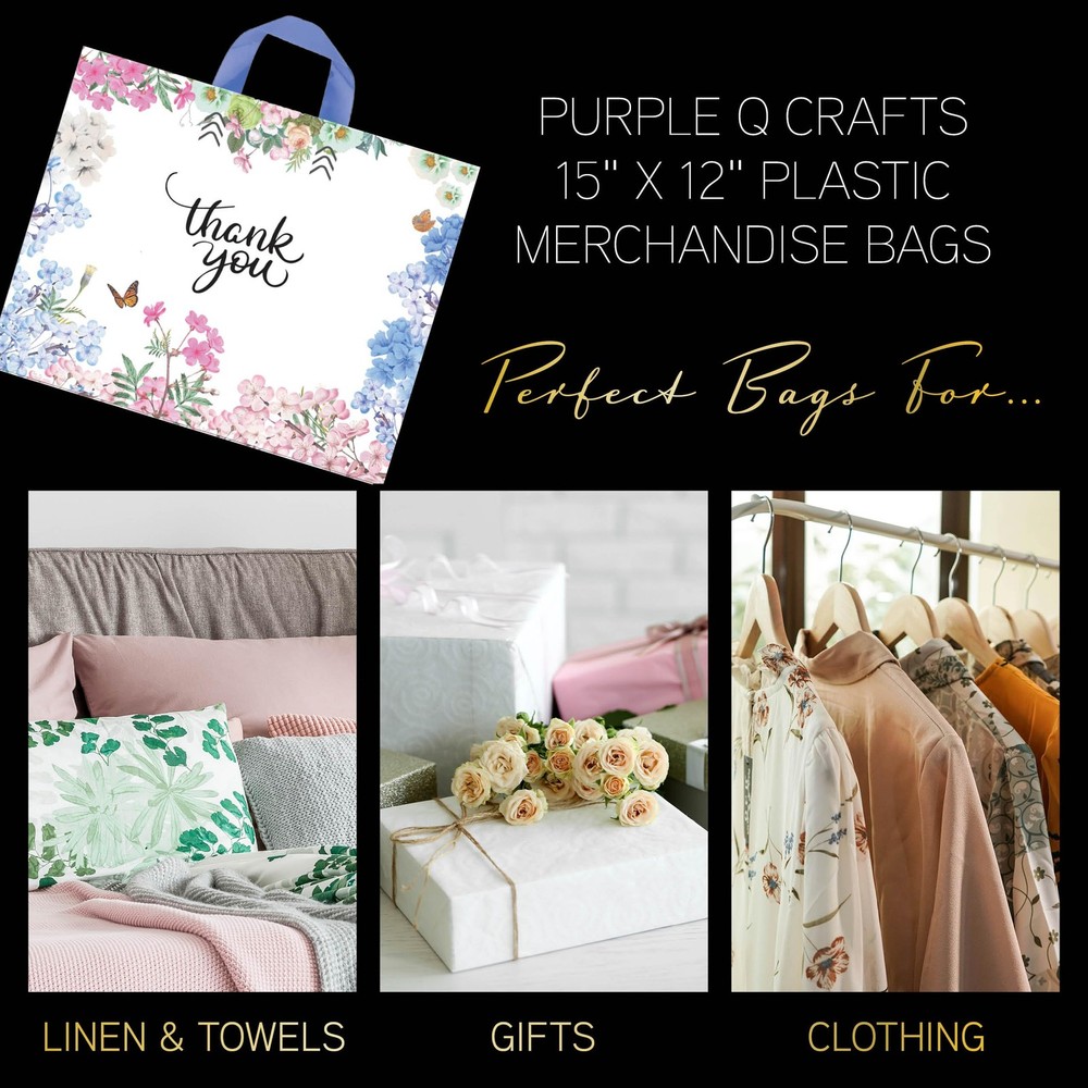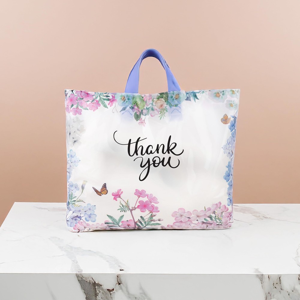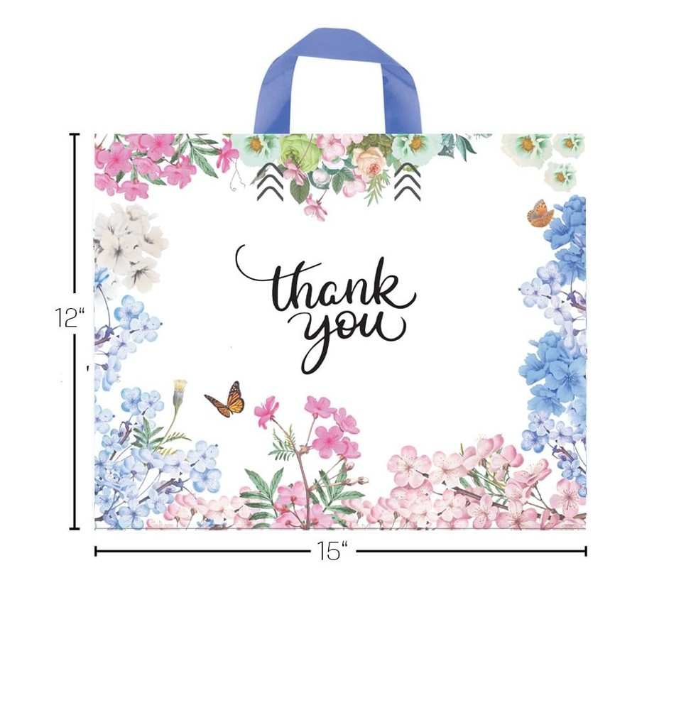 These cute and colorful large floral thank you bags are perfect for your small business or boutique whether you sell clothing, craft supplies, jewelry or any other merchandise. They measure 12” H x 15” W with a soft loop handle and side gusset. They are made with thick and strong plastic for durable packaging and shipping. Your customers will love getting their items in our bags, try it out and you'll see! 50 PACK: 12” H x 15” W, thick plastic thank you bags with soft loop handles. USE: Perfect retail shopping bags for boutique or small business to hold clothing, gifts, groceries and other medium sized merchandise. DESIGN: Beautiful floral design with thank you logo to thank your customer for shopping with you. DIMENSIONS: 12" height x 15" width with bottom gusset, perfect size for use as a gift bag or boutique bag. QUALITY: Made from high quality and thick plastic for a strong and durable shopping bag.