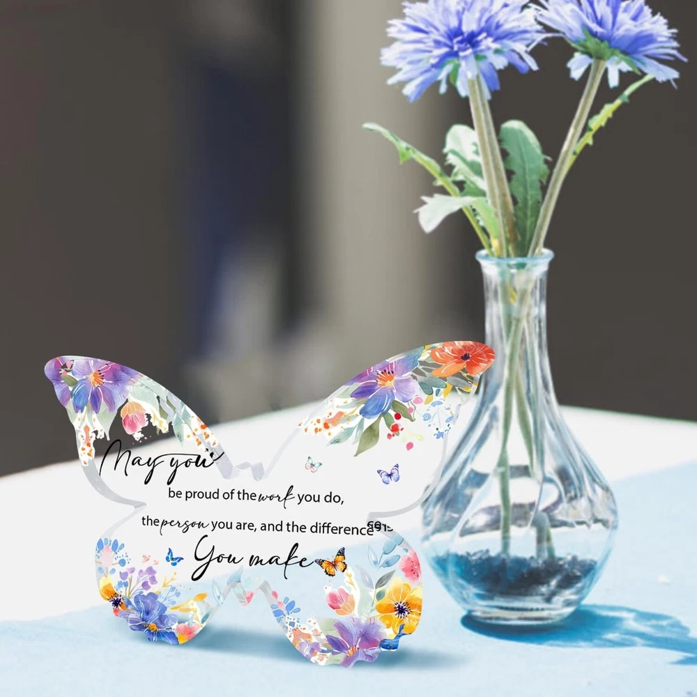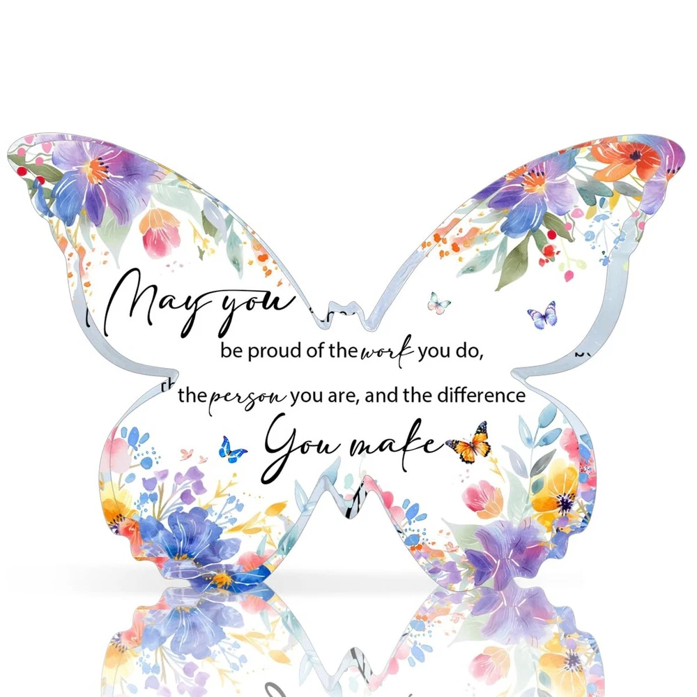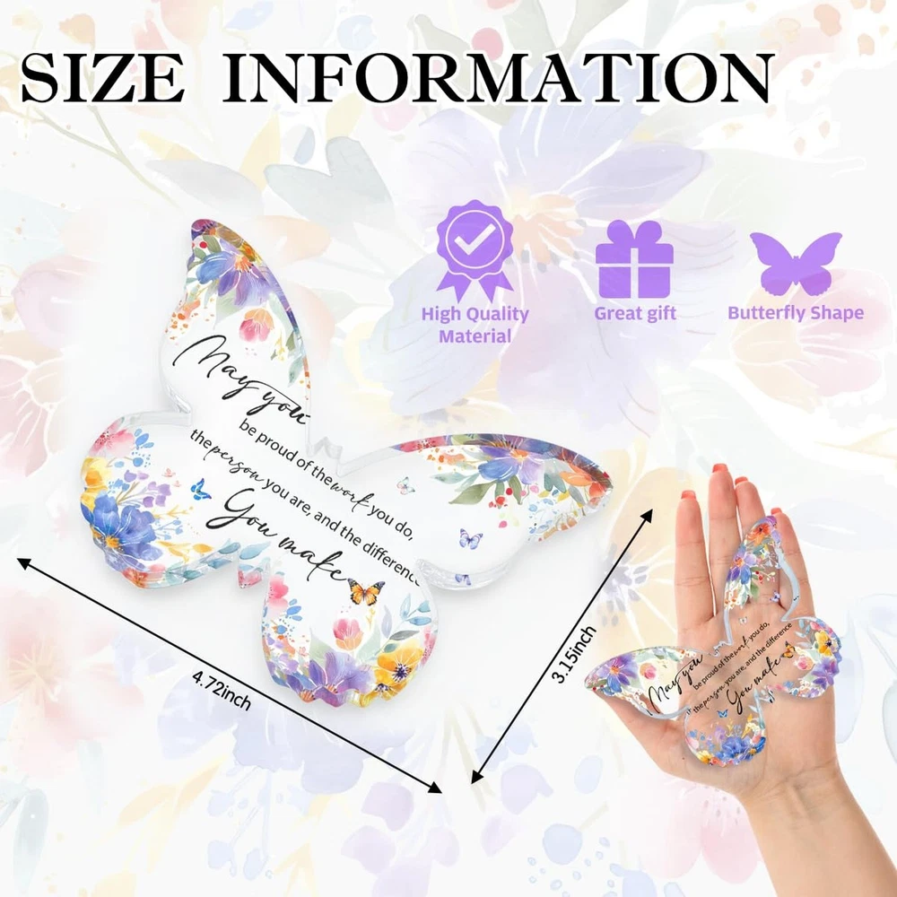 Thank You Gifts Plaque, Butterfly Gifts for Women, Office Desk Decoration Accessories, Inspirational Gifts for Women, Appreciation Gifts for Coworkers, Women, Teachers, Friends Product Details Color: Multicolor Brand: TAGDANK Material: Acrylic Theme: Inspirational Mounting Type: Free Standing Product Dimensions: 4.72"L x 3.15"W Style: Art Deco Item Weight: 1.6 ounces Manufacturer: TAGDANK Country of Origin: China Item model number: DM318 Unique Design & Suitable for All Occasions: The quotes surrounded by flowers. The thank you words and patterns printed on them are a source of praise and gratitude throughout the day. Each butterfly is unique, much like a human. Whether it's Christmas, a birthday, Mother's Day or an anniversary; their sentimental value and unique and thoughtful design make them a treasured keepsake for the recipient Inspire Positive Energy Gift: Designed to express gratitude, this acrylic butterfly ornament is a unique gift that can express warmth and kindness, and it says "Thank you for helping me grow and fly". It is an ideal thank you gift, which is perfect for thanking teachers, bosses, colleagues, friends or any special person in your life.. The pattern and words above show your belief deeply Lightweight and portable: butterfly gifts for women measure about 4.72 x 3.15 x 0.59 inches/ 12 x 8 x 1.5 cm, lightweight and portable, easy to store and display, they do not take up too much space on the table, they can stand stable on your table, shelf, counter, drawer, cupboard or any flat surface High-Quality : Made of quality acrylic, with clear printing and smooth surfaces, wear and tear resistant, which is reliable and reusable, and not easy to fade, deform or break for long term use and can be displayed on a desk, shelf, or wall for a lasting reminder of your gratitude.The stylish appearance adds a touch of sophistication to any space AFTER-SALES SERVICE: The package includes a box and an acrylic ornament. We provide after-sales service This clear acrylic sign is printed with beautiful design and meaningful saying, it is a good choice for your friends and families. It will be placed where it can be easily seen, it is a nice small office desk decor for women and will bring a good mood to them every day.