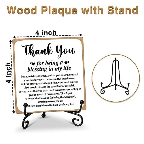 Return Policy Fast Delivery Trusted seller Thank You Gifts for Women Men Friends Mom, Thank You for Being A Blessing in My Life Wooden Plaque with Stand, Thanksgiving Day Gifts for Family Member Desk Decor - B75 Product Description Perfect Gifts for Women: This wooden sign embodies a beautiful and meaningful design, making it ideal for your friends and family. This decoration will stand proudly on any table, bringing a daily dose of positivity to their lives. Premium Quality Wooden Plaques: Crafted from high-quality wood, our tabletop signs are exceptionally sturdy. The clear print does not fade easily, ensuring a long-lasting, serviceable, and unbreakable keepsake. Appropriate size: You will receive a 1pc measuring approximately 10 x 10 x 0.5 cm / 3.94 x 3.94 x 0.2 inch home office decor. This desk sign is perfectly sized to fit your workspace. It takes up minimal space when placed next to your computer and is easily handheld. Decorative Home/Office Decor: This tabletop sign is versatile for all occasions, such as adorning coffee tables, bedside tables, desks, bookshelves, vanity, and more. Its beautiful design complements any style of home decor and ensures a daily dose of mood. Shipping Returns Payment Shipping Shipping is FREE to all addresses other than APO/PO boxes in the lower 48 states. All our stock ships from US-based warehouses. Shipped via USPS or UPS (depending on location and package weight) Unless stated otherwise, all orders will ship within 24-72 hours of your payment being processed. Check our feedback to see the great reviews of FAST shipping we offer. Returns Seller does not accept returns Payment We currently accept payment via eBay managed payments only. Once payment is cleared, we will dispatch your shipment within 1-3 business days. Please refer to the "Shipping" tab for more information regarding shipping speed to your destination.